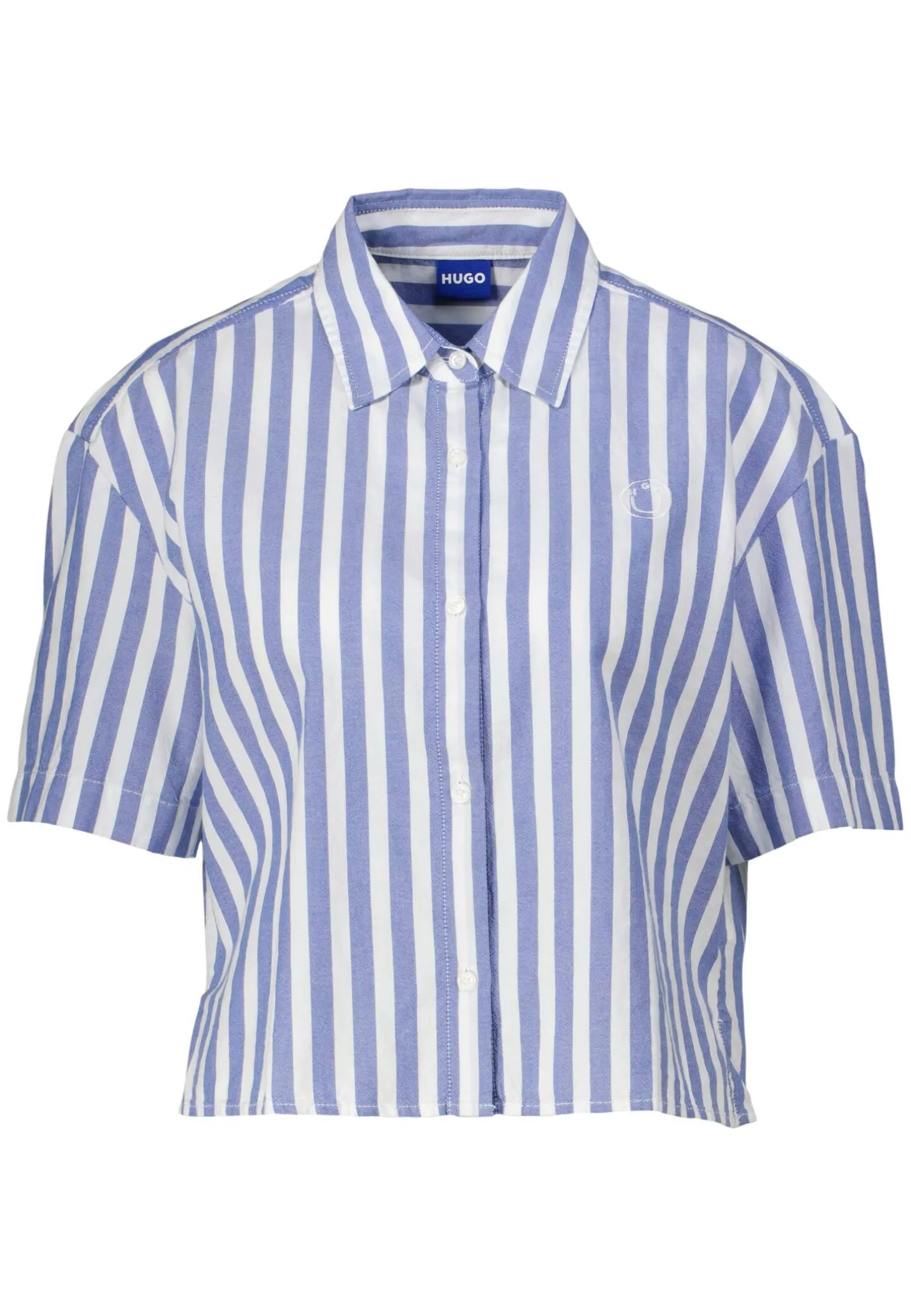 Die kurze Bluse in Boxy-Silhouette von HUGO verleiht deinem Sommer-Outfit mit Längsstreifen maritimes Flair.