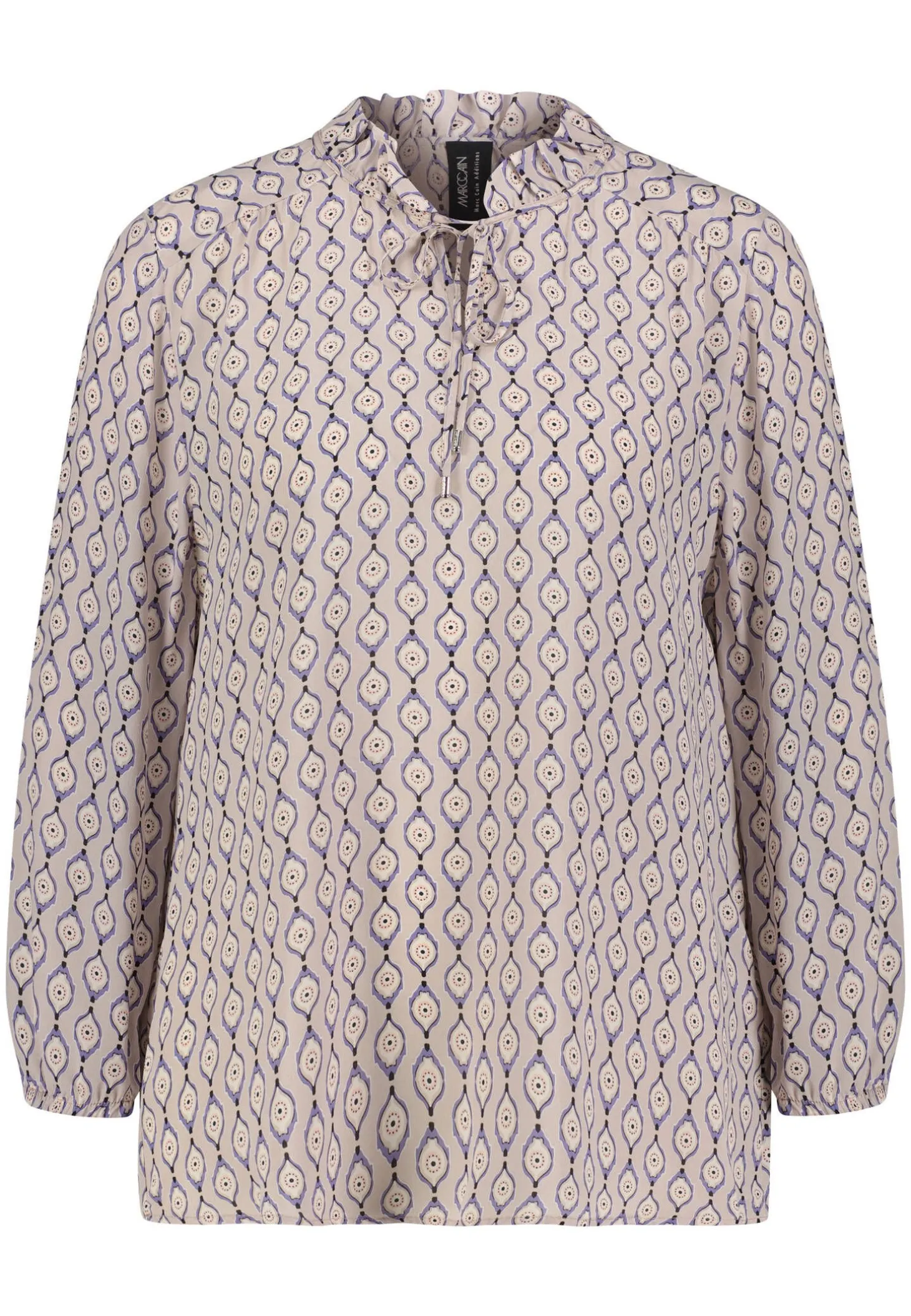 Mit ihrer entspannten Passform und dem stilvollen Schlüsselloch-Ausschnitt bringt die Damenbluse von Marc Cain feminine Eleganz zum Ausdruck. Der fein geraffte Stehkragen setzt einen charmanten, verspielten Akzent und rundet das Design harmonisch ab.