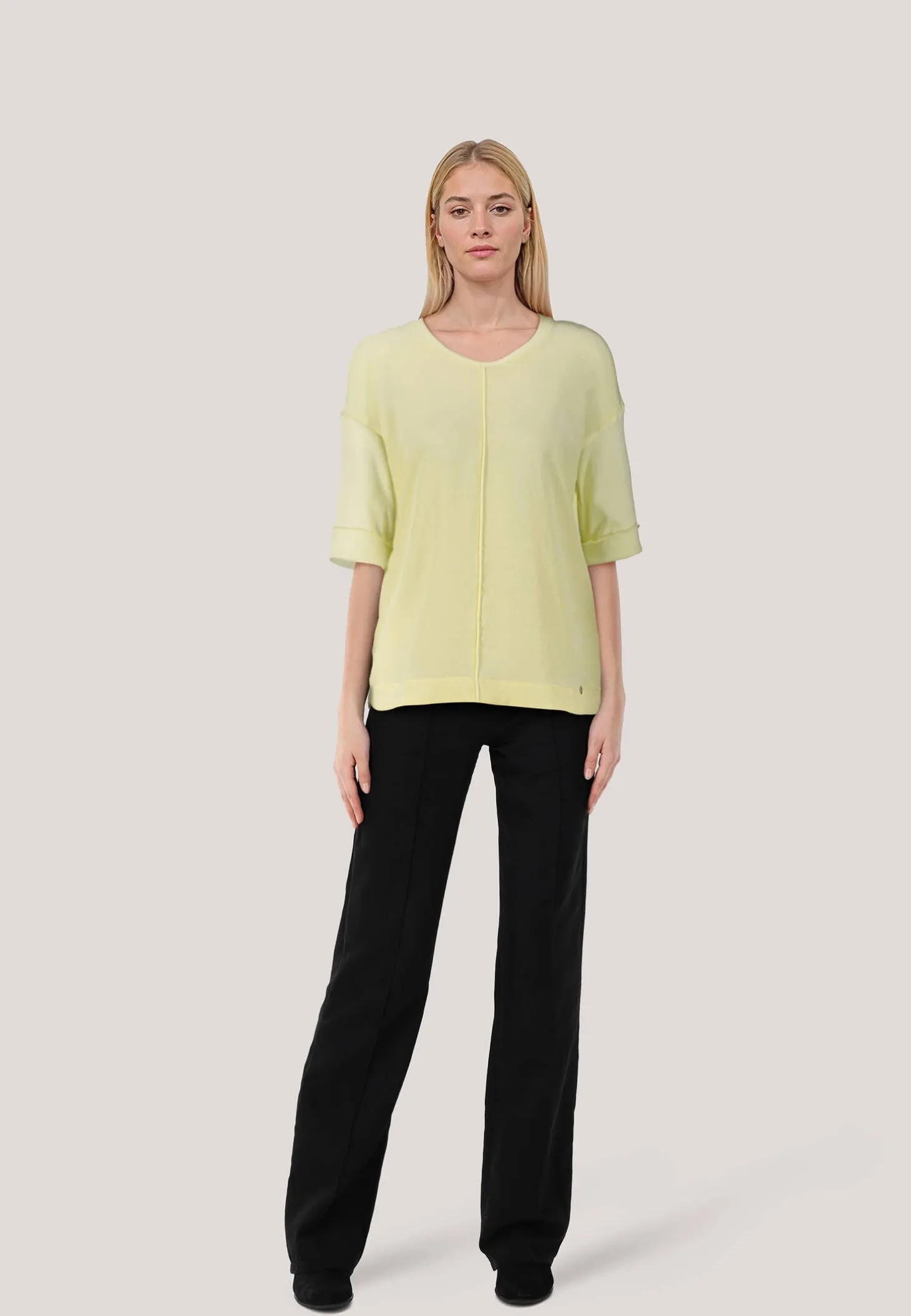 Bluse mit überschnittener Schulter und A-Shape. Das Modell hat zwei Seiten: Das Vorderteil ist aus weich fließendem Gewebe, Ärmel und Rückenteil sind aus stretchigem Cotton-Ripp. Die Front ziert ein Passepoile. Minimalistisches Design mit großer Wirkung.