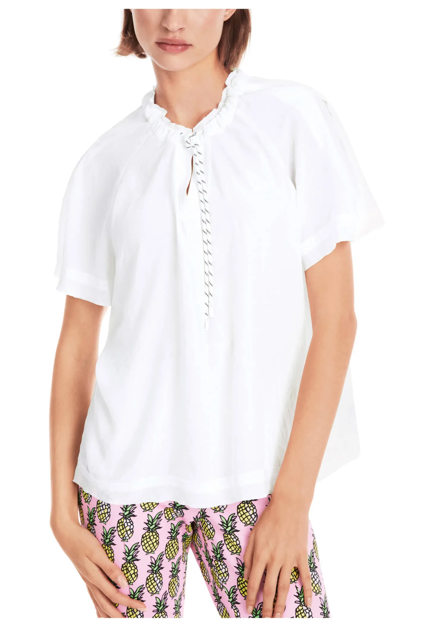 Lässiges Blusenshirt von Marc Cain Sports. Blusenshirt in einer Kombination aus reinem Baumwollstretch im Rücken und leichtem Parachute-Material im Vorderteil. Ein sportiv lässiger Schnitt kennzeichnet den Stil dieser Bluse. Sie hat eine weite Silhouette. Die kurzen Ärmel zeigen sich in Raglanform. Der Ausschnitt kommt mit Schlitz und Kordel. Außergewöhnliche Details sind die aufgesetzten Saumstreifen im offenkantigen Design.