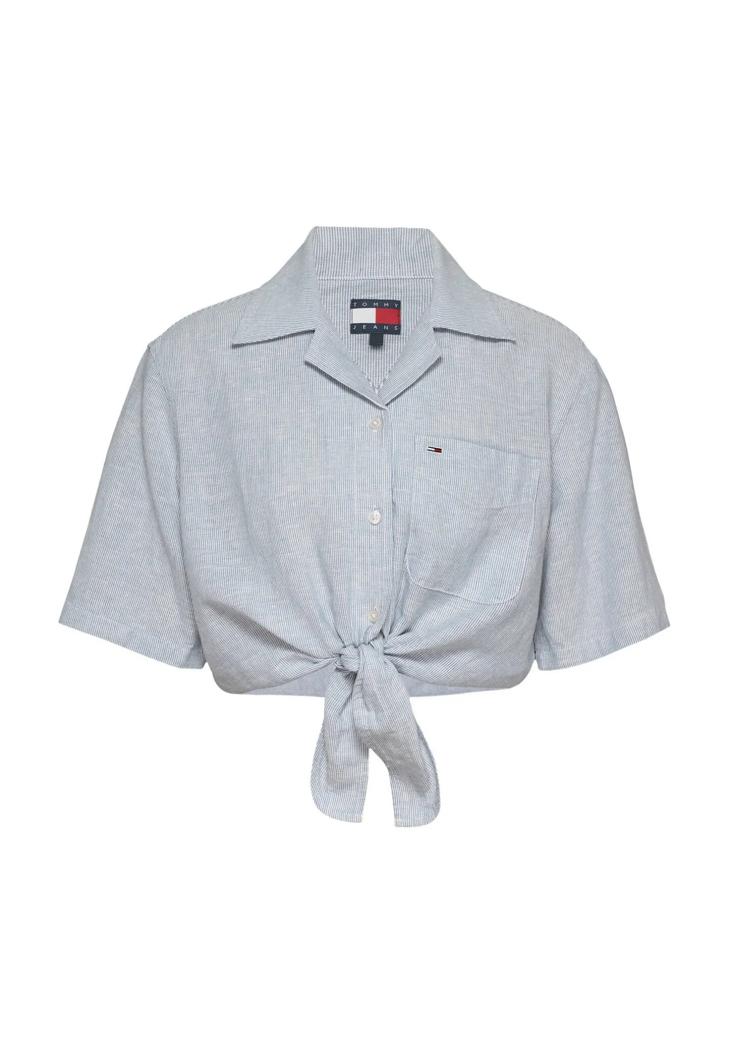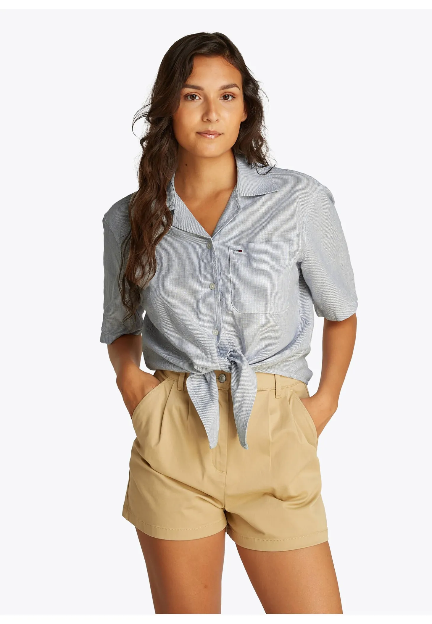 Die kurzärmlige Hemdbluse besticht mit ihrem luftigen Schnitt, der lässigen Knoten-Front und einem modernen, sommerlichen Look.