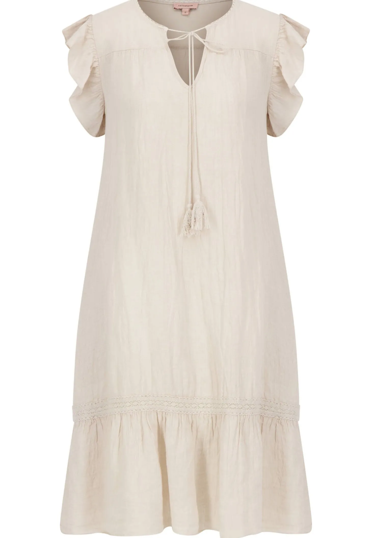 Das feminine Midikleid von Kate Storm verzaubert mit sommerlichem Design und hochwertigem Tragekomfort aus kühlendem Leinen. Spielerisch runden die gehäkelten Details das Gesamtbild ab.