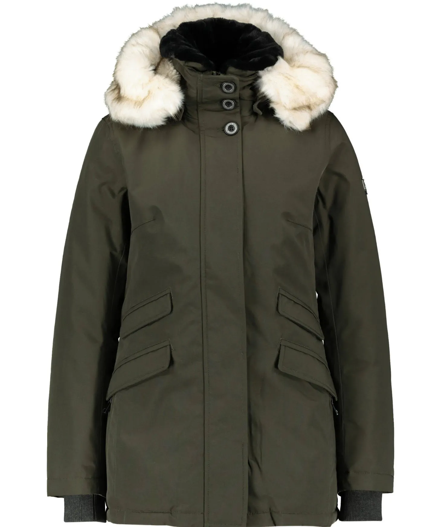 - abzippbare Kapuze mit abknöpfbarem Webpelzbesatz