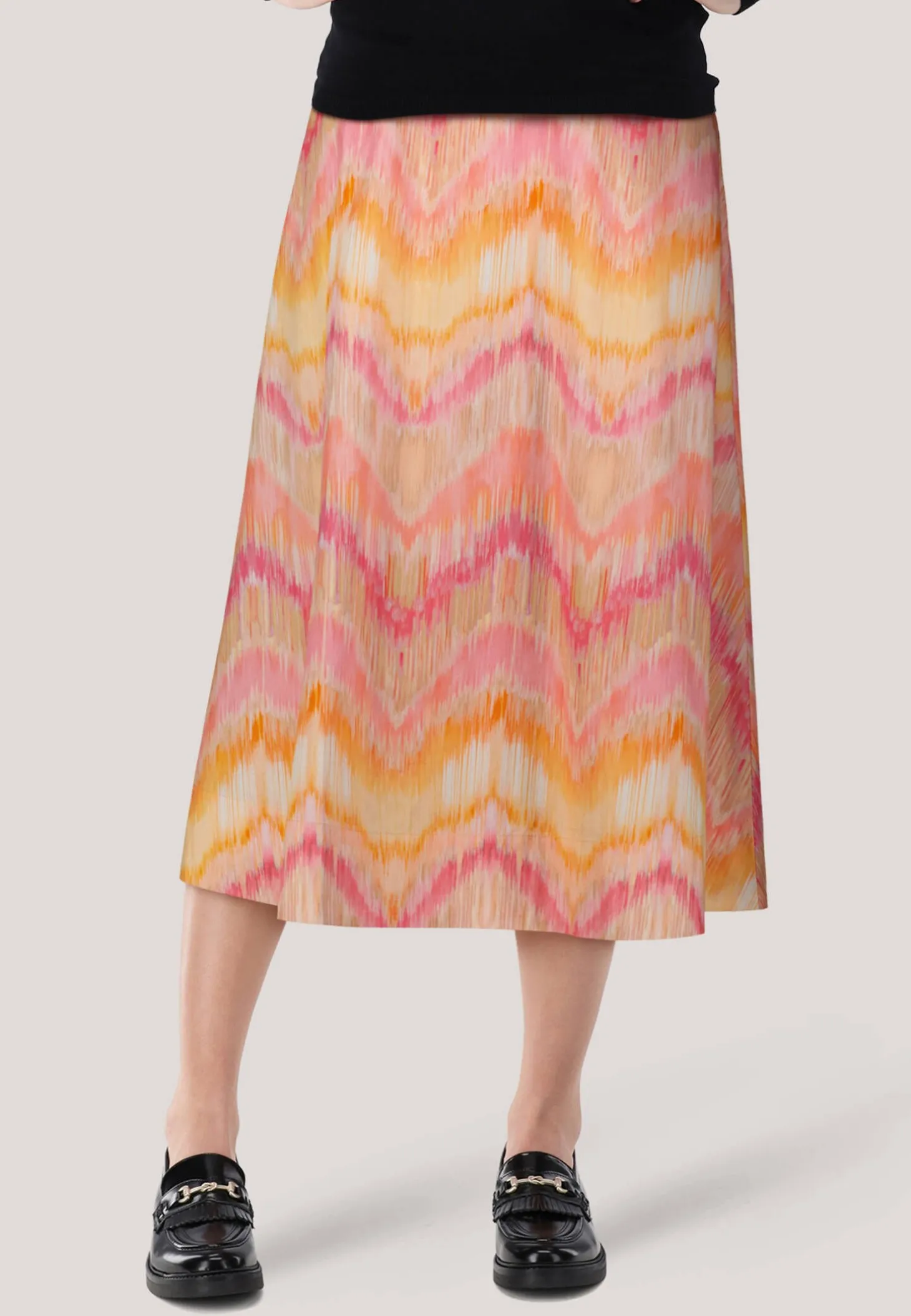 Der locker geschnittene Midirock von Kate Storm lädt mit sonnigem Allover-Druck zum Sommer-Spaziergang ein.
