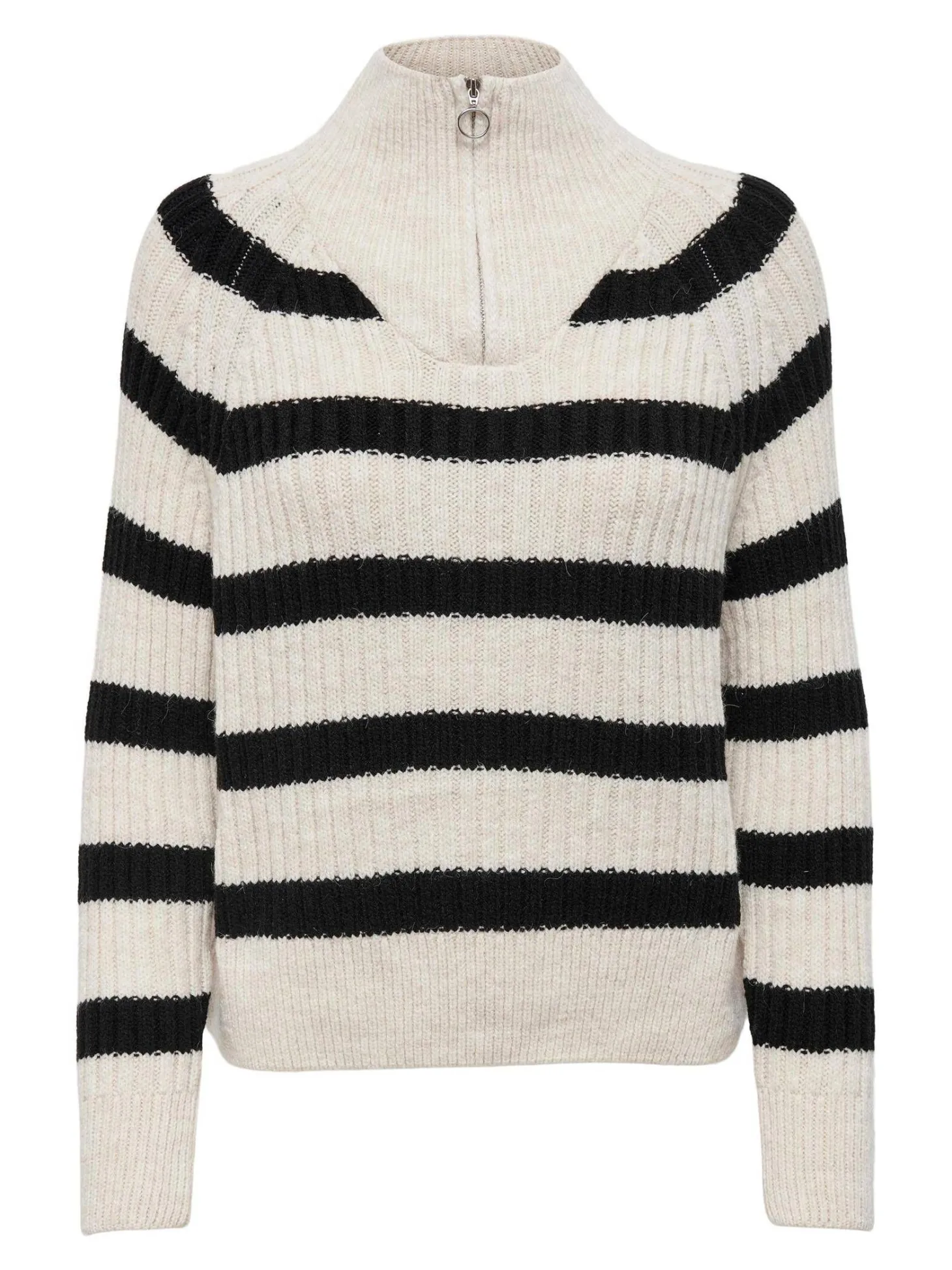 Lässig, unkompliziert und perfekt für jeden Tag: Der gestreifte Pullover Freya von Only mit hohem Stehkragen und kurzem Reißverschluss.