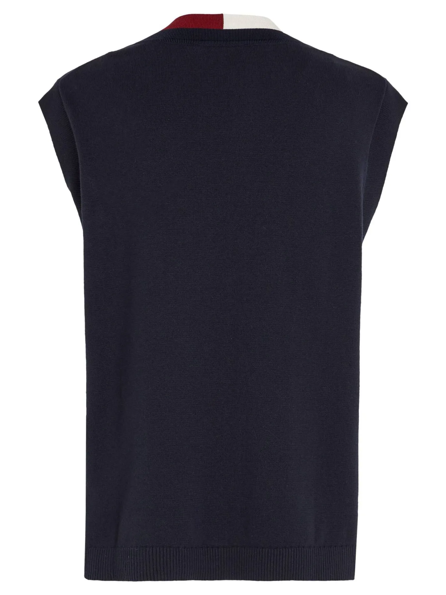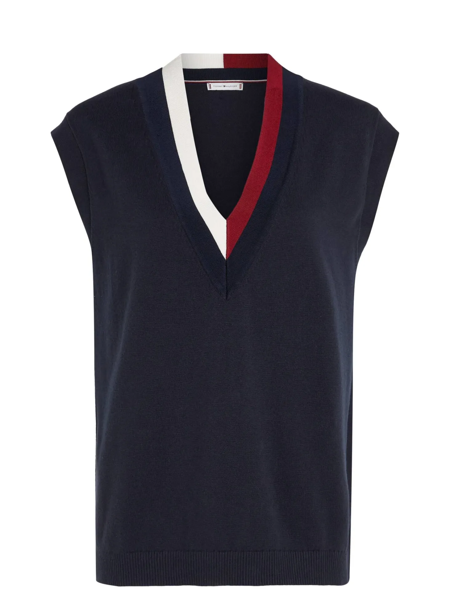 Leger geschnittener Pullunder von Tommy Hilfiger mit überschnittenen Schultern und akzentuierendem Streifendetail am V-Ausschnitt.