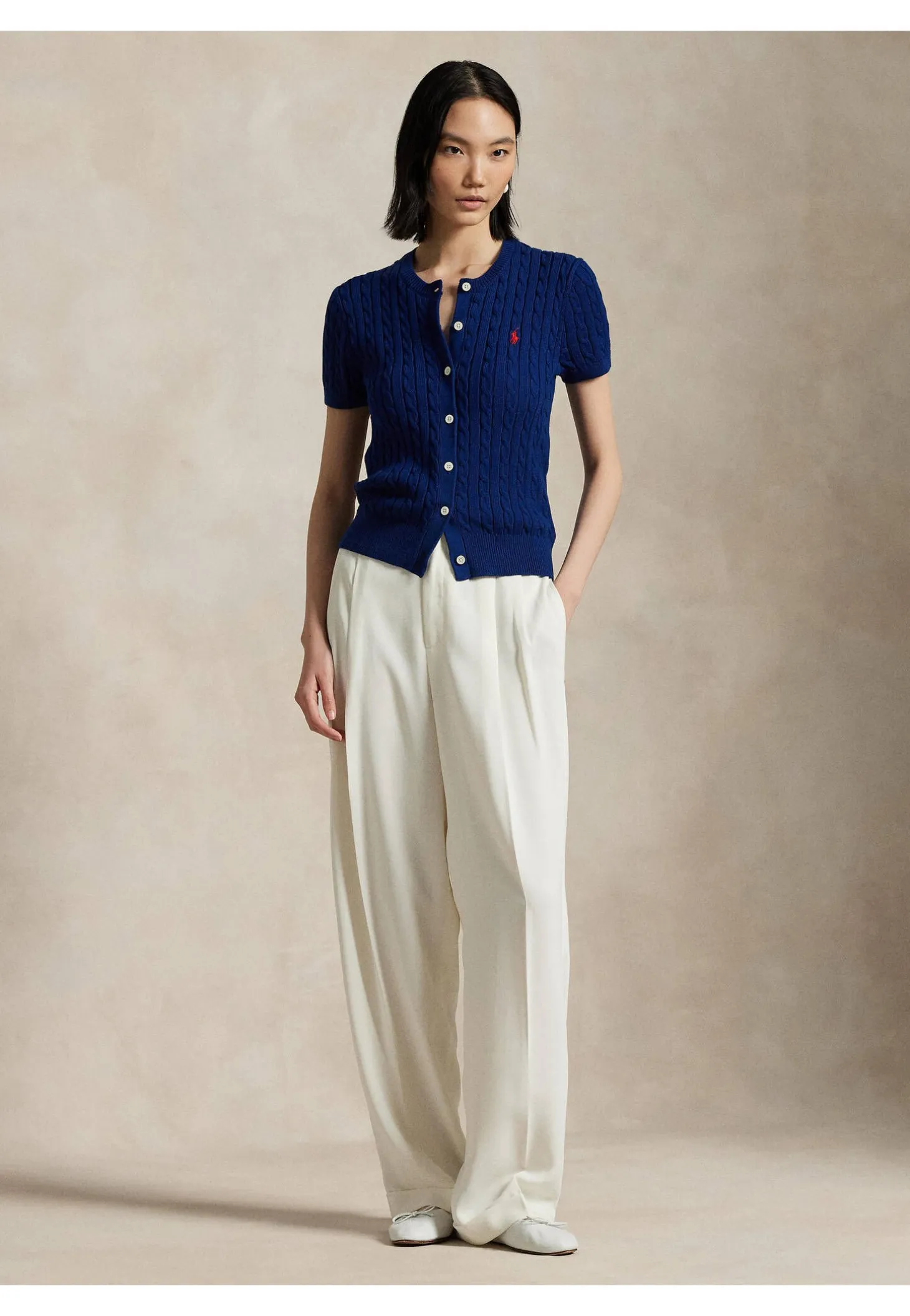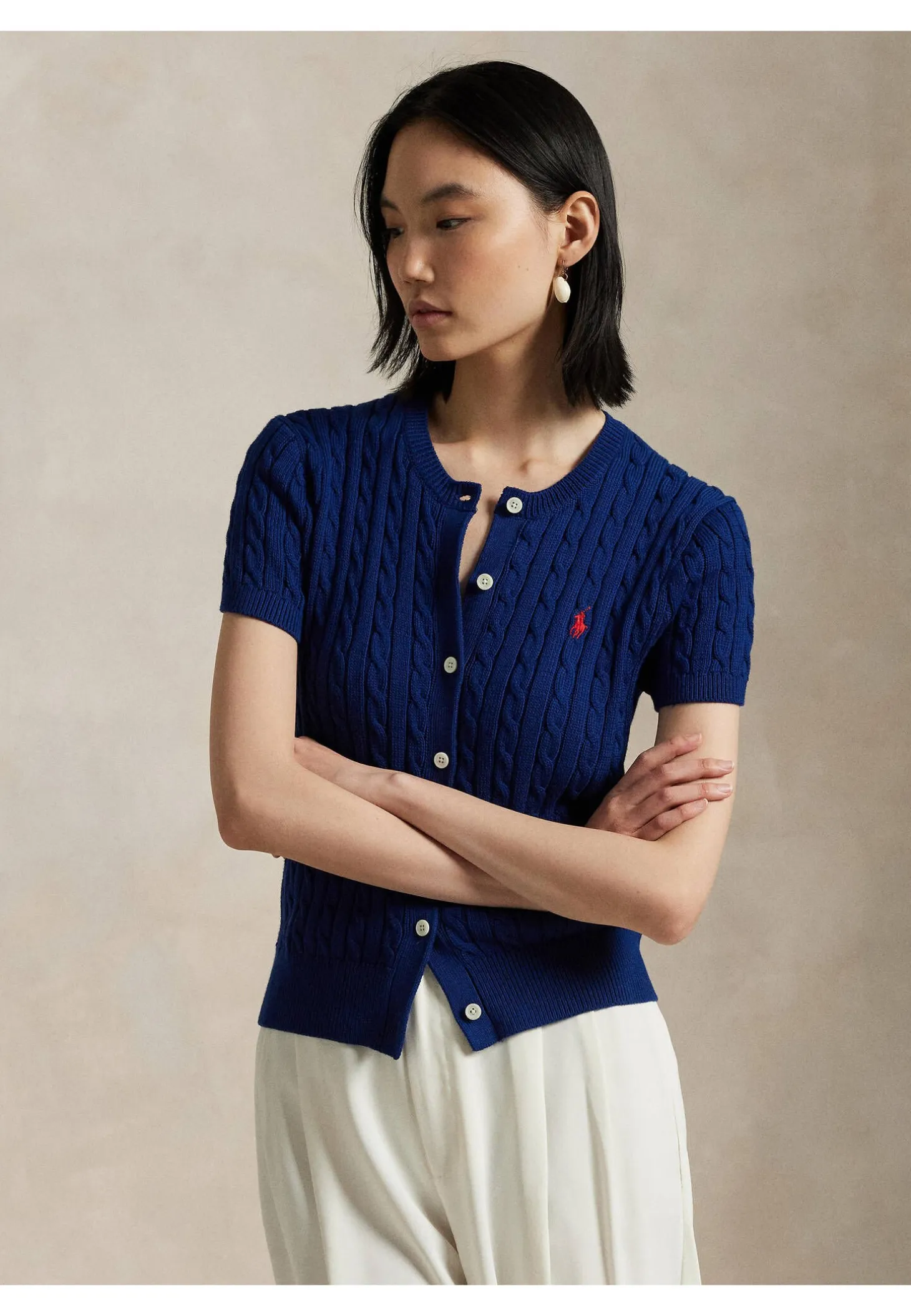 Die kurzärmelige Strickjacke von Polo Ralph Lauren kann entweder solo als Pullover oder im Twinset-Stil mit einem weiteren Strickoberteil getragen werden. Lezteres ergibt eine ganz besonders schicke Kombination für den Frühling!