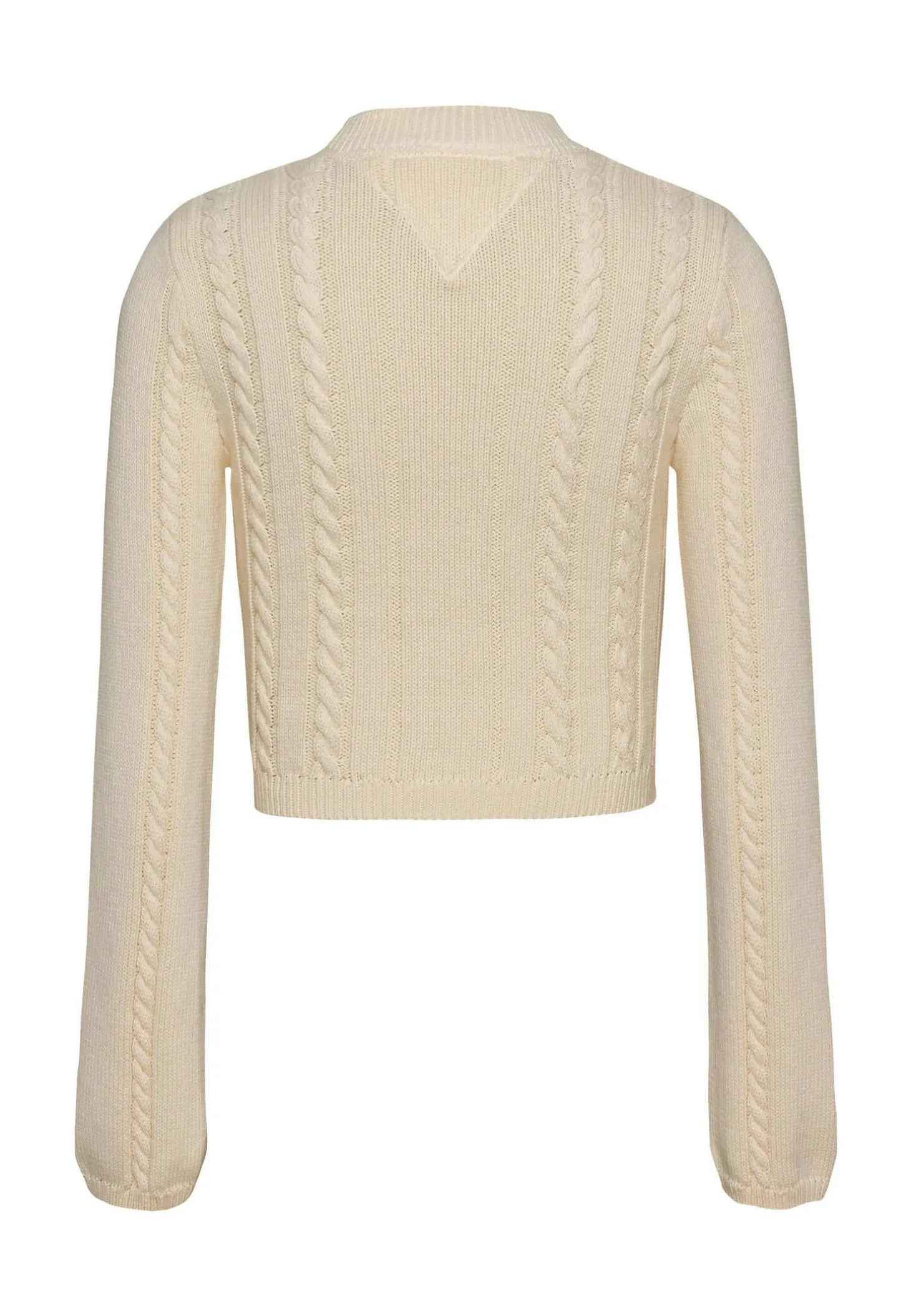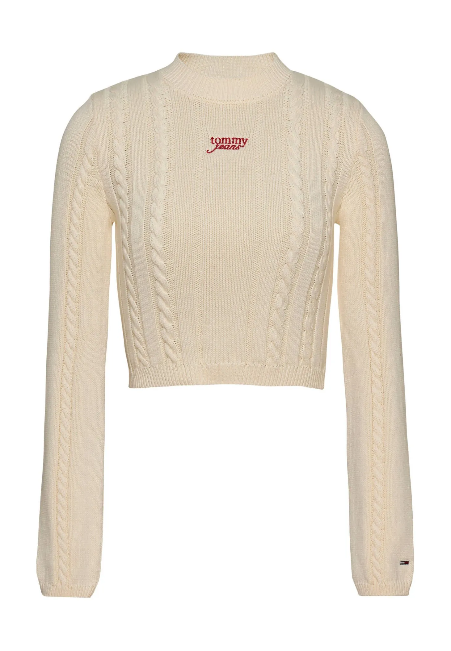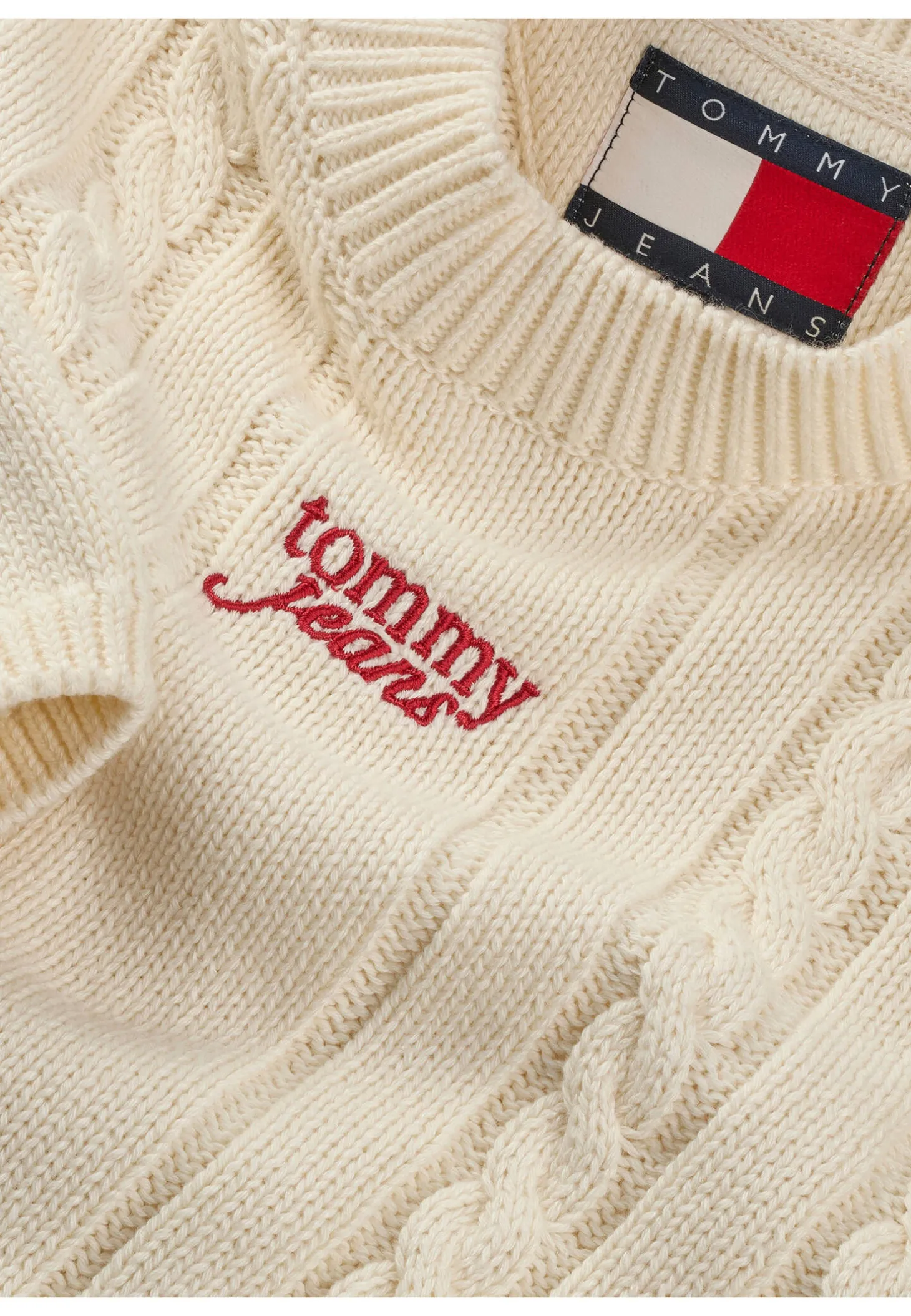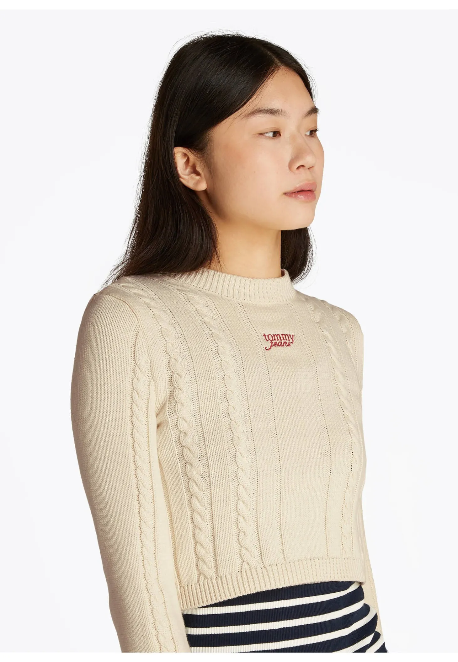 Der Cable Script Pullover von Tommy Jeans vereint stylische Cropped-Länge mit klassischem Zopfmuster und passt bestens zu High Waist Jeans.