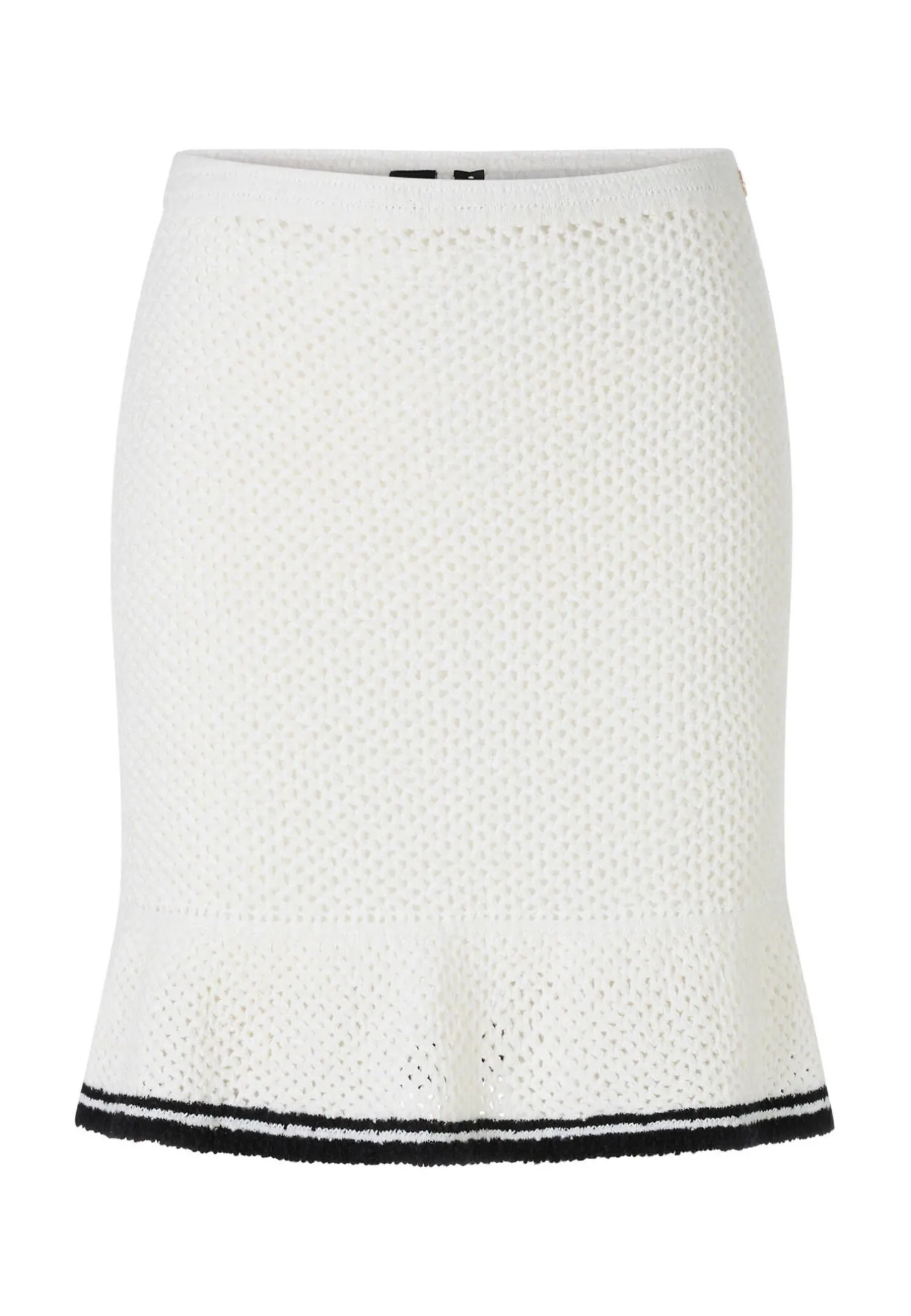 Minirock Knitted in Germany von Marc Cain. Ein verspielter Volant mit Kontrastfarben unterbricht die figurnahe Silhouette dieses stylischen Minirocks. Der Rock präsentiert ein strukturiertes Wabenmuster im Material-Mix mit Wolle und Baumwolle. Der Bund ist elastisch. Das Modell ist „Knitted in Germany“: Das Verstricken der Garne auf hochmodernen Strickmaschinen und die Veredelung der Stoffe geschehen am Standort Deutschland. Zusammengenäht werden die einzelnen Teile wie Ärmel, Vorderteil etc. in europäischen Partnerbetrieben.
