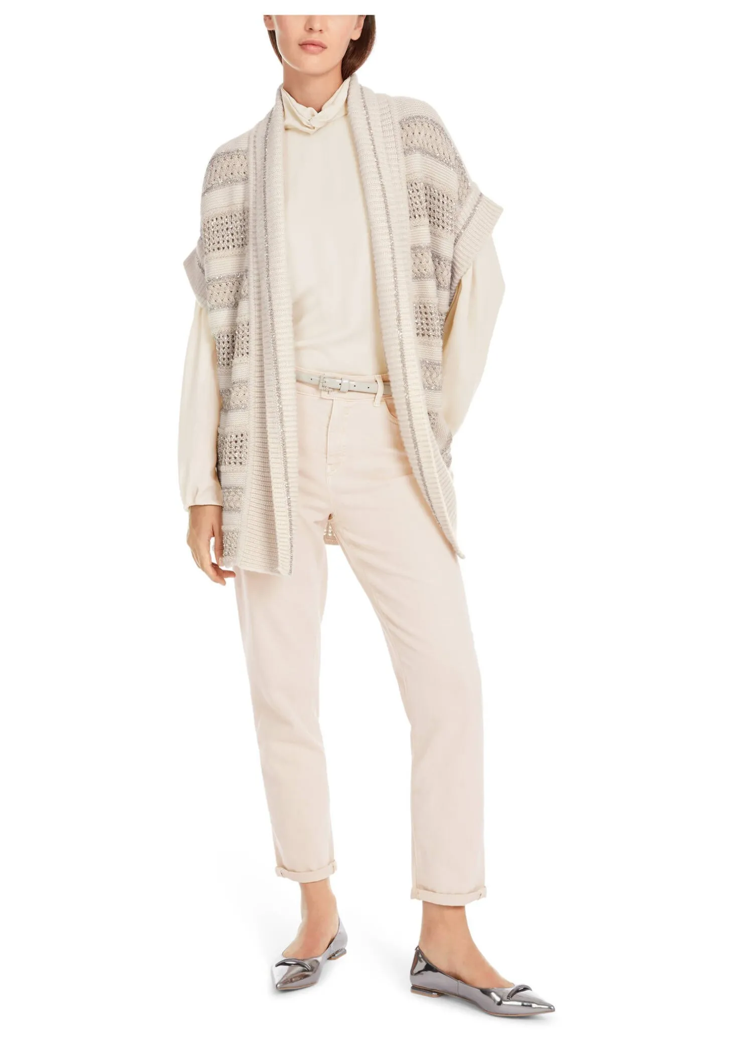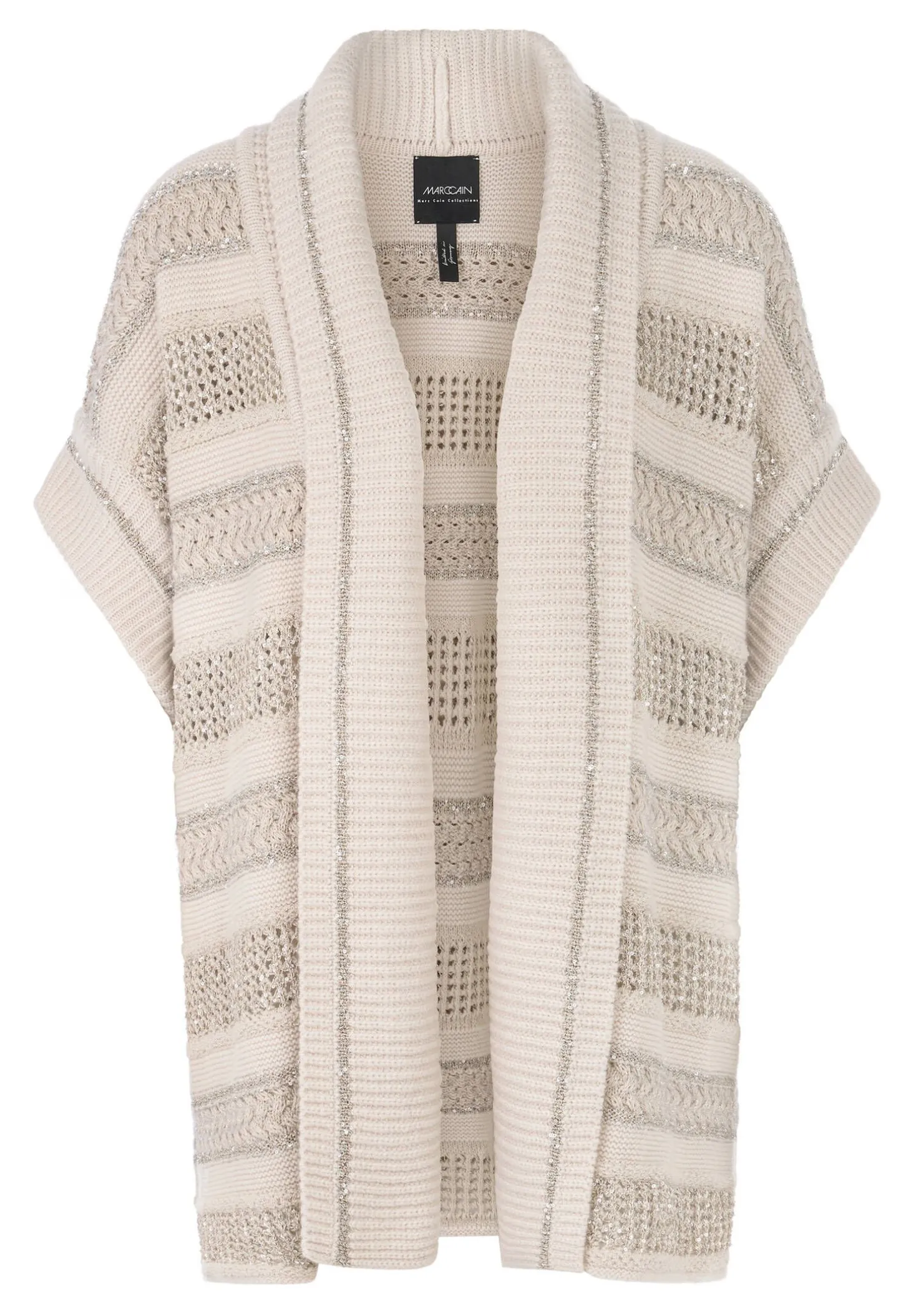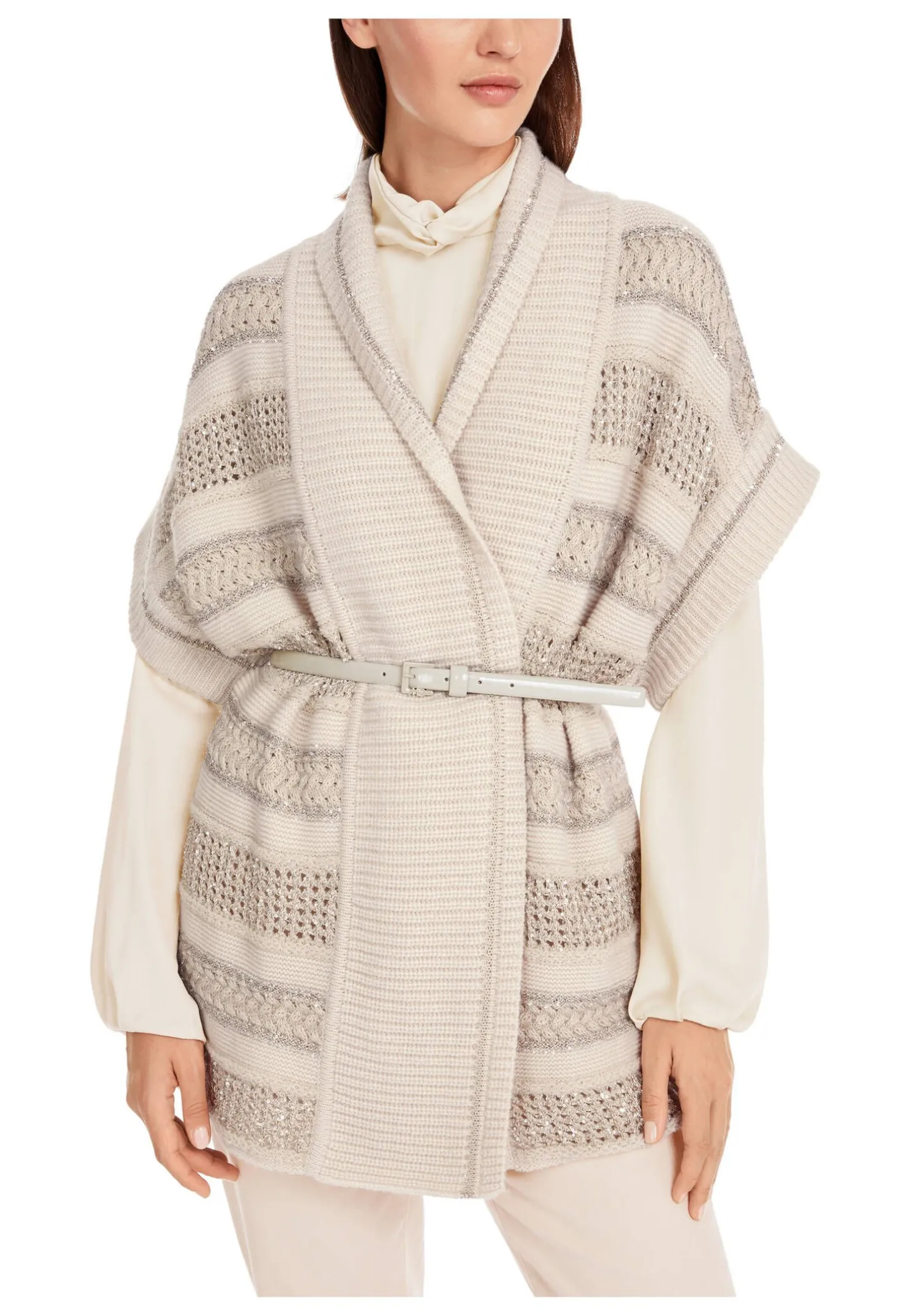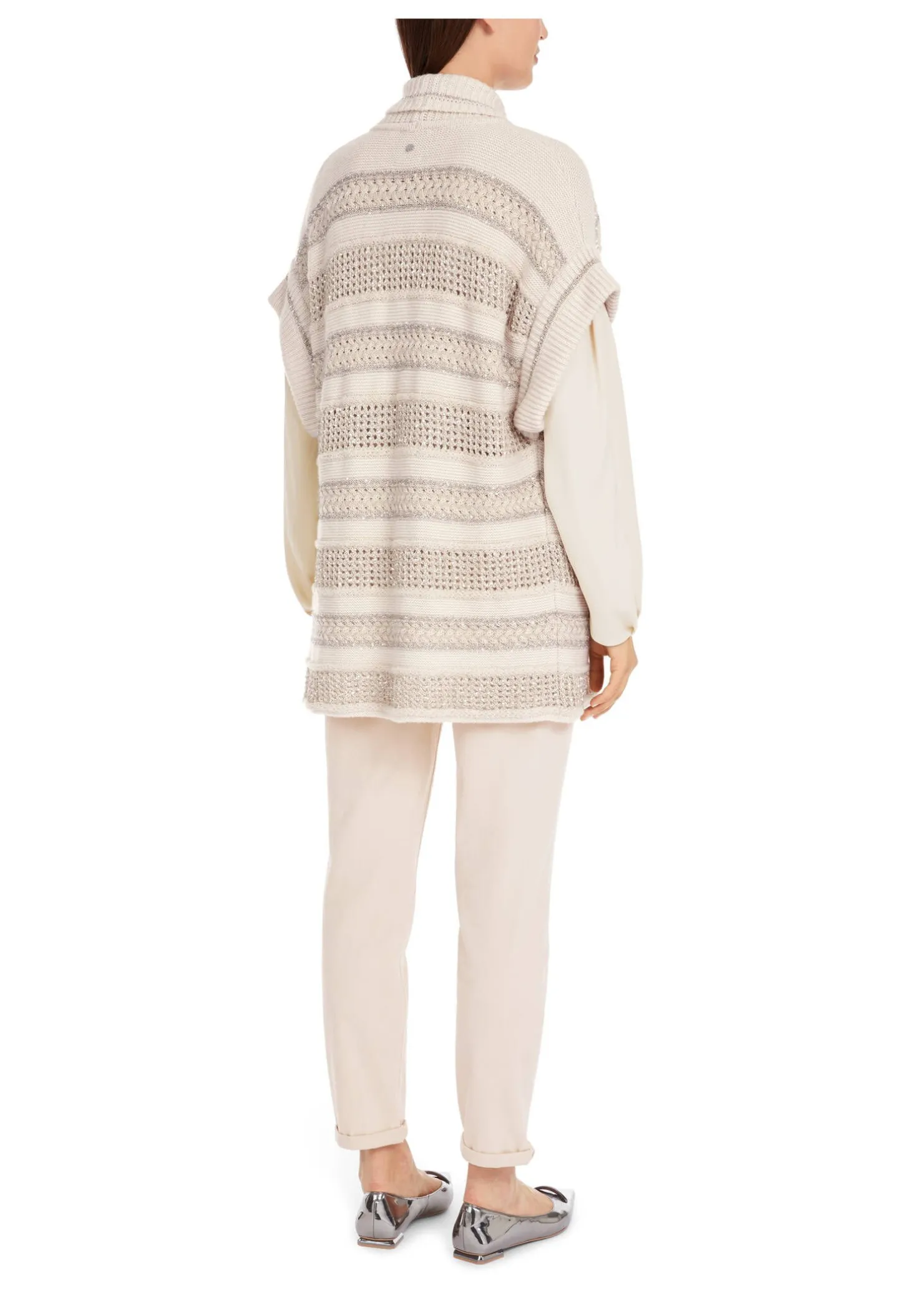 Mit ihrem langen Schnitt und Anteilen von Wolle, Kaschmir und Seide hält diese locker sitzende Weste den Rumpf schön warm. Blickfang ist das gestreifte Lochmuster mit Glanzgarn- und Pailletten-Details. Die Weste hat einen Schalkragen, ist verschlussfrei und besitzt weite Armausschnitte im gerippten Design. Sie wird am Standort Deutschland gestrickt und auch veredelt. Die Weiterverarbeitung der einzelnen Teile erfolgt in europäischen Partnerbetrieben. Damit ist das Modell „Knitted in Germany“.