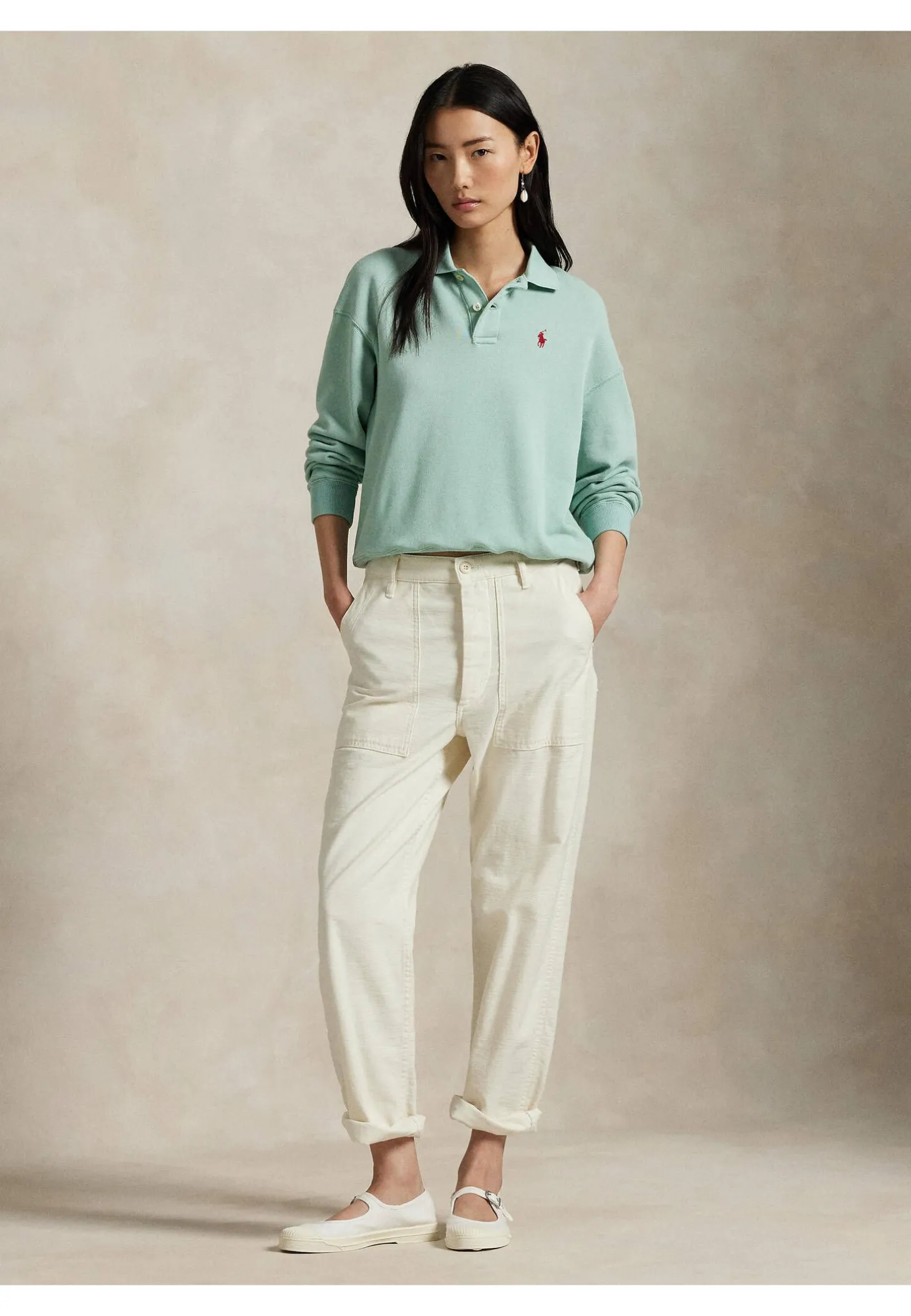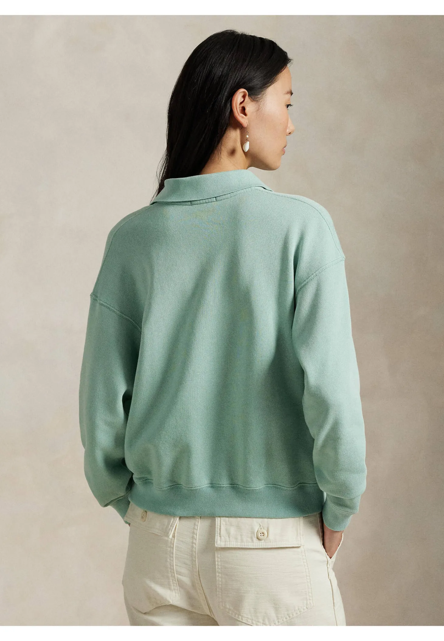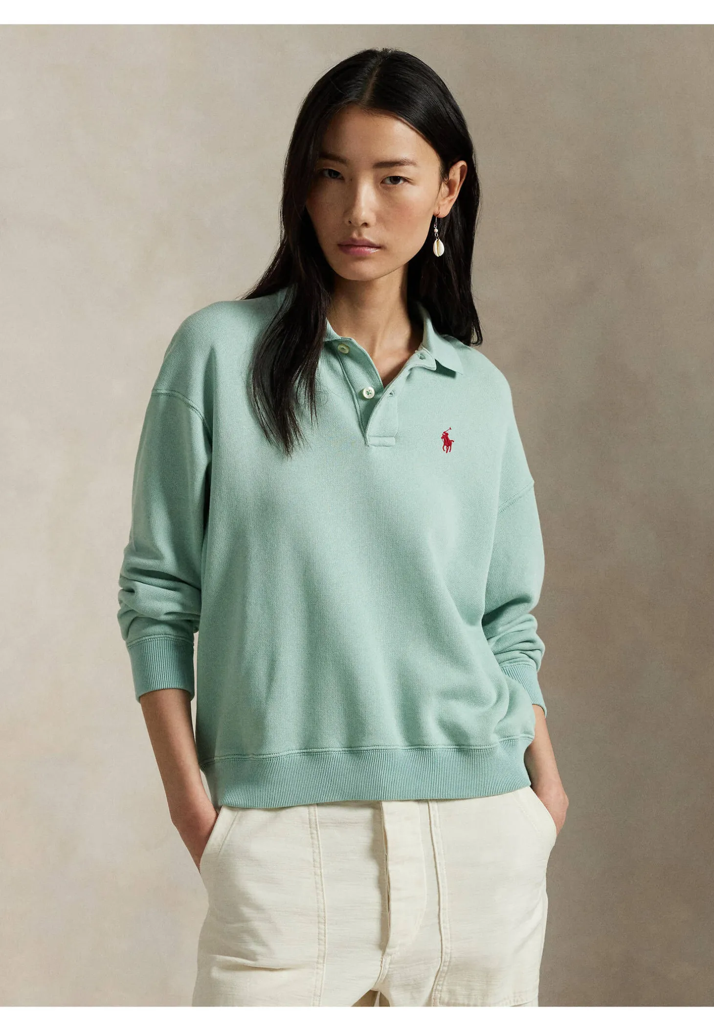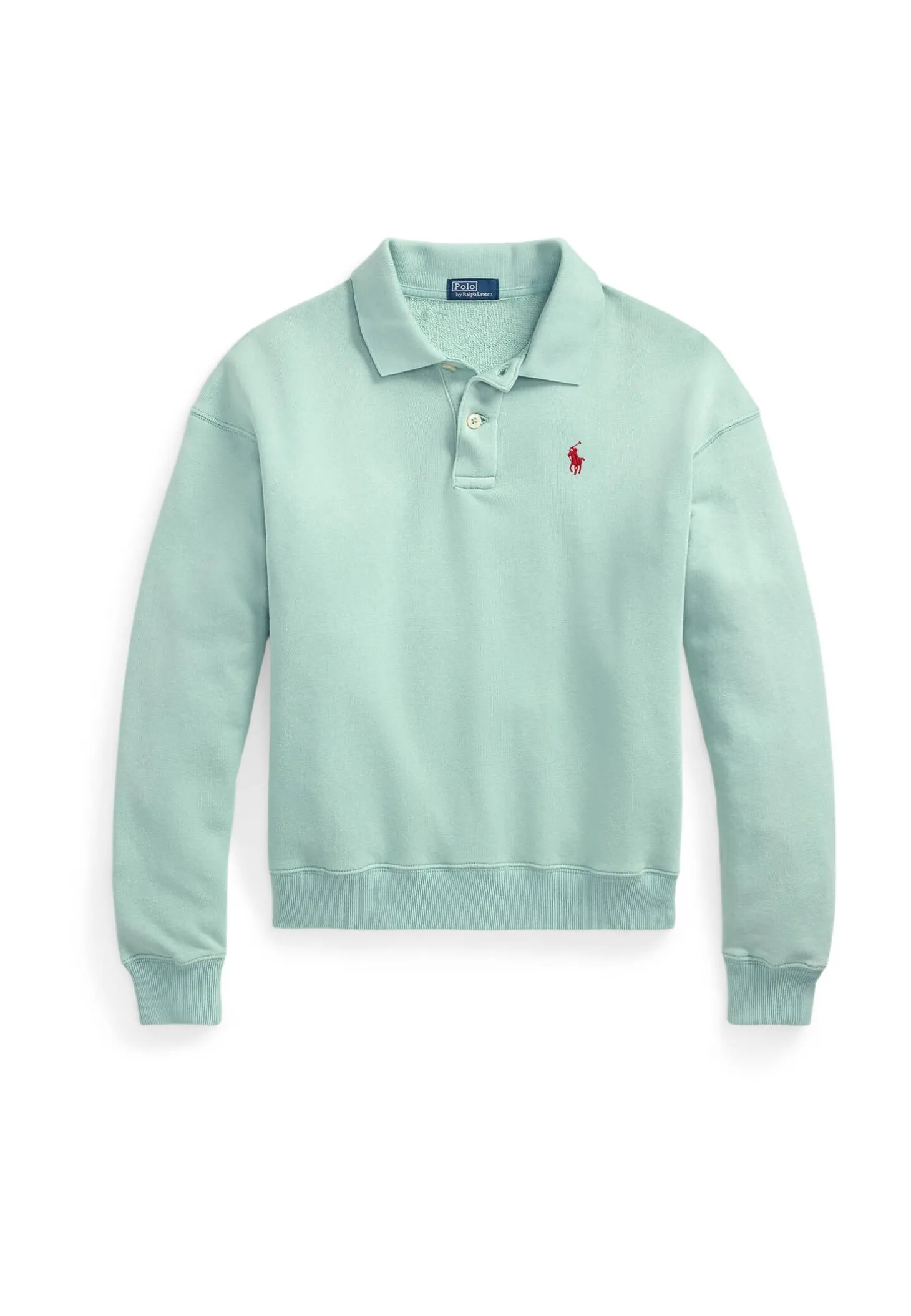 Das lässige, von dem legendären Poloshirt inspiriertes Sweatshirt präsentiert sich mit charakteristischen Details wie dem Flachstrickkragen, der Knopfleiste mit zwei Knöpfen und gestickten Pony.
