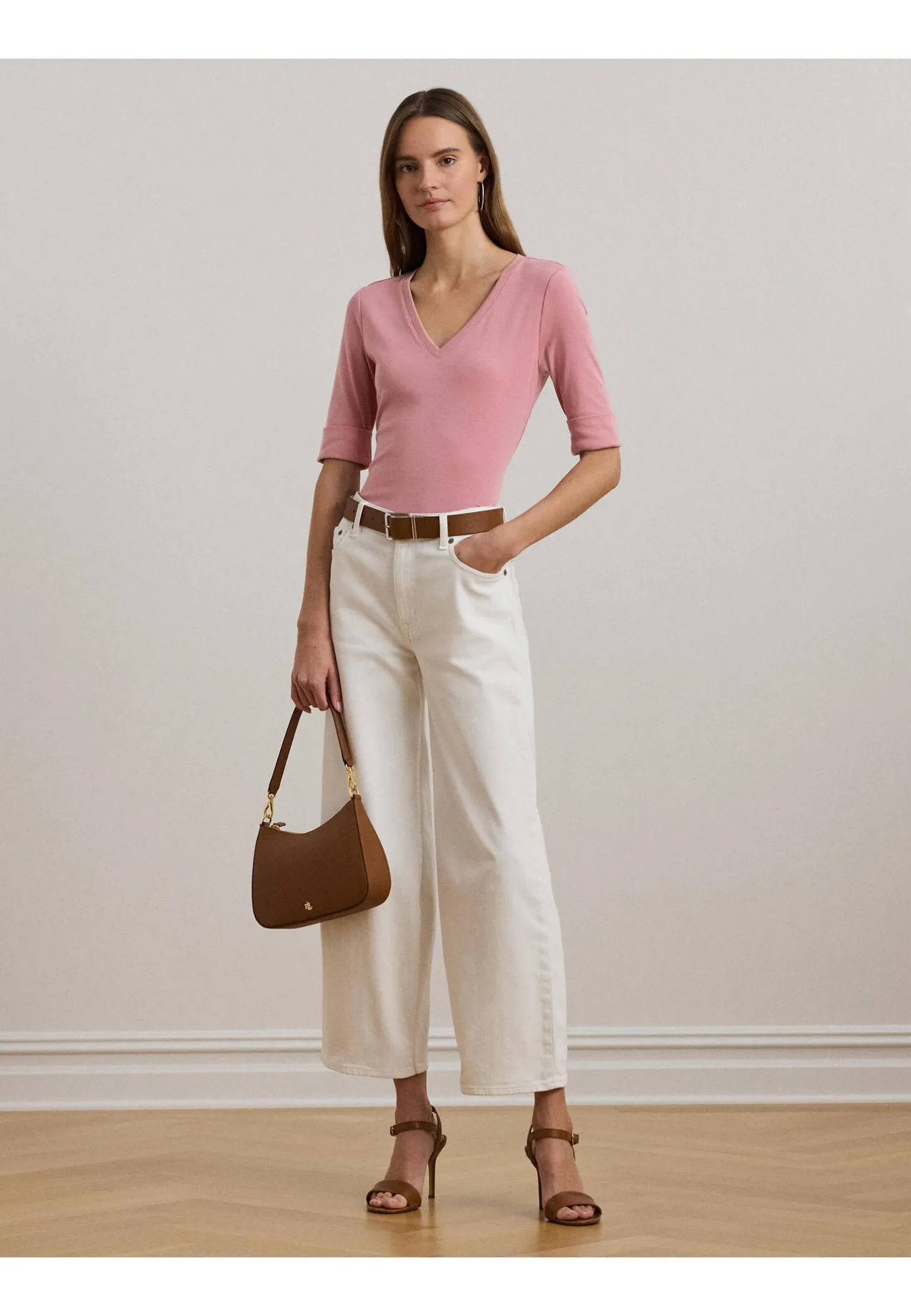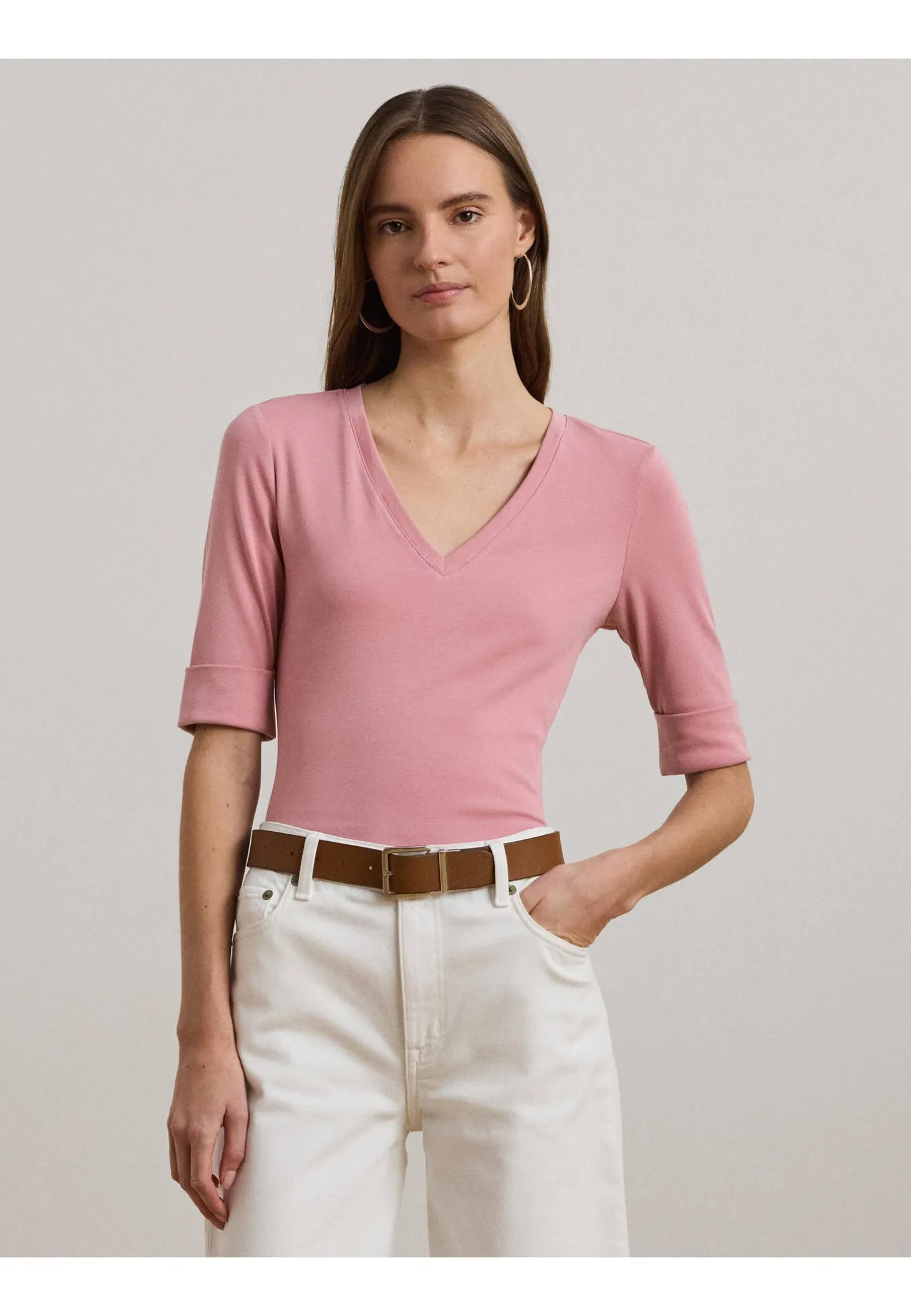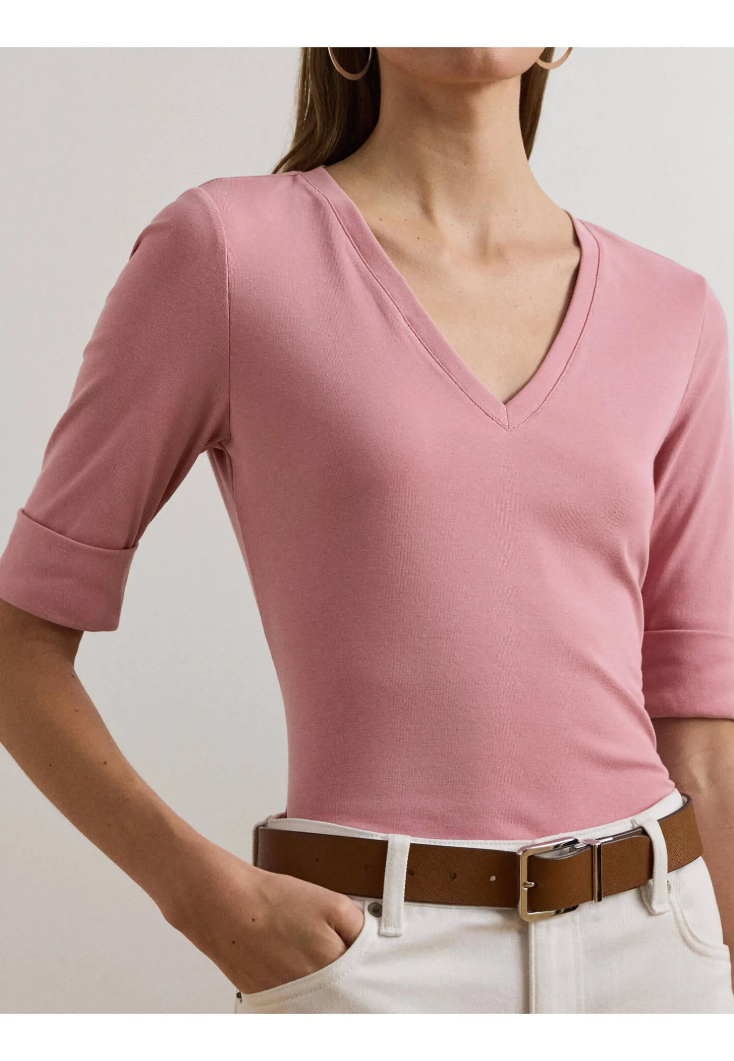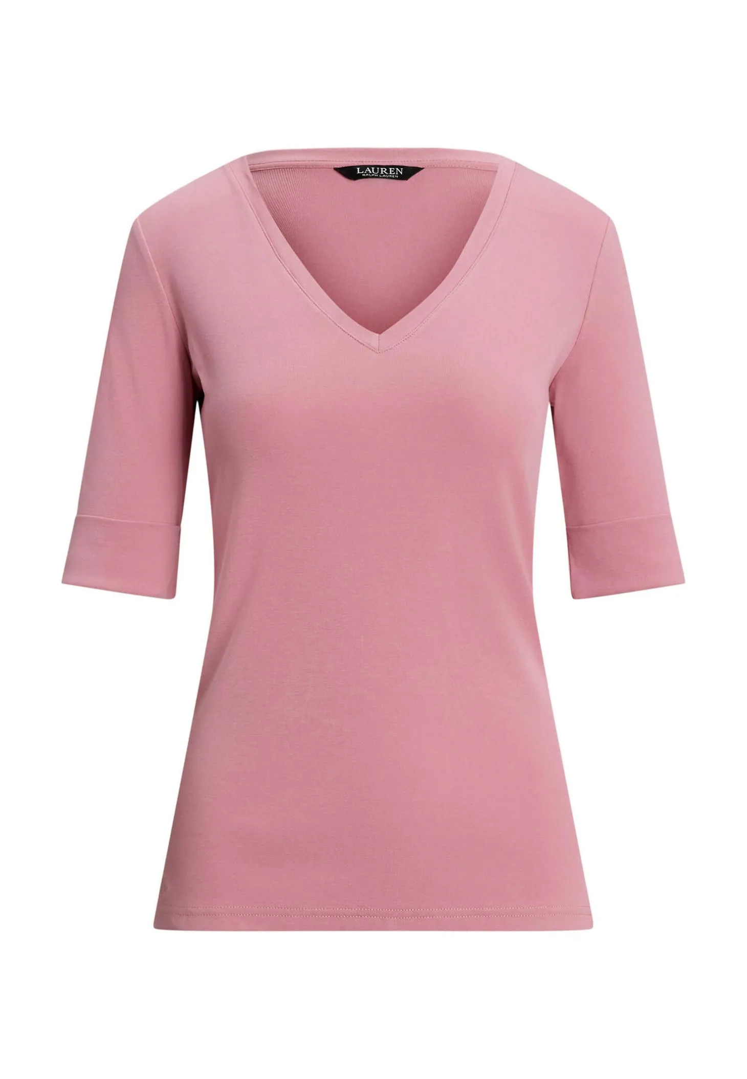 Dieses T-Shirt aus weichem, atmungsaktivem Baumwollstretch überzeugt mit einem klassischen V-Ausschnitt und halblangen Ärmeln – ein vielseitiges Basic mit zeitlosem Charme. Das charakteristische, gestickte Lauren-Logo am Saum setzt einen dezenten Markenakzent.
