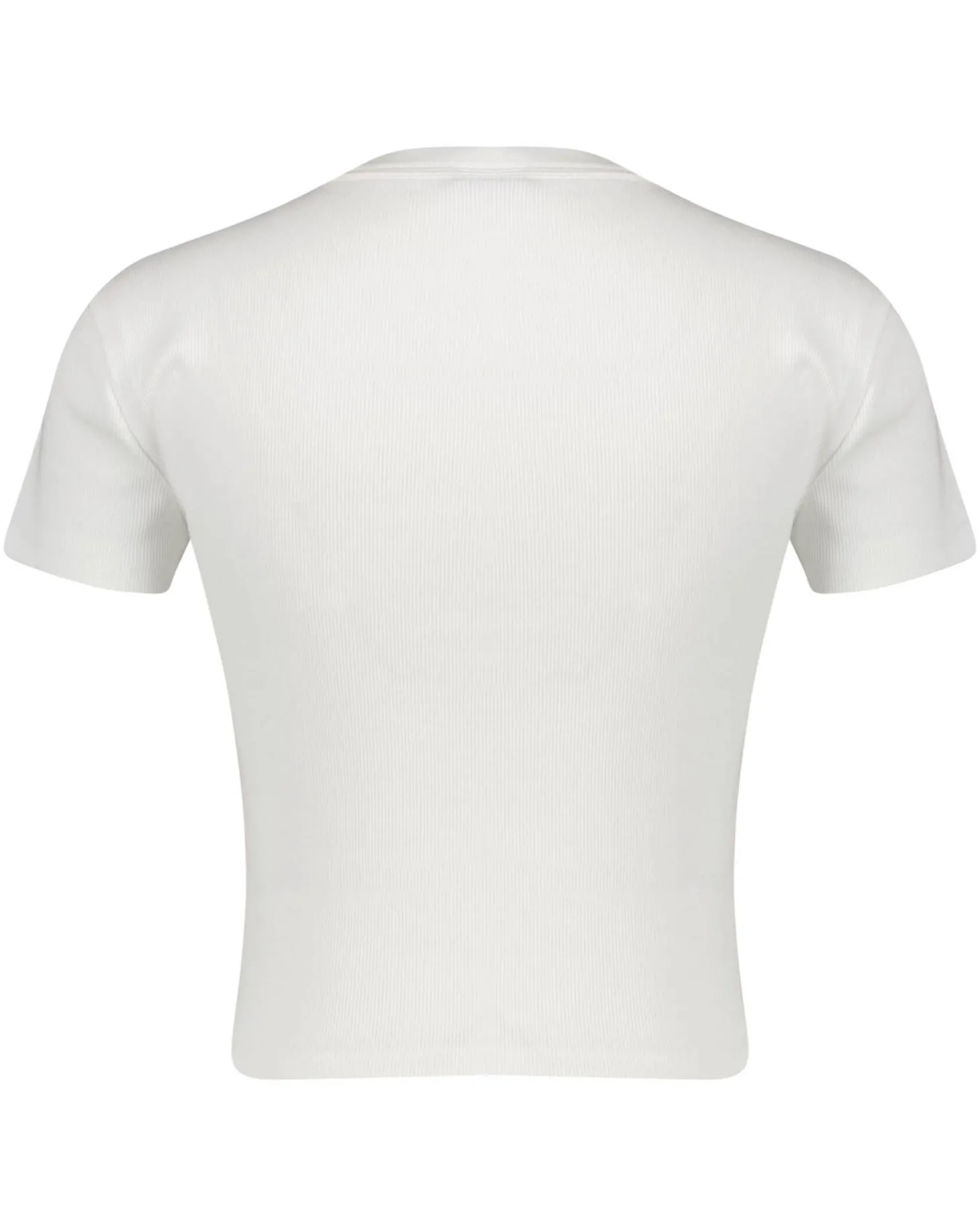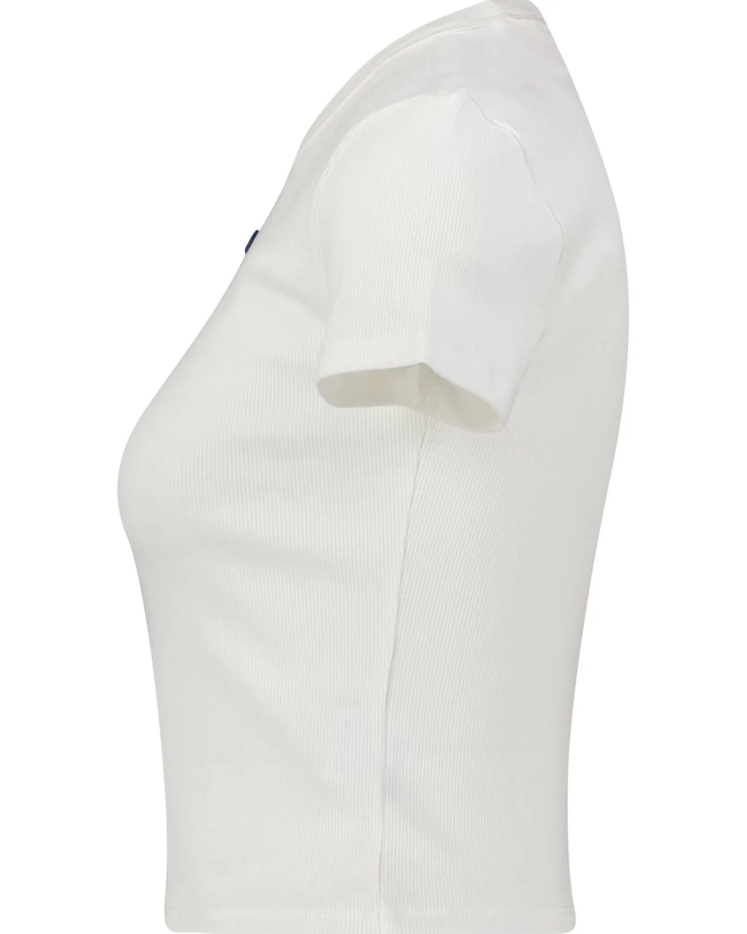 Das verkürzte schmale Shirt ist aus gerippter Stretch-Baumwolle hergestellt und verfügt über ein blaues Logo-Label.