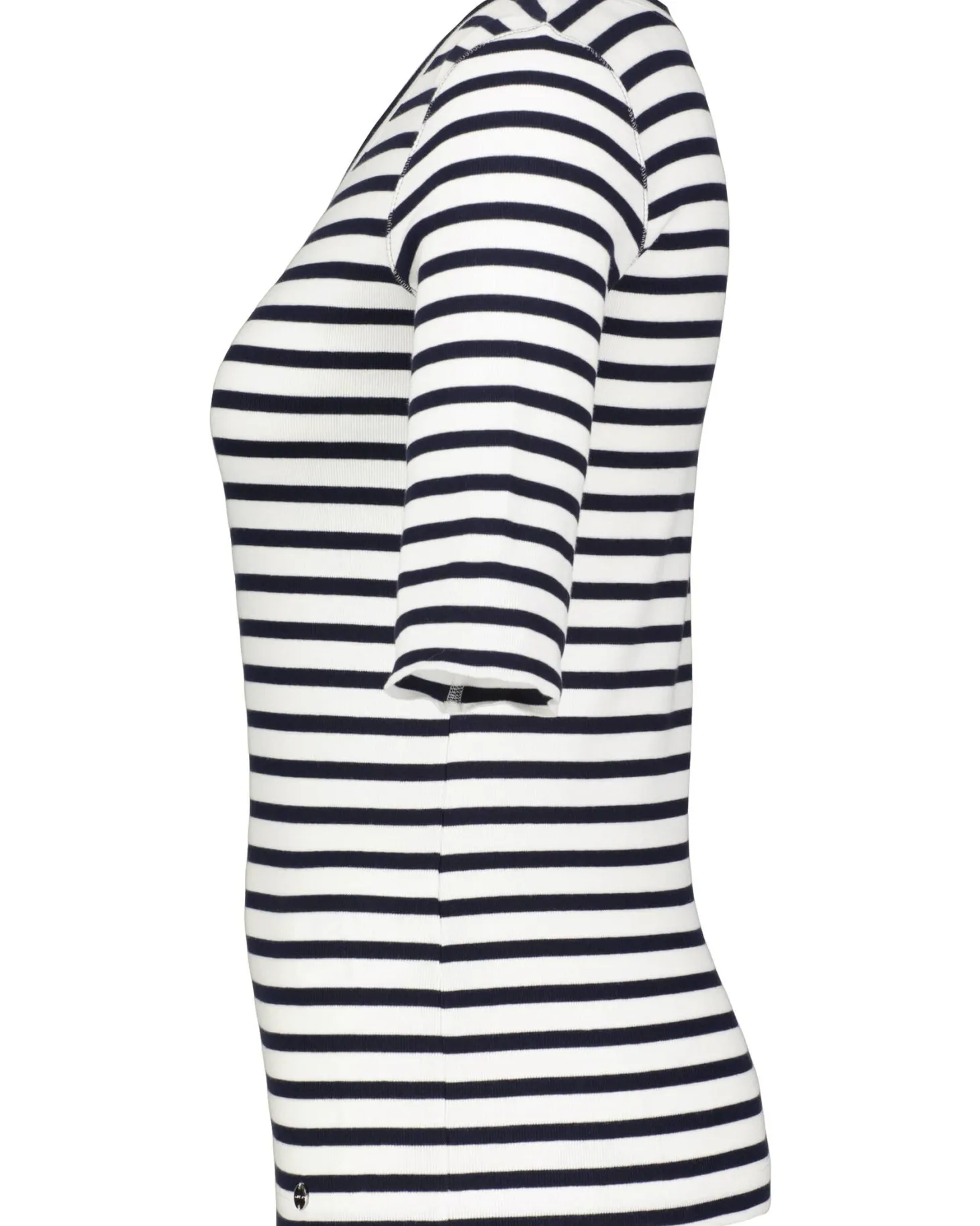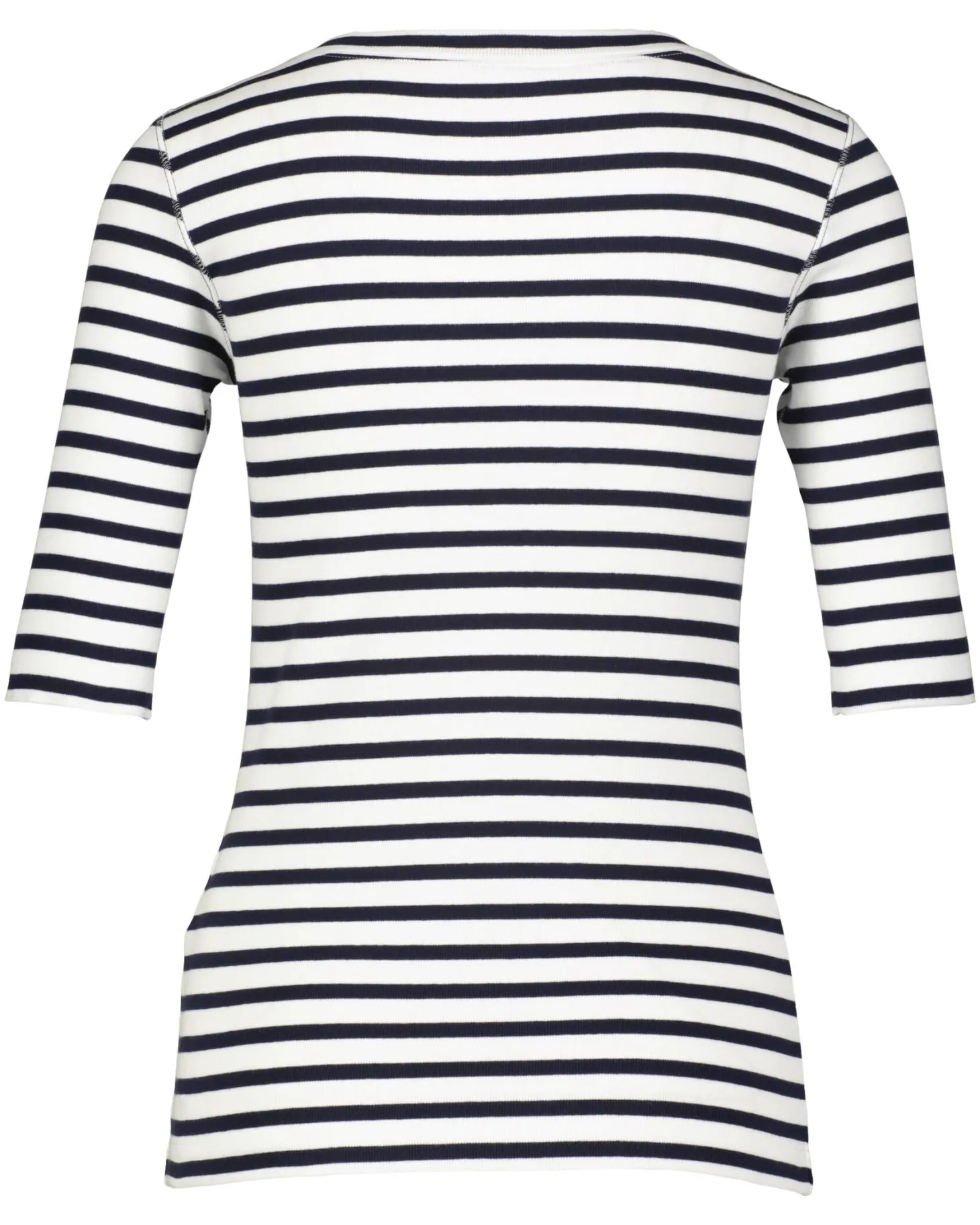 Schmal geschnittenes T-Shirt aus stretchigem Baumwoll-Ripp. Das Modell hat ein rundes Dekolletee und 3/4-Ärmel. Der Ringel ist allover. Ein toller Basic für sportive Looks.