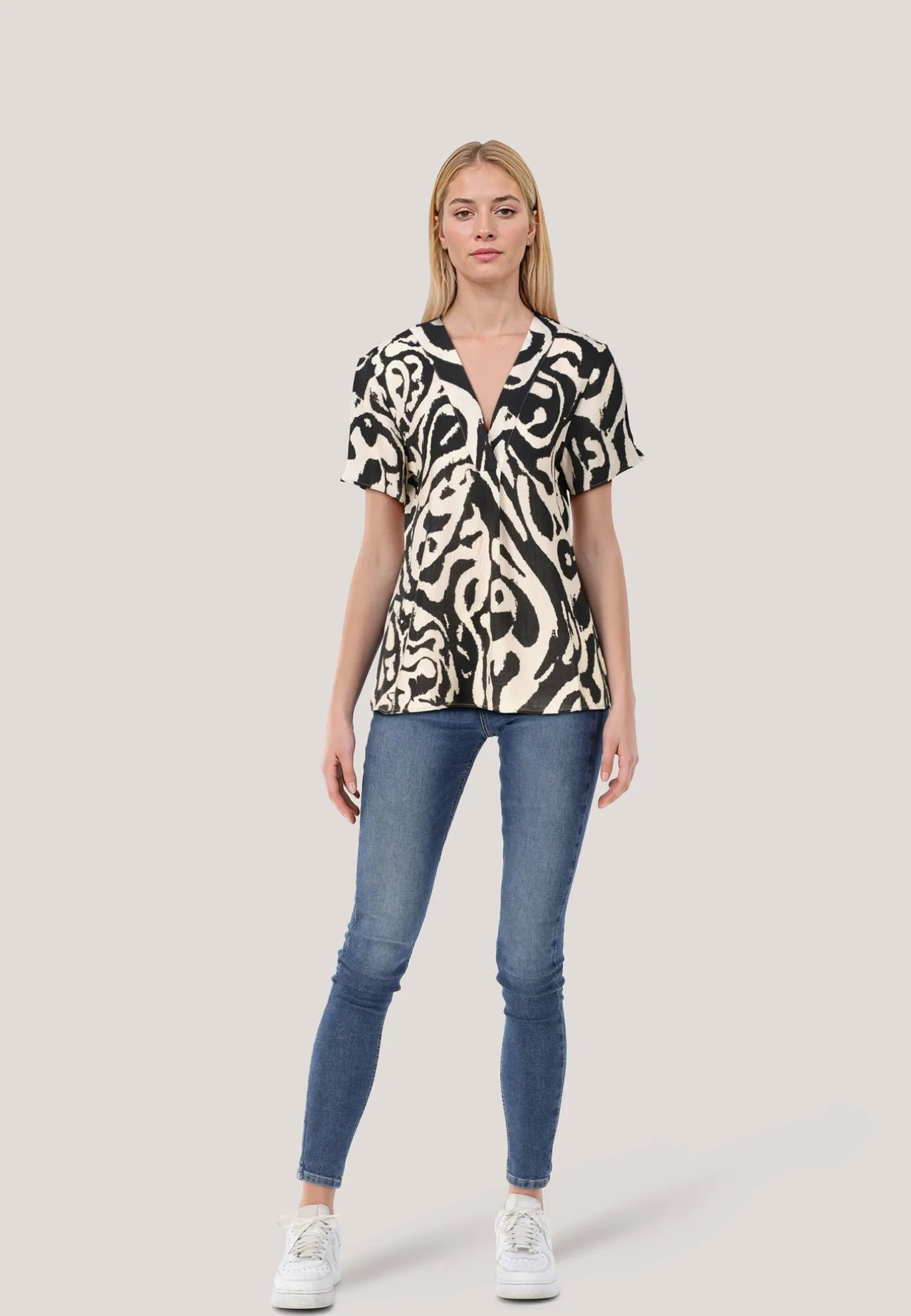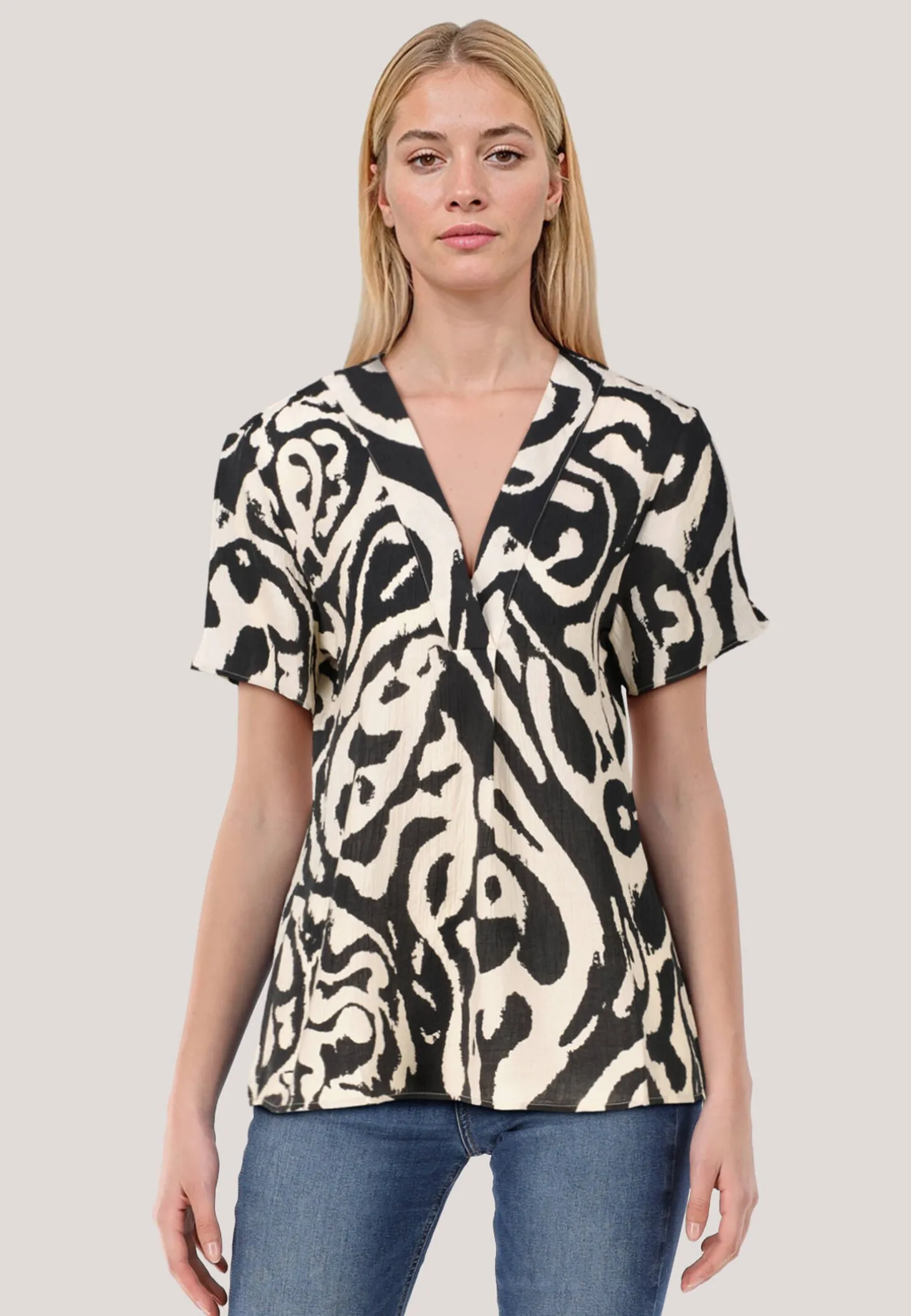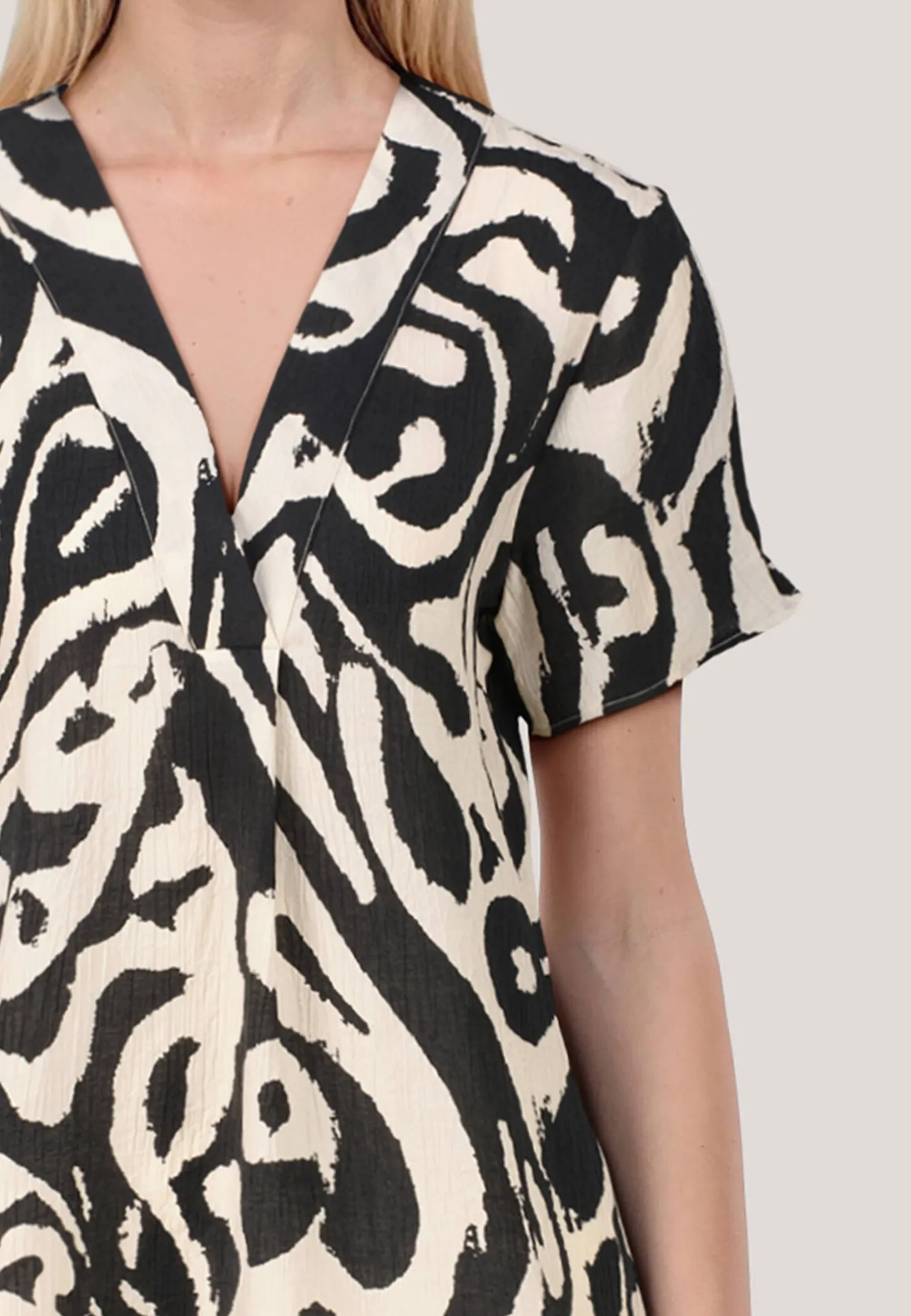 Diese Tunika-Bluse aus einem weich fließenden Viskose-Mix besticht durch ein charmantes Muster, kurze Ärmel und einem V-Ausschnitt.