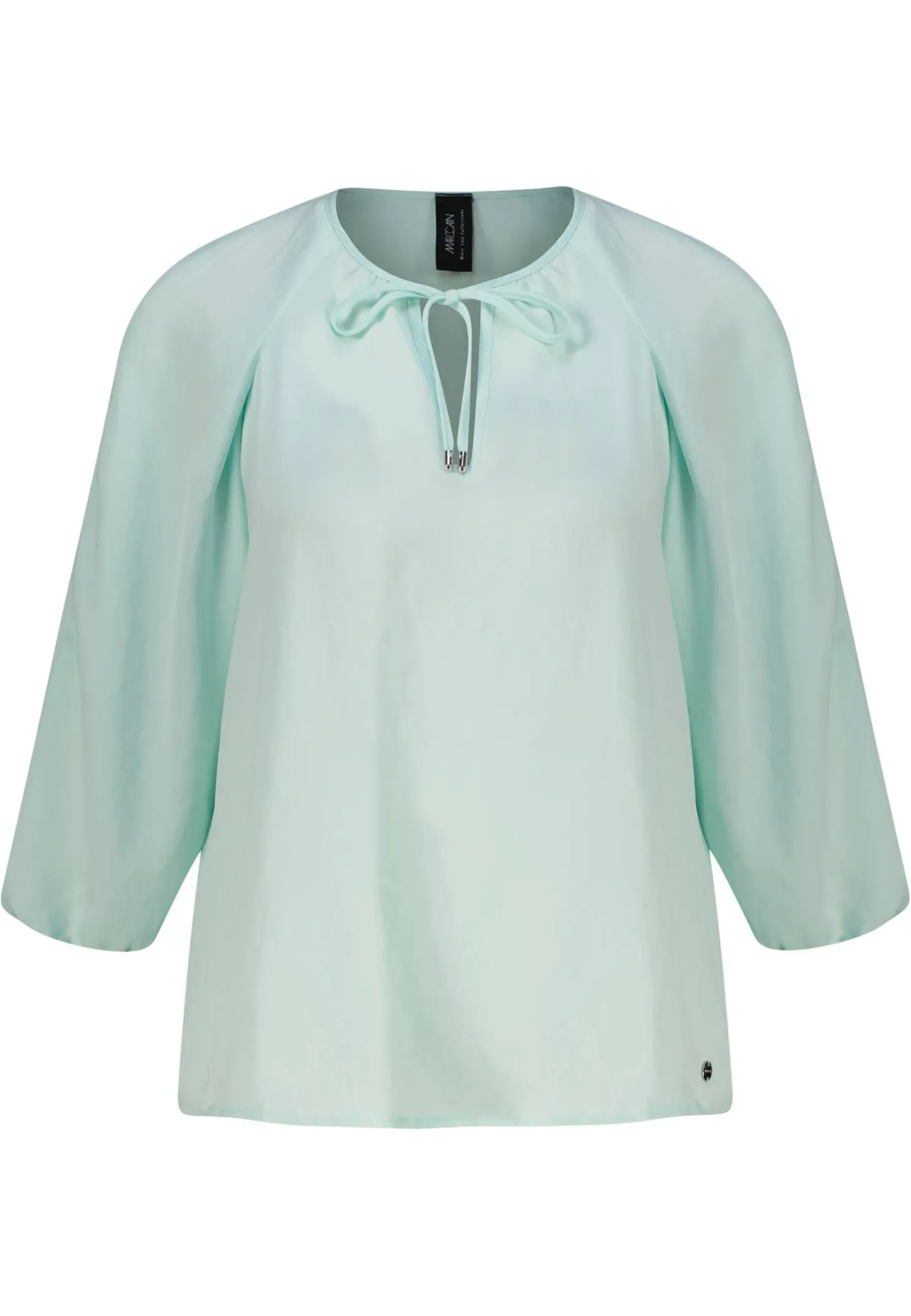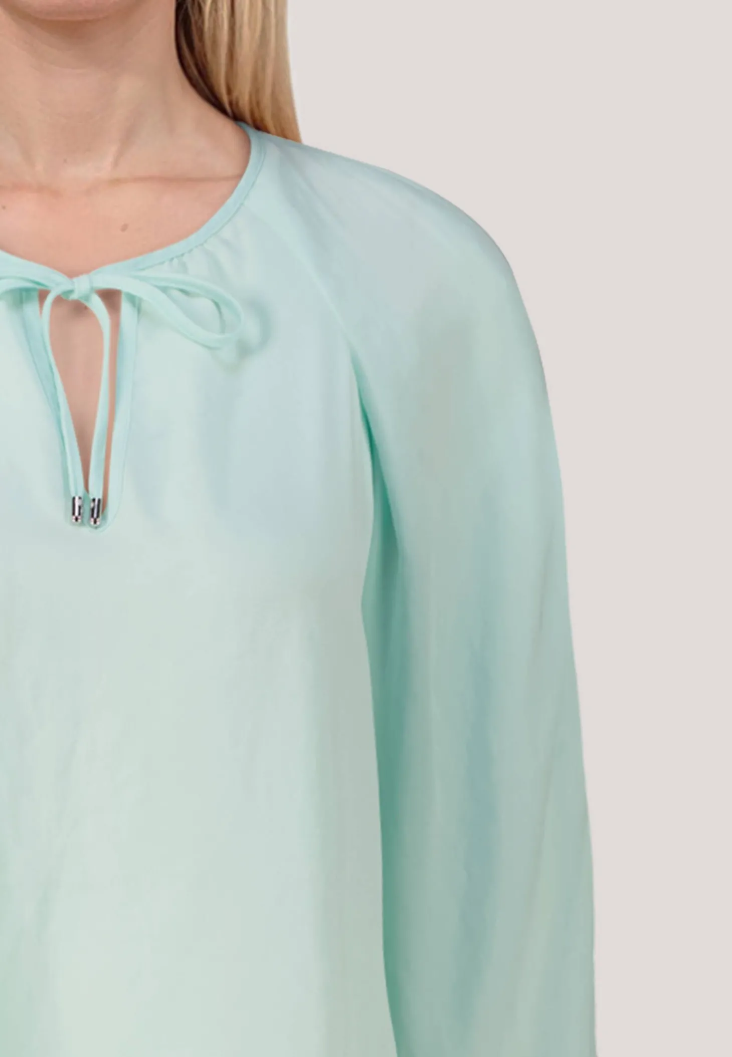 Weite, weich fließende Bluse aus vorwiegend recyceltem Polyester. Die Form basiert auf einem raffiniert konstruierten Raglan. Der Halsausschnitt ist mit Rundhals, Schlitz und Bändchenverschluss gearbeitet. Das Modell wird verantwortungsbewusst produziert und trägt das Nachhaltigkeitslabel „Rethink Together“.