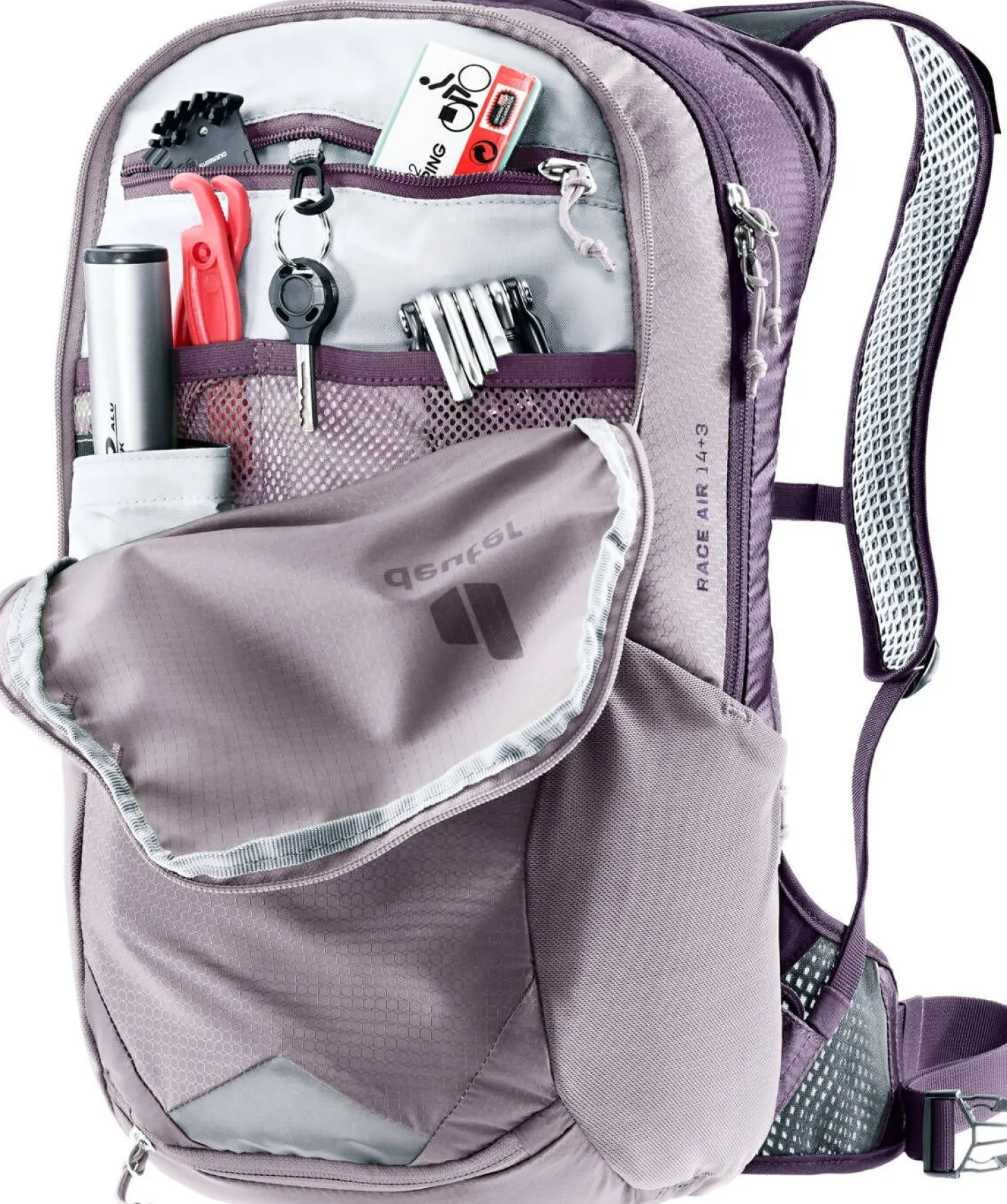- Vortasche mit großem Organisationsteil und RV-Netztasche für Schlauch, Werkzeug und Pumpenhalterung
