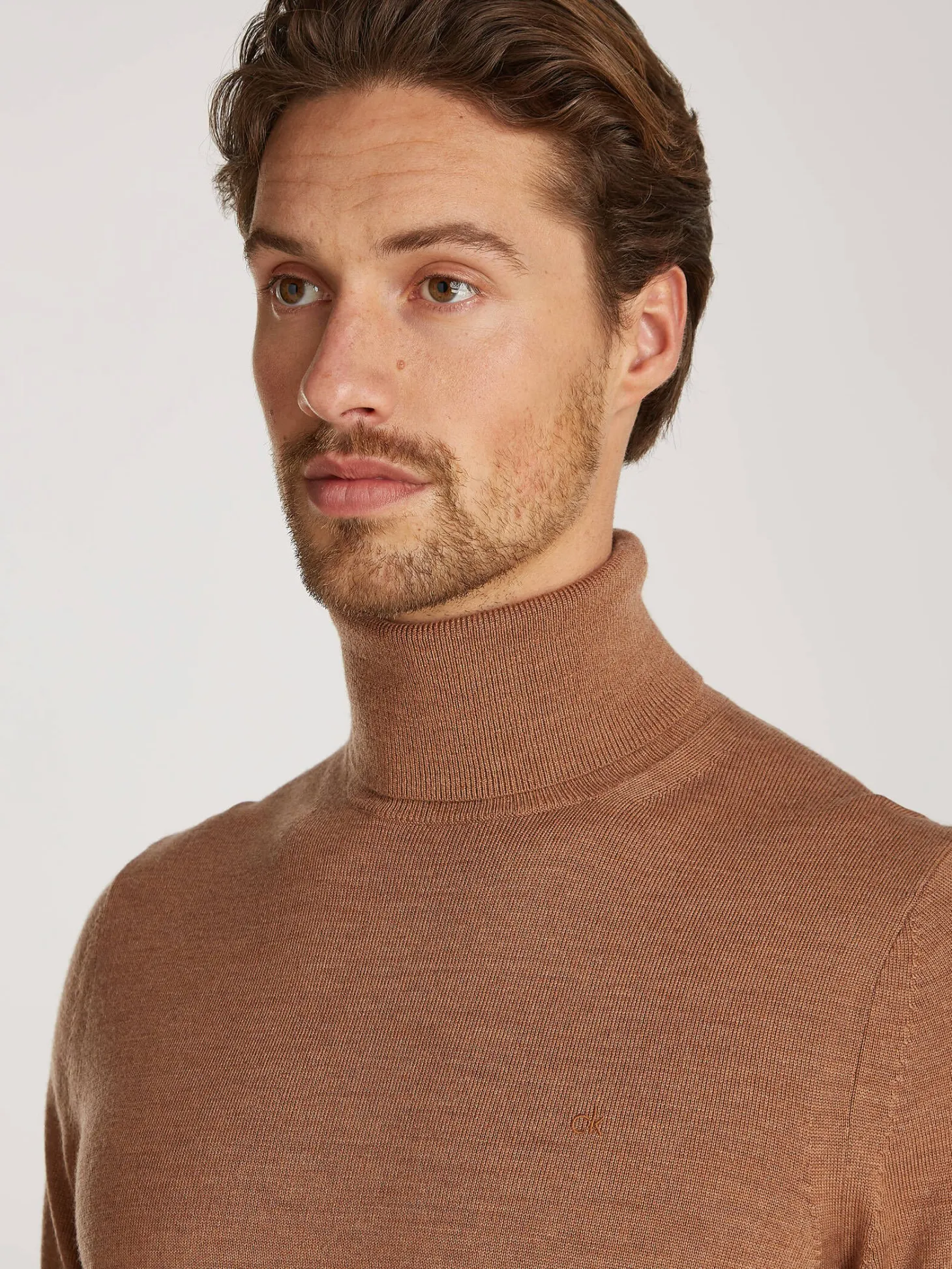 CALVIN KLEIN präsentiert den zeitlosen Rollkragenpullover in glatter, weicher Wollqualität.