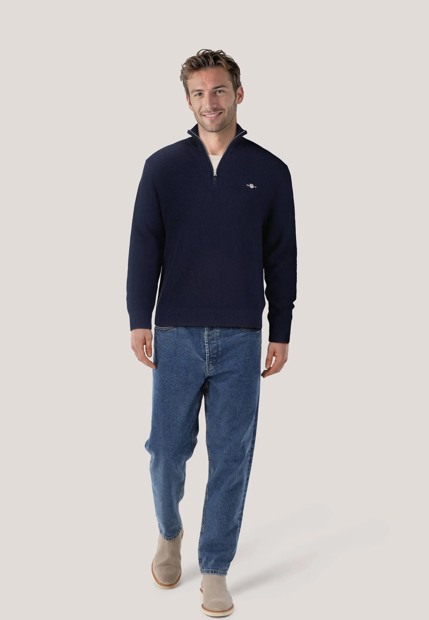 Der Pullover von Gant ist aus einem soften, hochwertigen Baumwolle-Merino-Mix gefertigt und mit praktischem Reißverschluss ausgestattet.