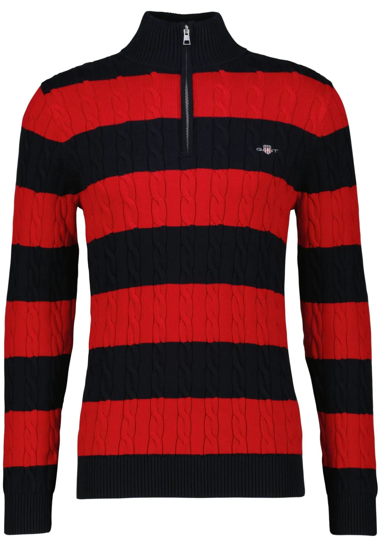 Der gestreifte Zopfstrick-Troyer aus Baumwolle von GANT kombiniert sportliche Eleganz mit zeitlosem Design und bietet durch den halben Reißverschluss vielseitige Styling-Möglichkeiten.