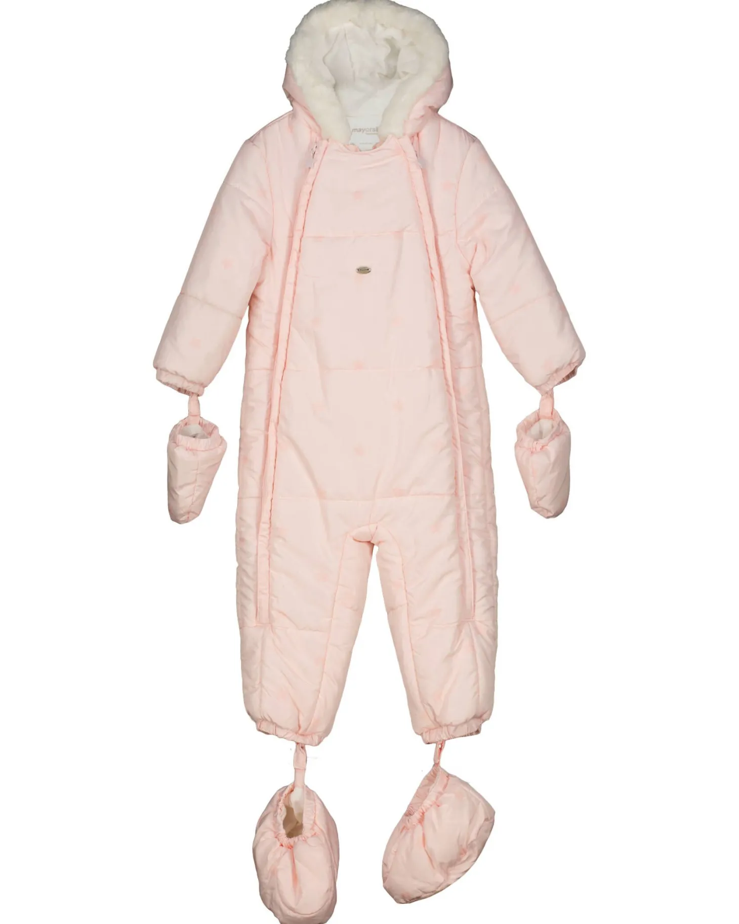 Der kuschelig warme Schneeoverall von Mayoral ist mit seinem hinreißenden Muster zum Knuddeln lieb. Ein Latz mit zweiseitigem Reißverschluss dient als praktische Öffnung. Flauschig gefütterte Fäustlinge und Schühchen, die am Saum befestigt sind, können nach Bedarf flexibel an- und ausgezogen werden.
