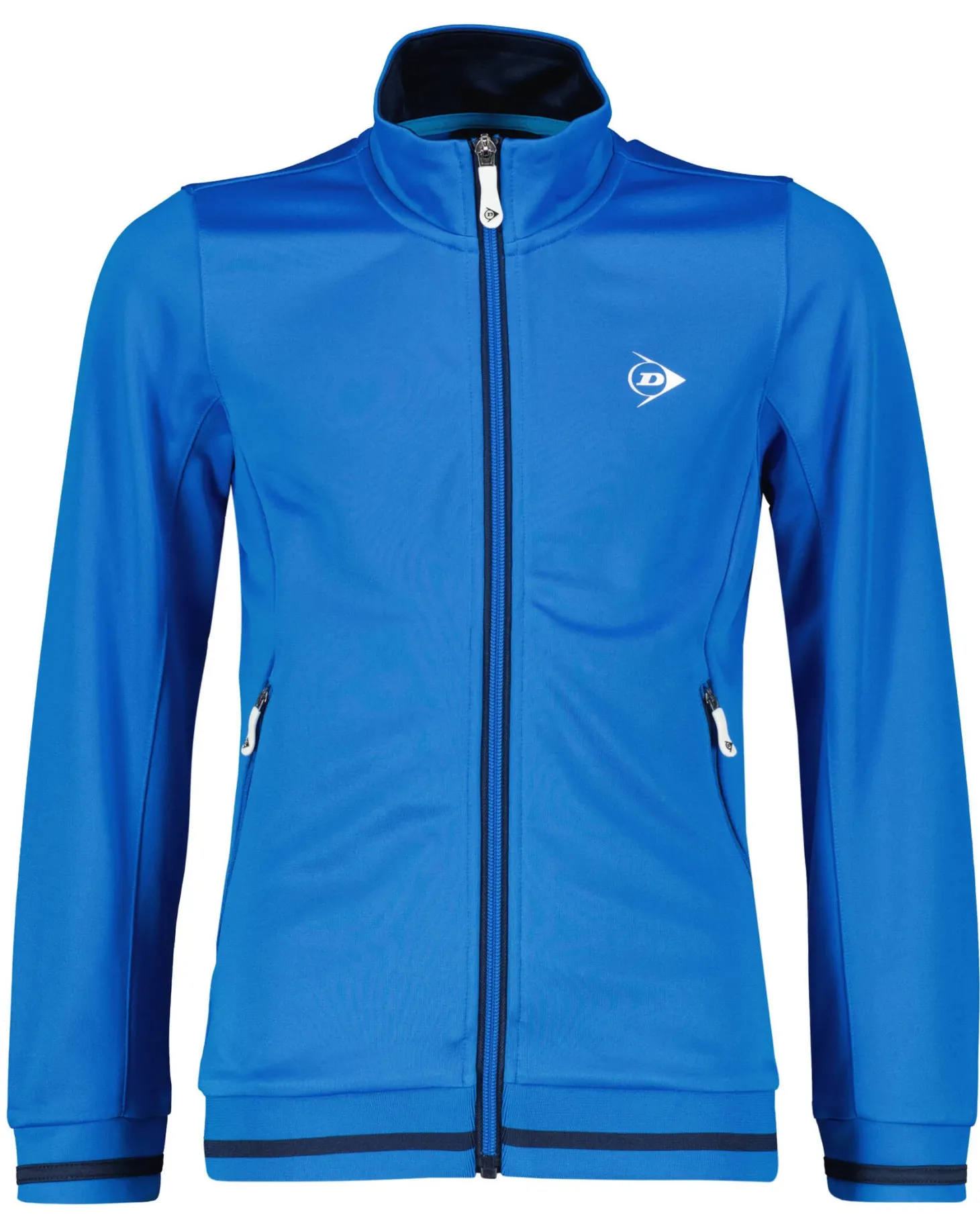 Die Club Line Trainingsjacke von Dunlop eignet sich ideal für das Warm-up und das Ausschwitzen nach dem Training. Die Jacke verfügt über einen Stehkragen, einen gerippten Saum und praktische Seitentaschen mit Reißverschluss. Kontrastfarbene Streifen-Details runden den sportlichen Look perfekt ab.