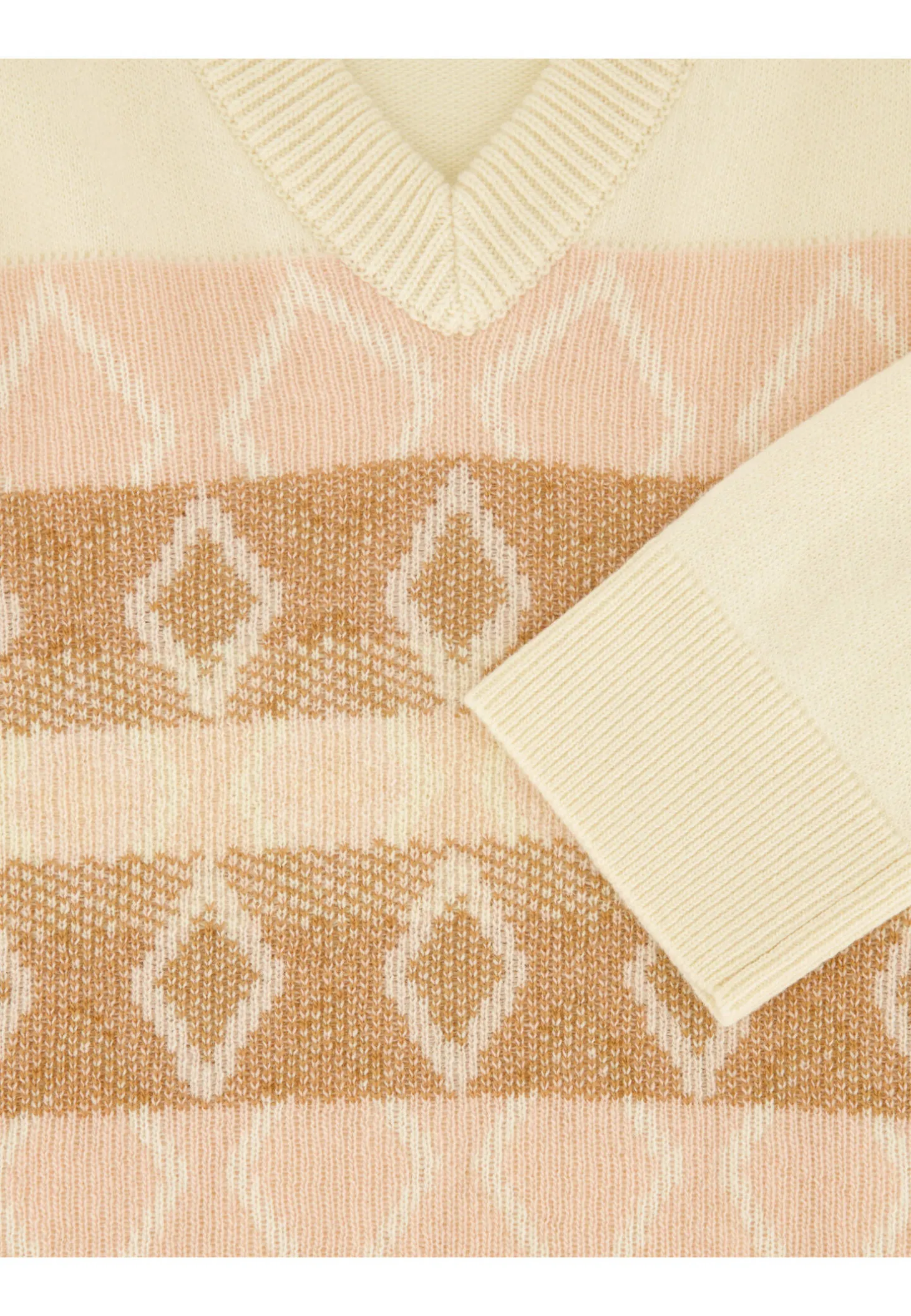 Dieser elegante Pullover von Moncler bietet leichte Wärme und höchsten Tragekomfort dank seiner weichen Wollqualität. Das klassische Design mit V-Ausschnitt wird durch ein feines Jacquard-Muster in sanften Pastelltönen stilvoll ergänzt – ideal für vielseitige Looks mit einem Hauch von Raffinesse.