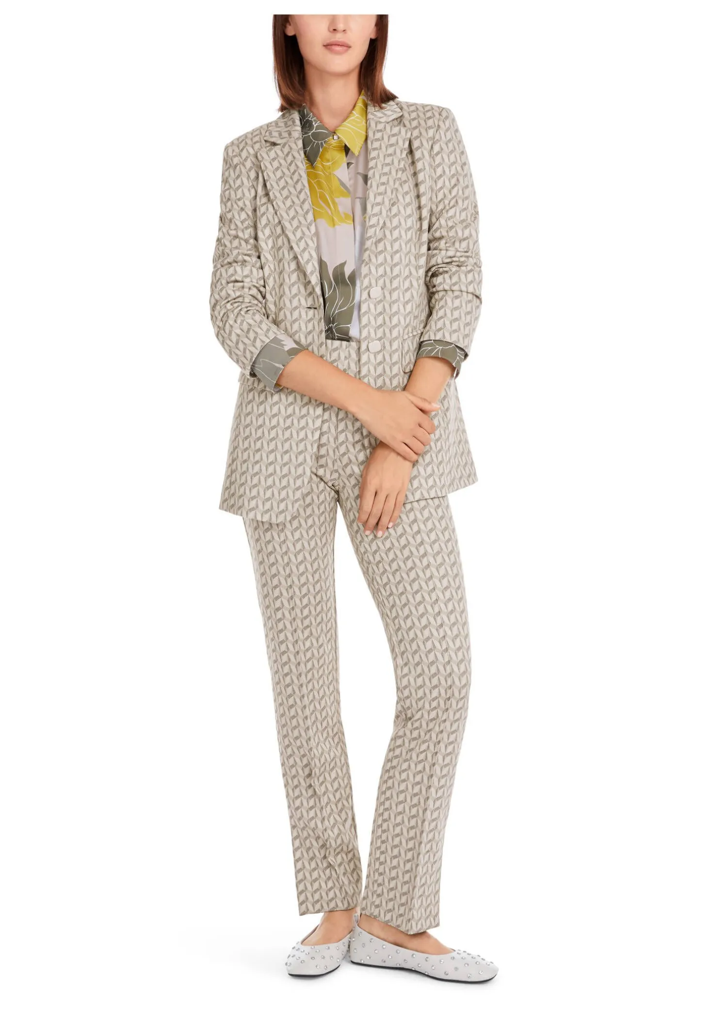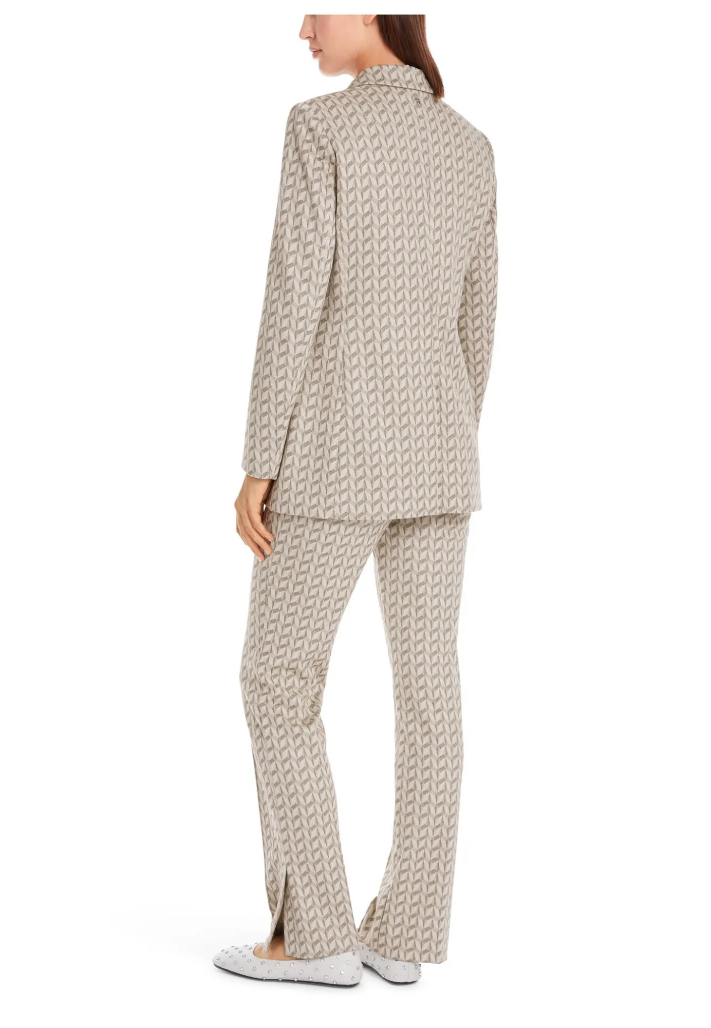 Mit seinem grafischen Jersey-Jacquard ist dieser dezent schimmernde Blazer ein nobles Style-Statement für verschiedenste Anlässe. Er präsentiert eine lange, figurnahe Silhouette mit Wiener Nähten und Schulterpolstern. Das Revers und die Klappentaschen unterstreichen den klassischen Stil. Der Einreiher wird mit Schmuckknöpfen geschlossen.
