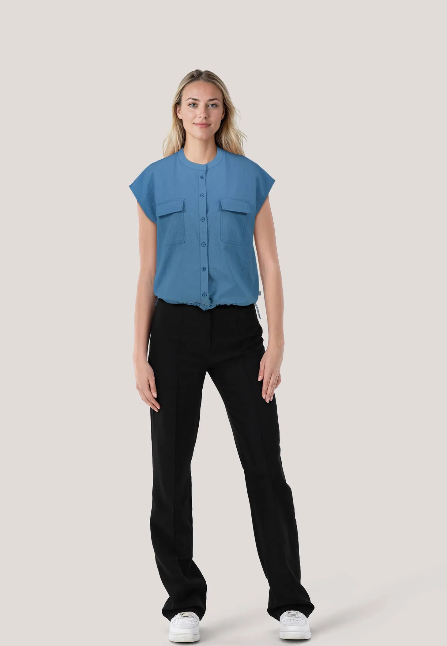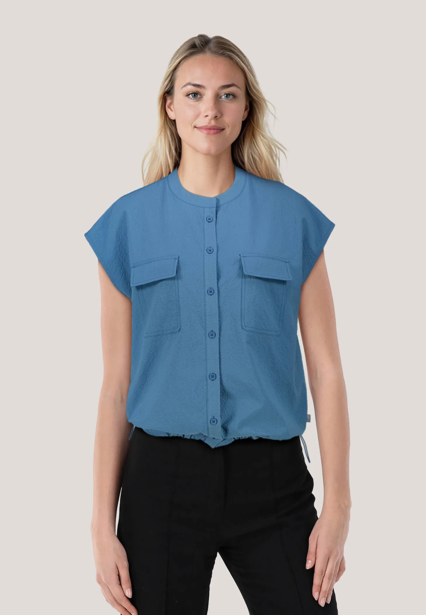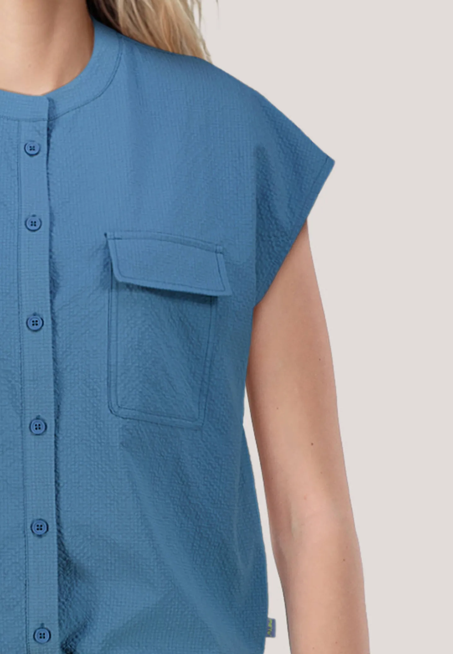 Die Bluse aus leichtem, gekrepptem Stoff ist der ideale Begleiter für Outdoor-Aktivitäten.