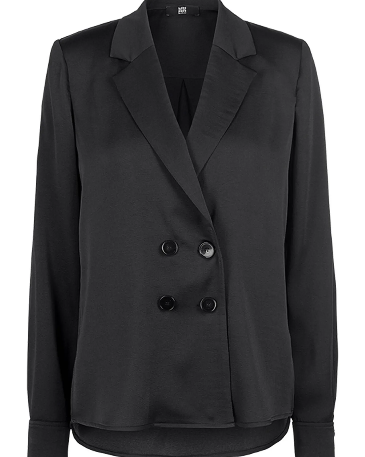 Diese Bluse im Blazer-Design kombiniert die Eleganz eines Blazers mit der Leichtigkeit einer Bluse. Sie bietet eine taillierte Silhouette, einen klassischen Reverskragen und edle Knopfdetails, perfekt für Business- und Casual-Looks.