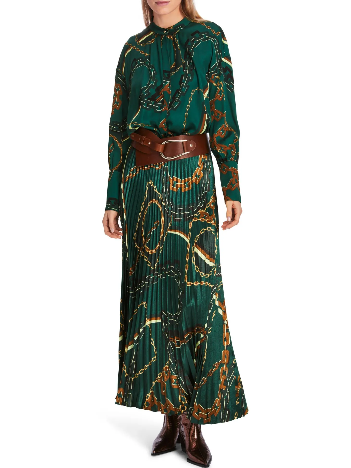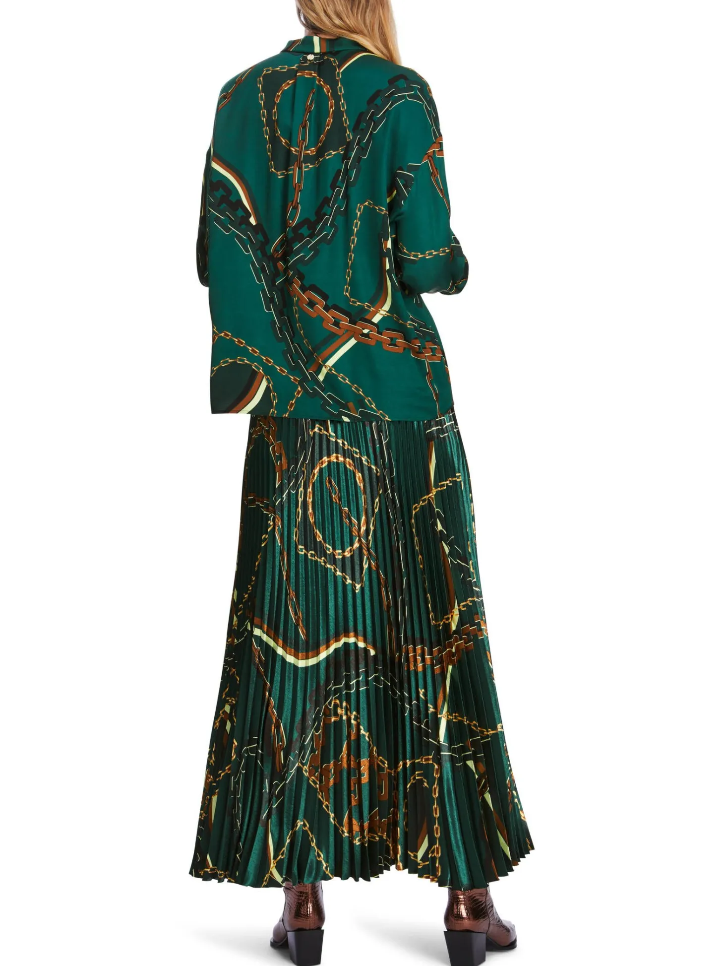 Bluse mit Ketten-Print von Marc Cain.Weich fließendes Material und ein schicker Ketten-Print charakterisieren die Optik dieser Bluse. Sie hat eine weite Silhouette mit Stehkragen und extra breiten, mit vielen kleinen Knöpfen versehenen Manschetten. Die Knopfleiste im Vorderteil ist dezent verdeckt.