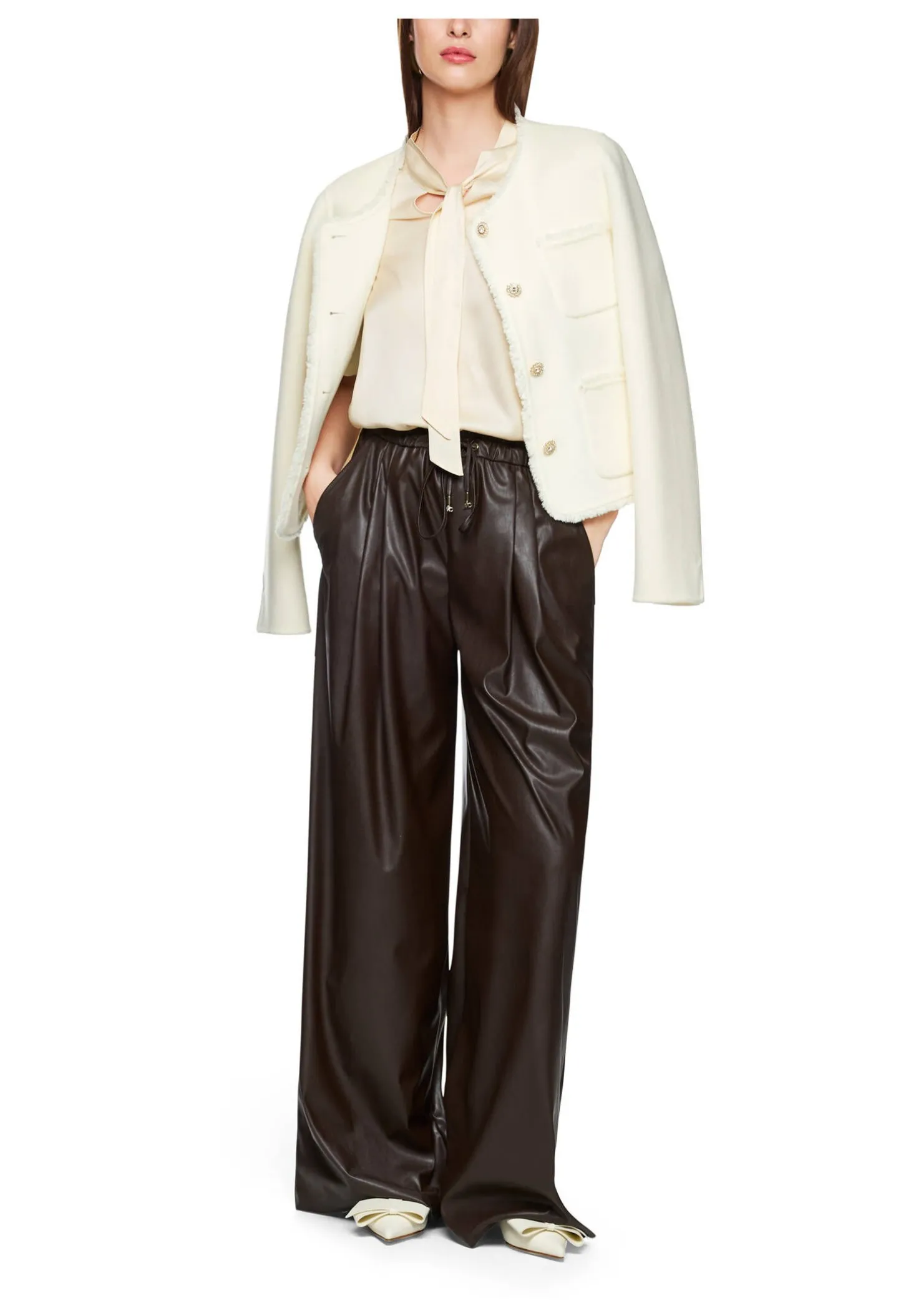 Die Vorderseite dieser Schluppenbluse aus glänzender Seide verleiht dem Design eine edle Note, während die Rückseite aus weichem Jersey maximalen Tragekomfort bietet. Der Materialmix verbindet Stil und Bequemlichkeit perfekt.