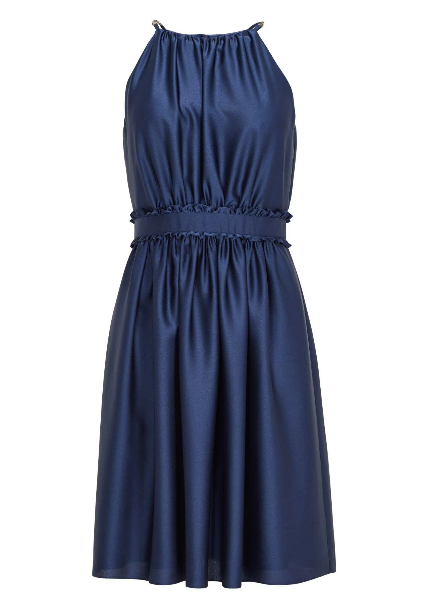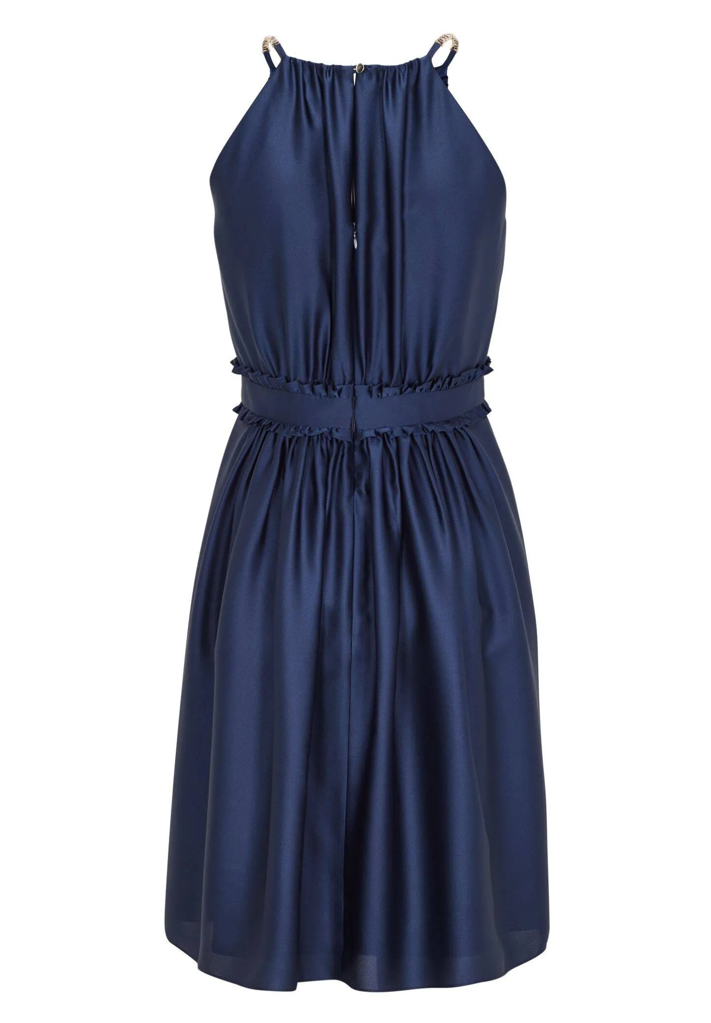 Das Satinkleid von Swing zeigt sich mit feinen Rüschen und eleganten Kettendetails.