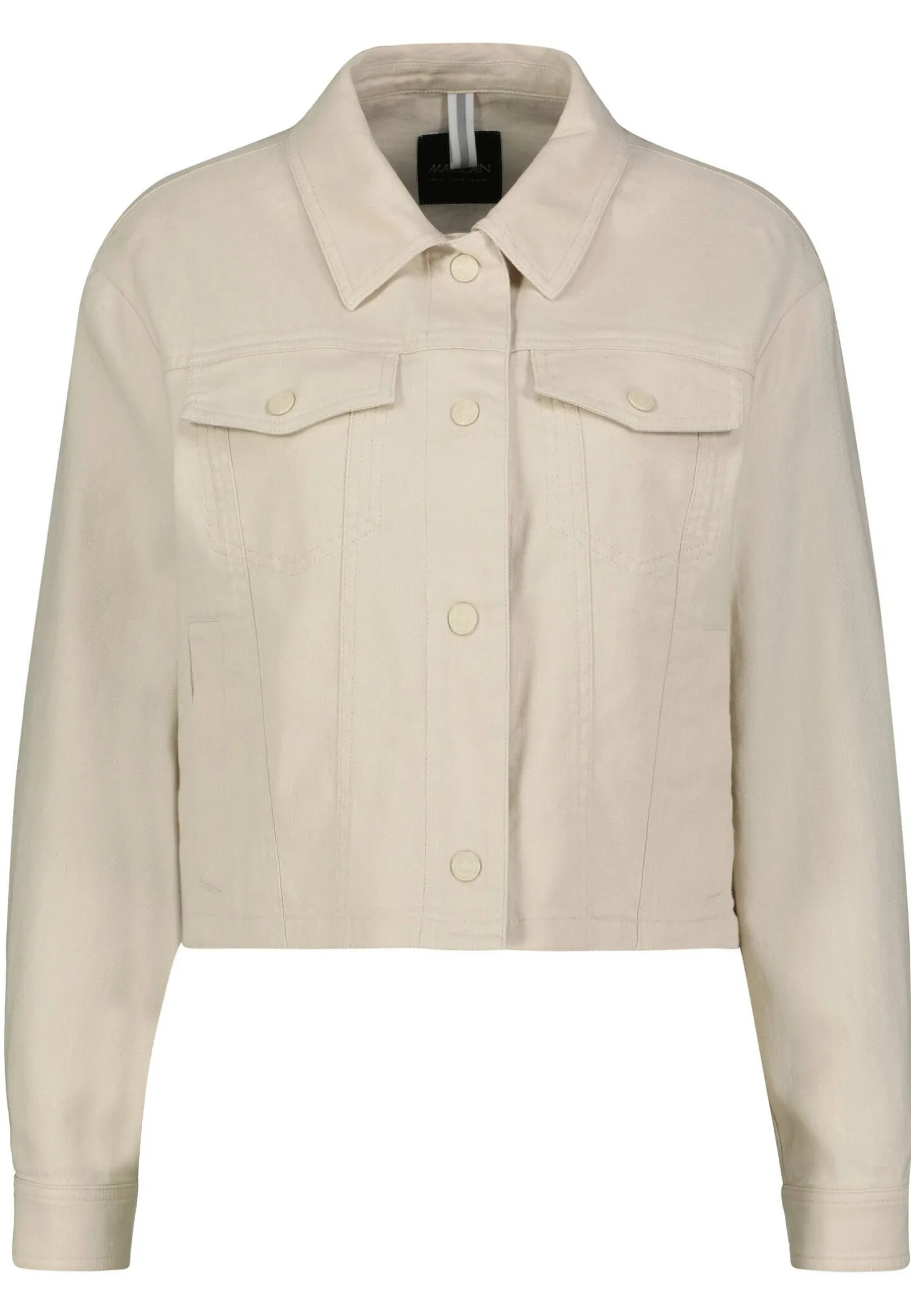 Diese taillenkurze Jacke präsentiert sich im typischen Denim-Stil mit doppelt gesteppten Nähten und Brustklappentaschen. Teilungsnähte sorgen für eine figurnahe Silhouette. Im Rücken befindet sich ein komfortabler Schlitz. Tonale Druckknöpfe mit Marc-Cain-Sport-Schriftzug komplettieren das Design.