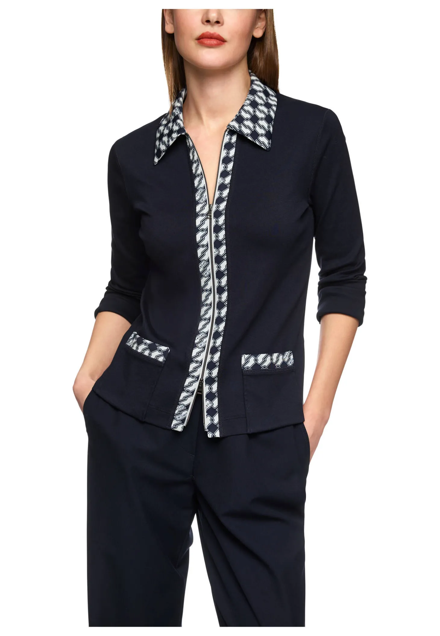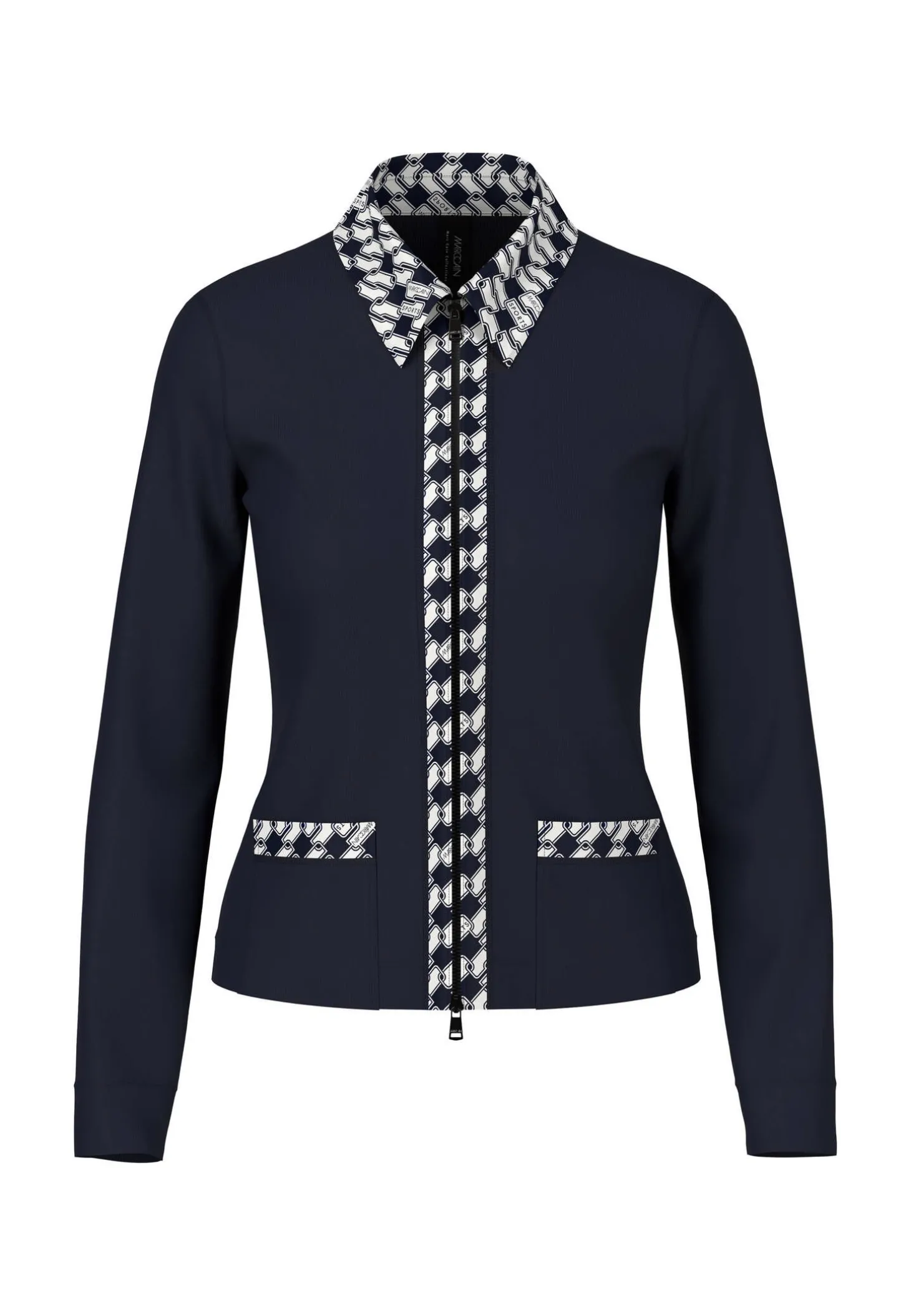 Jerseyblazer mit Cube-Print-Details von Marc Cain Sports. Schmal geschnittenes Jäckchen aus bequemem Jerseystretch für optimalen Tragekomfort. Kleine Details mit Cube-Print setzen den Blazer außergewöhnlich in Szene. Aufgesetzte Taschen und der Zwei-Wege-Reißverschluss unterstreichen den Look.