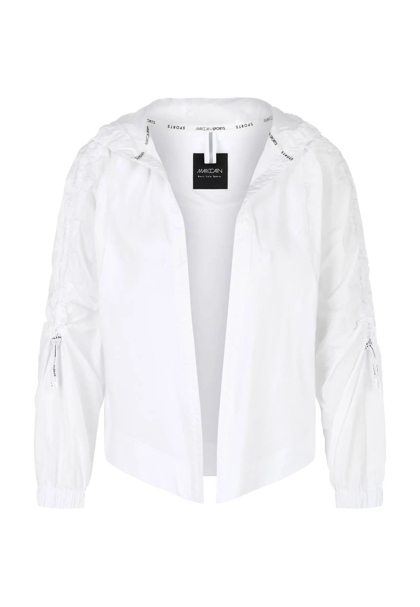 Durch ihren angenehmen Material-Mix mit Baumwollstretch und fließendem Webmaterial ist diese Jacke ein toller Begleiter bei sportlichen Aktivitäten. Der außergewöhnliche Schnitt zeigt individuell verstellbare Ärmel mit Kordel und Stopper. Die Jacke kommt mit großer Kapuze und ist in der Front ohne Verschluss.