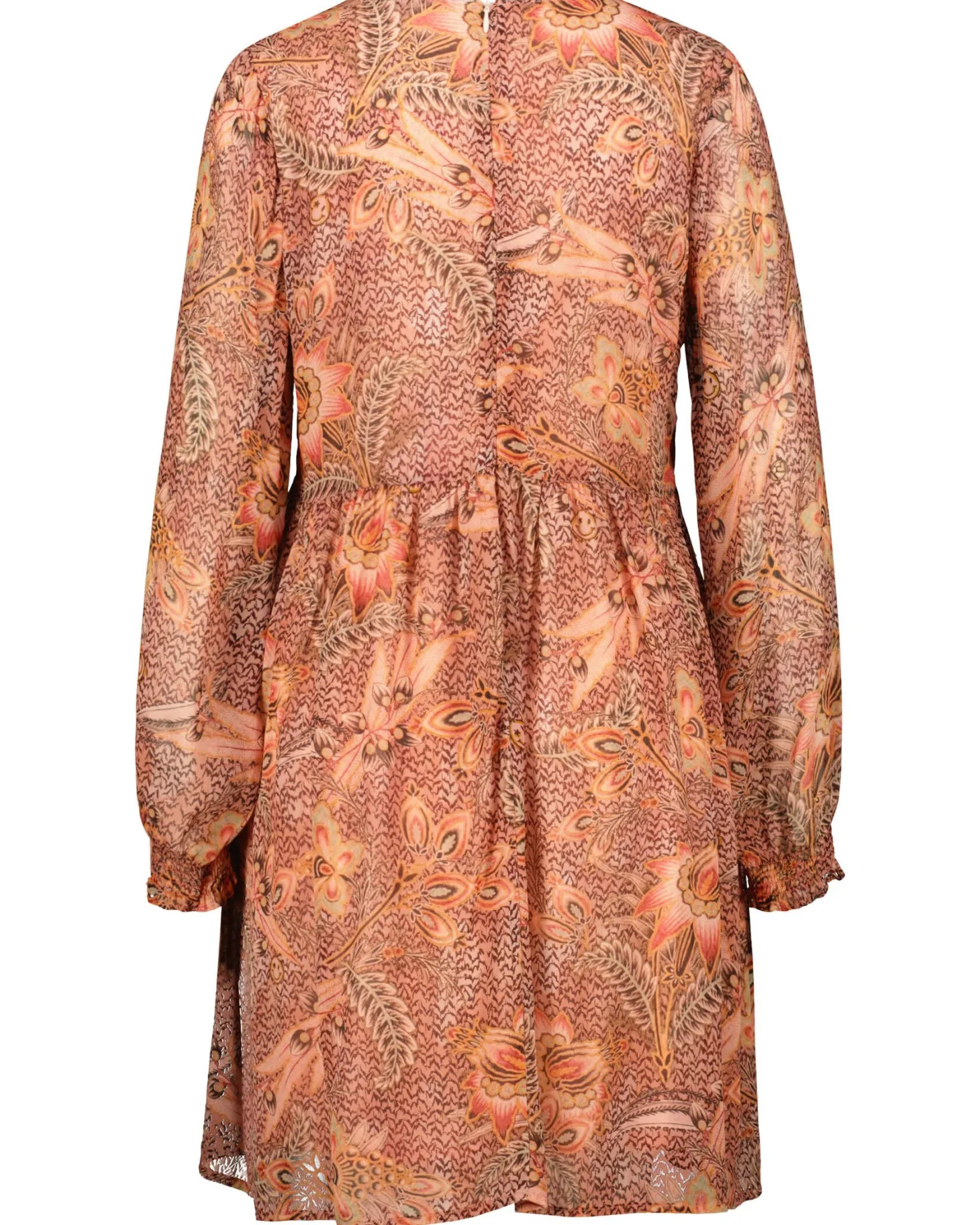 Das Kleid von Frogbox besteht aus zartem, leicht transparentem Viskose-Crêpe mit hübschem Allover-Blumenmuster. Am Rumpf ist das Modell gefüttert und wird an der Rückseite mit einem nahtfeinen Reißverschluss geschlossen.