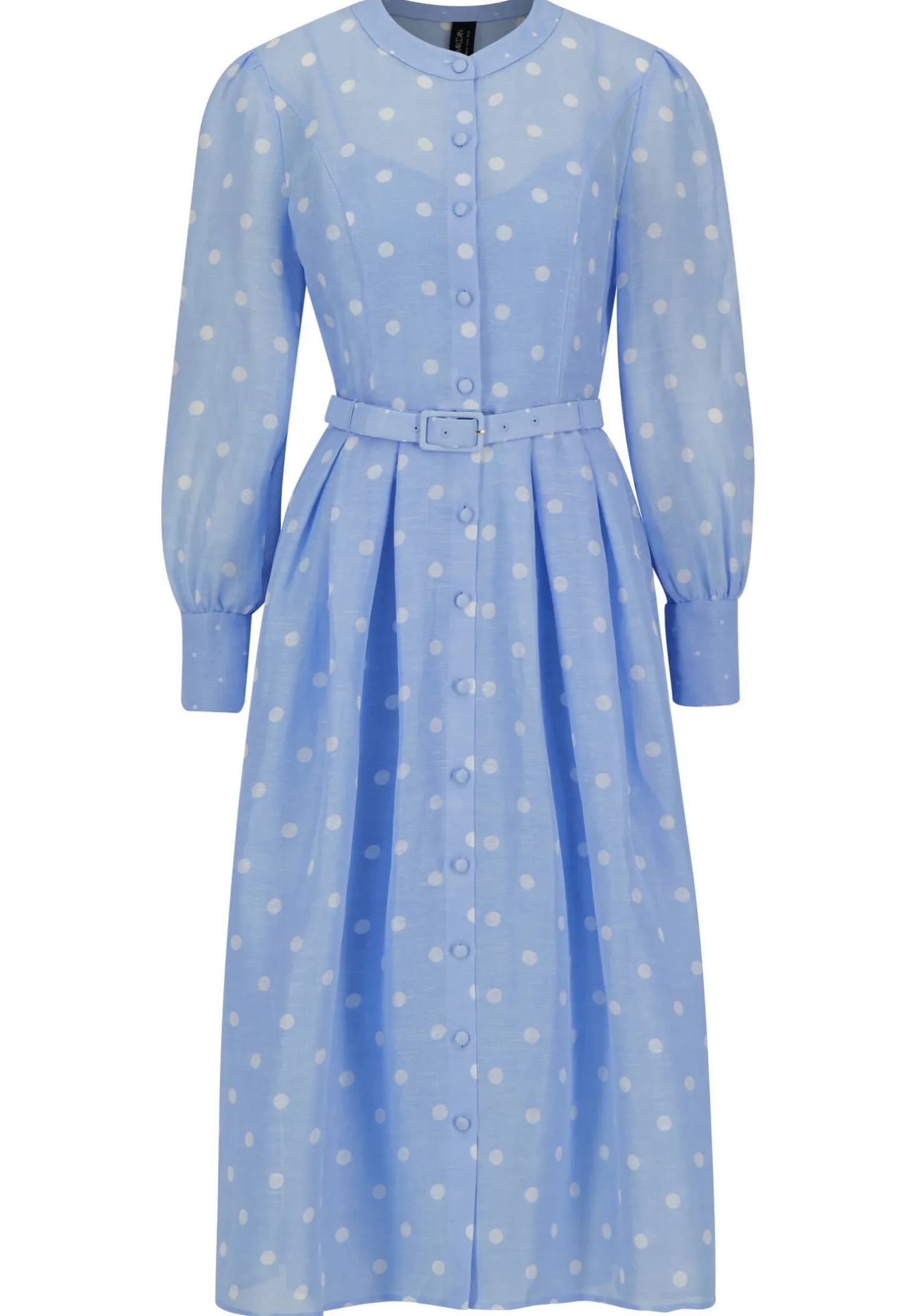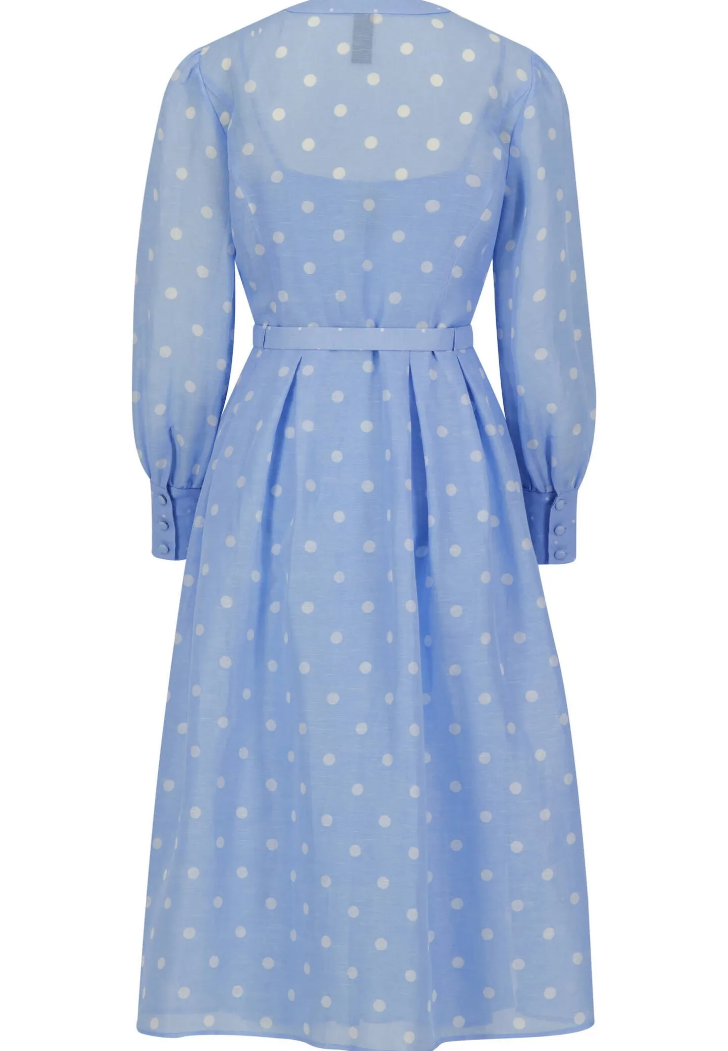 Das feminine Kleid im Tupfen-Design überzeugt durch seinen Retro-Charme und die hochwertige Verarbeitung aus Leinen und Seide.