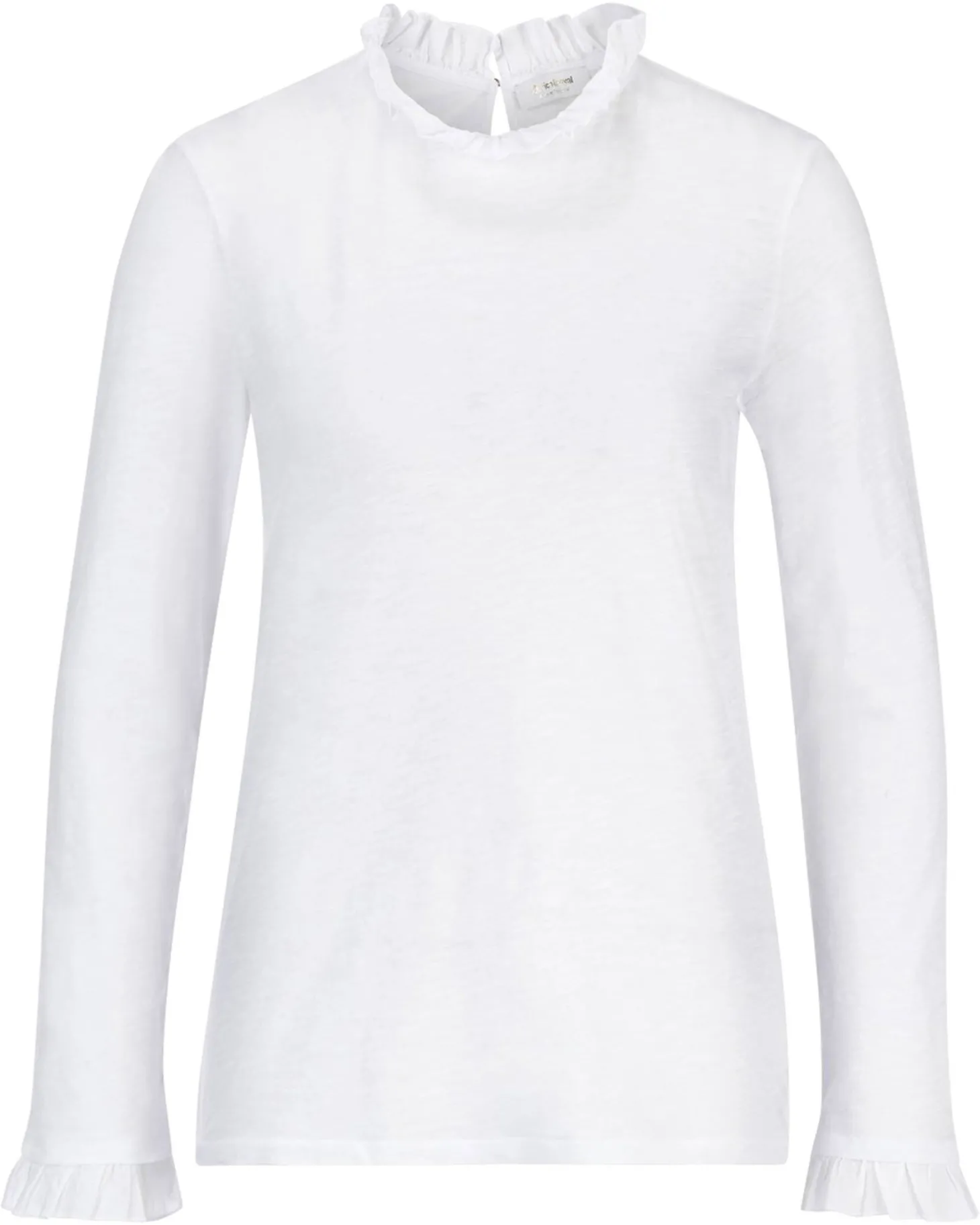 Rüschen als Stehkragen und am Ärmelsaum zaubern aus diesem unifarbenen Longsleeve ein besonderes Shirt mit auffälligen Details. Schöner Hingucker ist der Schlüssellochverschluss im Nacken.