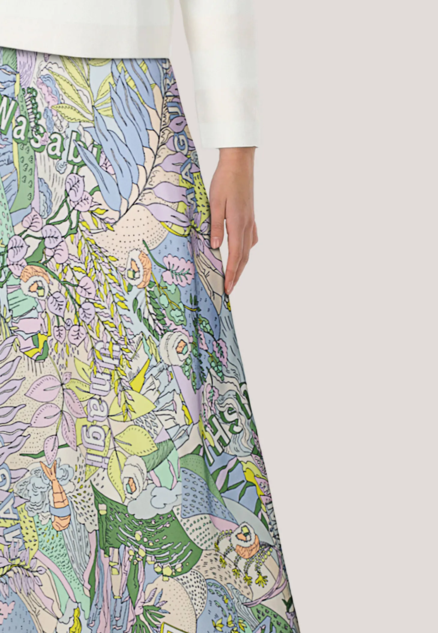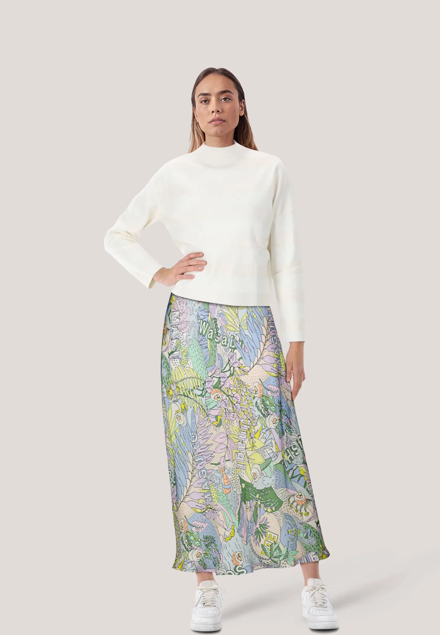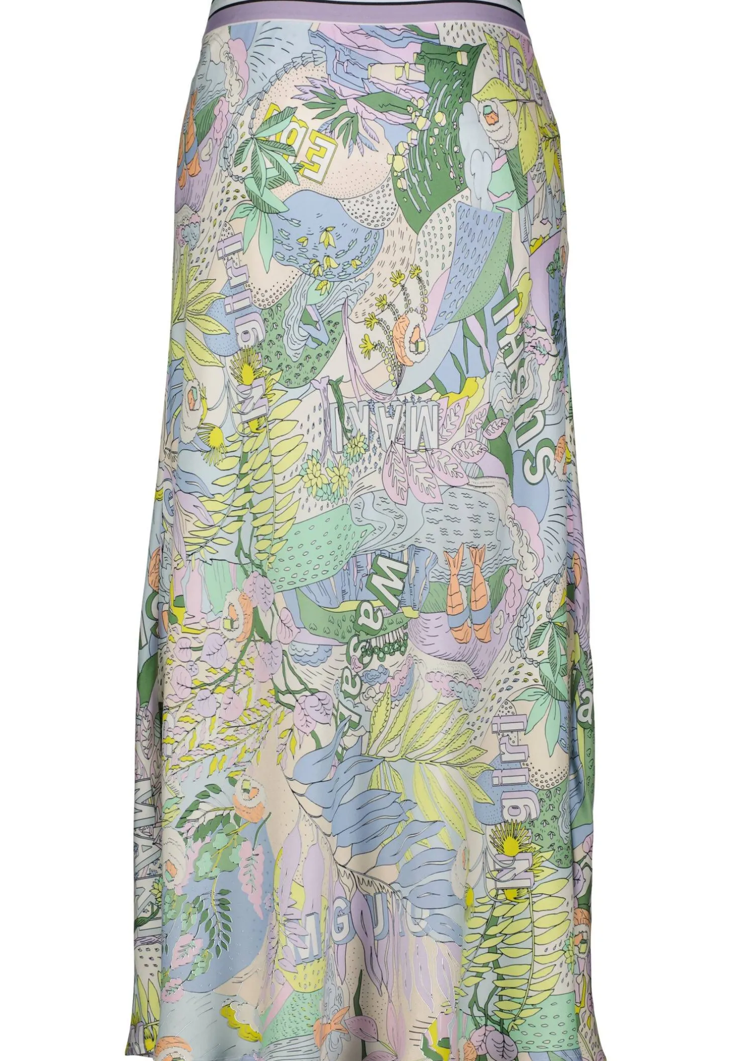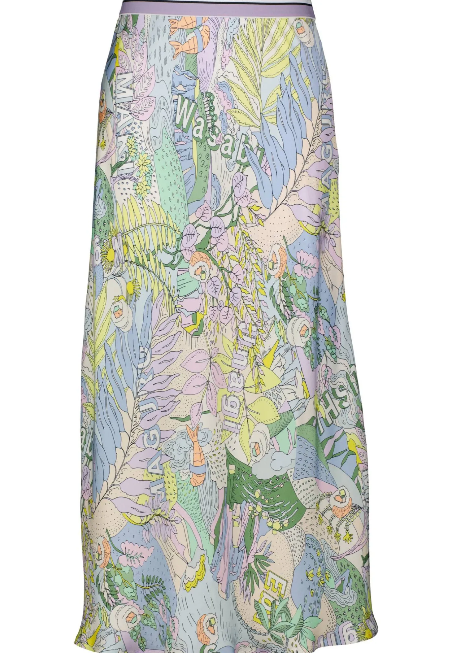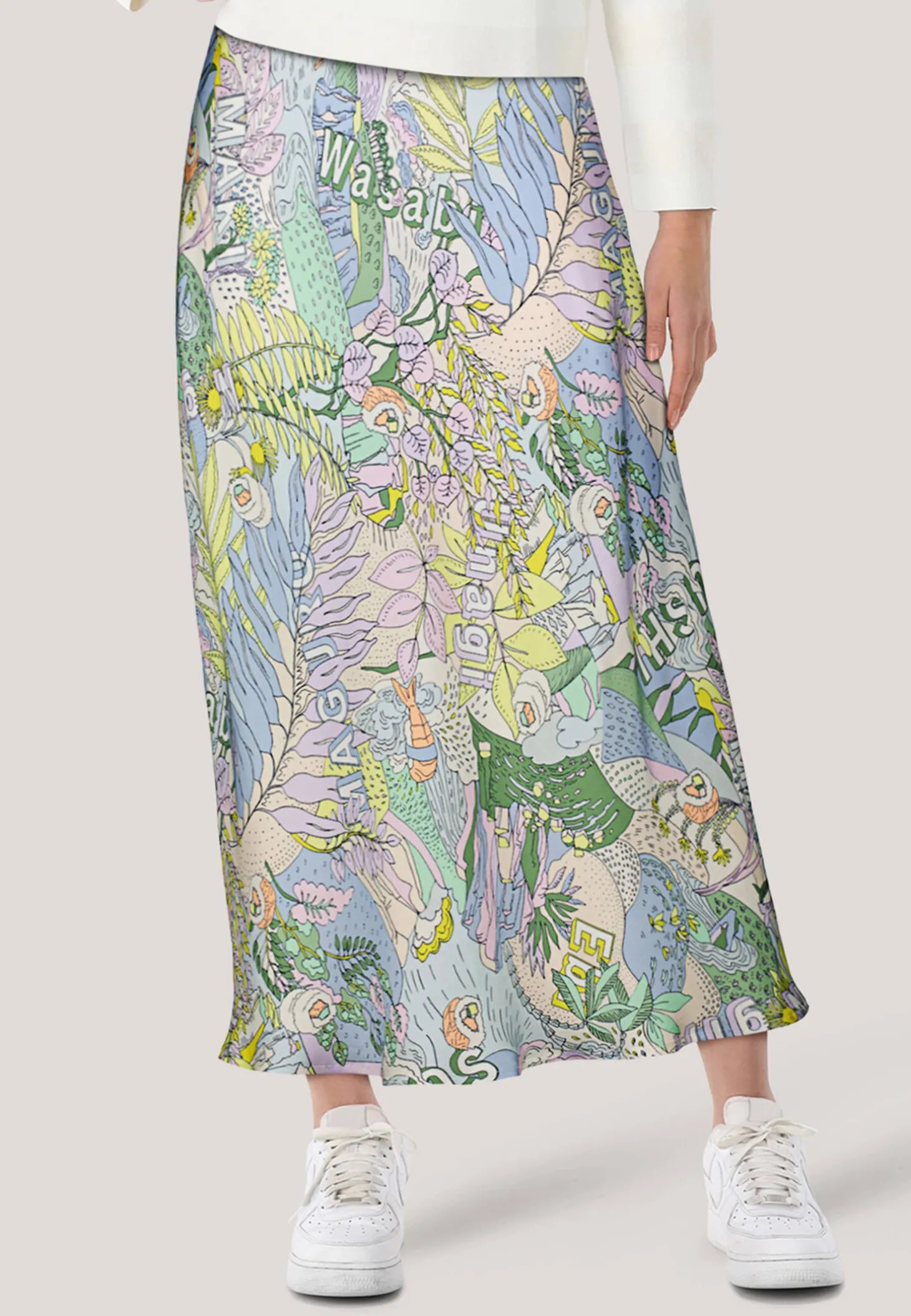 Der allover Sushi-Print kommt dank der fließenden Viskose bei diesem Rock ideal zur Geltung. Auch besticht der Rock mit seinem Tragekomfort dank des gestreiften Rips-Bundes aus elastischem Material. Die Silhouette zeigt eine A-Form mit verspieltem Glockensaum. Der Rock trägt das Nachhaltigkeitslabel „Rethink Together“.