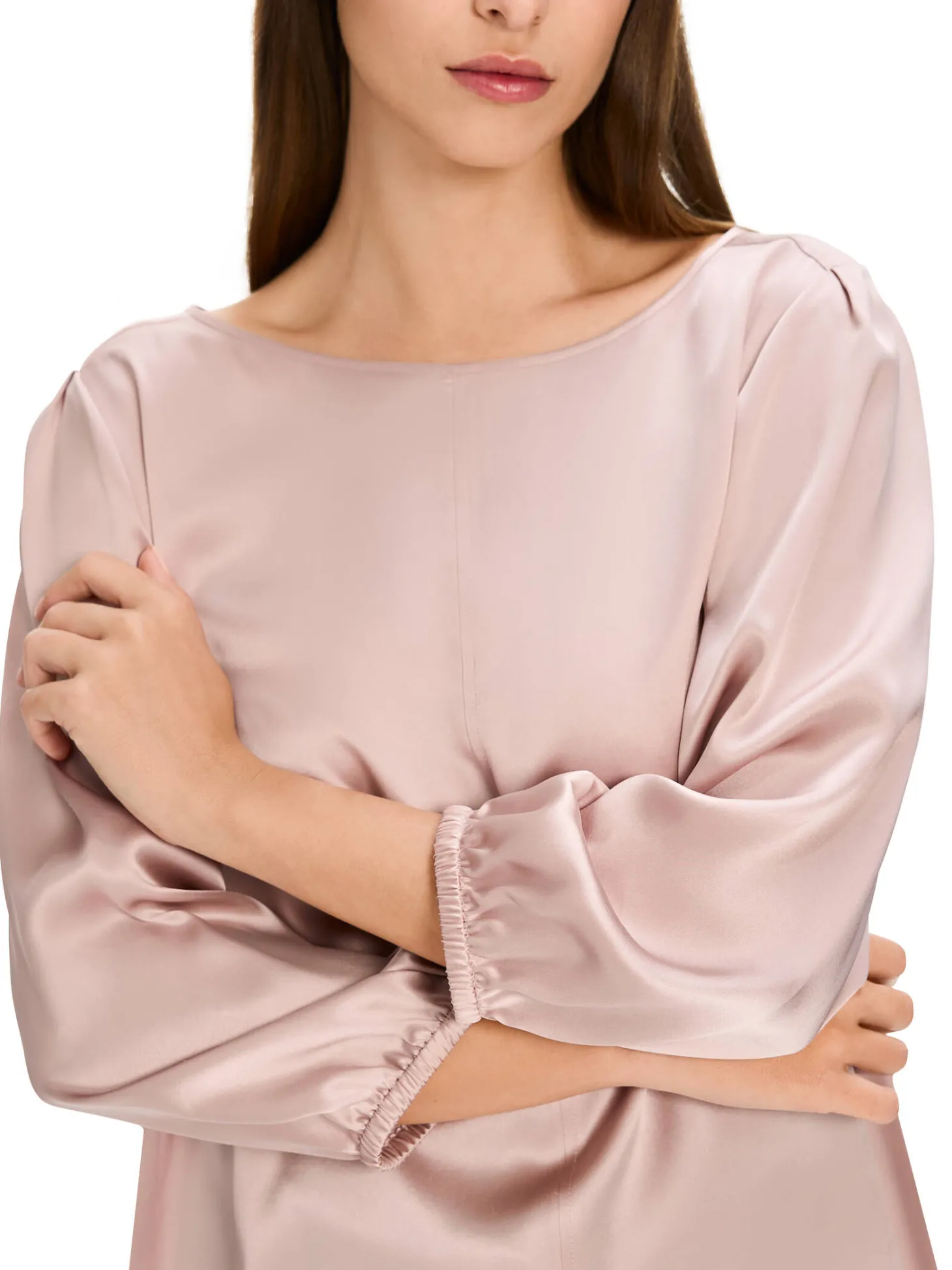 Lockere Seidenbluse von Marc Cain Additions. Diese feine Seidenbluse präsentiert sich mit lockerem Schnitt und weitem Rundhalsausschnitt. Sie hat weite, dreiviertellange Ärmel mit einem elastischen Bund. Dank des hautschmeichelnden Materials überzeugt die Bluse mit hervorragendem Trageverhalten.