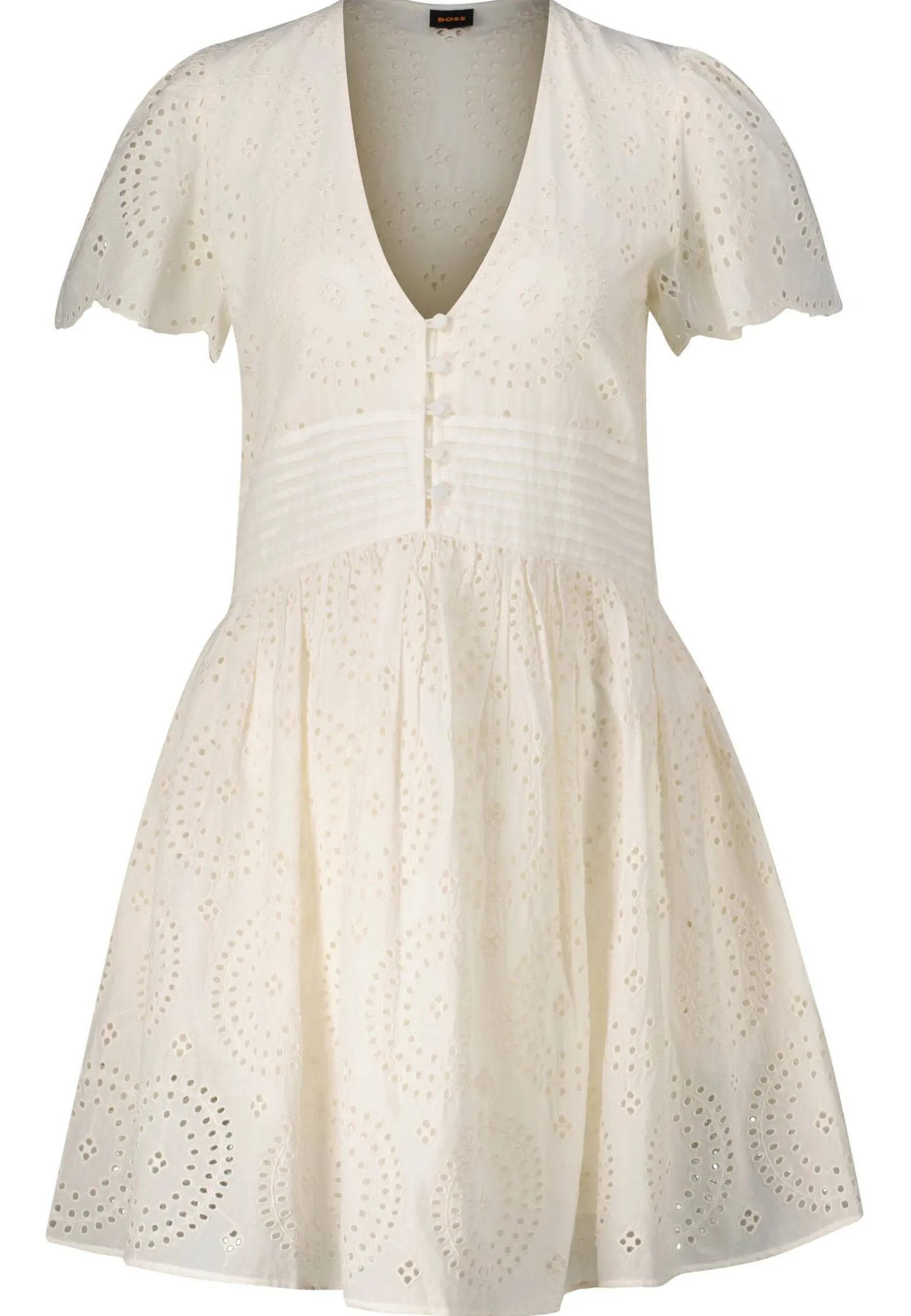 Dieses feminine BOSS Kleid aus Baumwolle überzeugt mit luftiger A-Linien-Silhouette, zartem Stick-Muster und stilvollen Details.