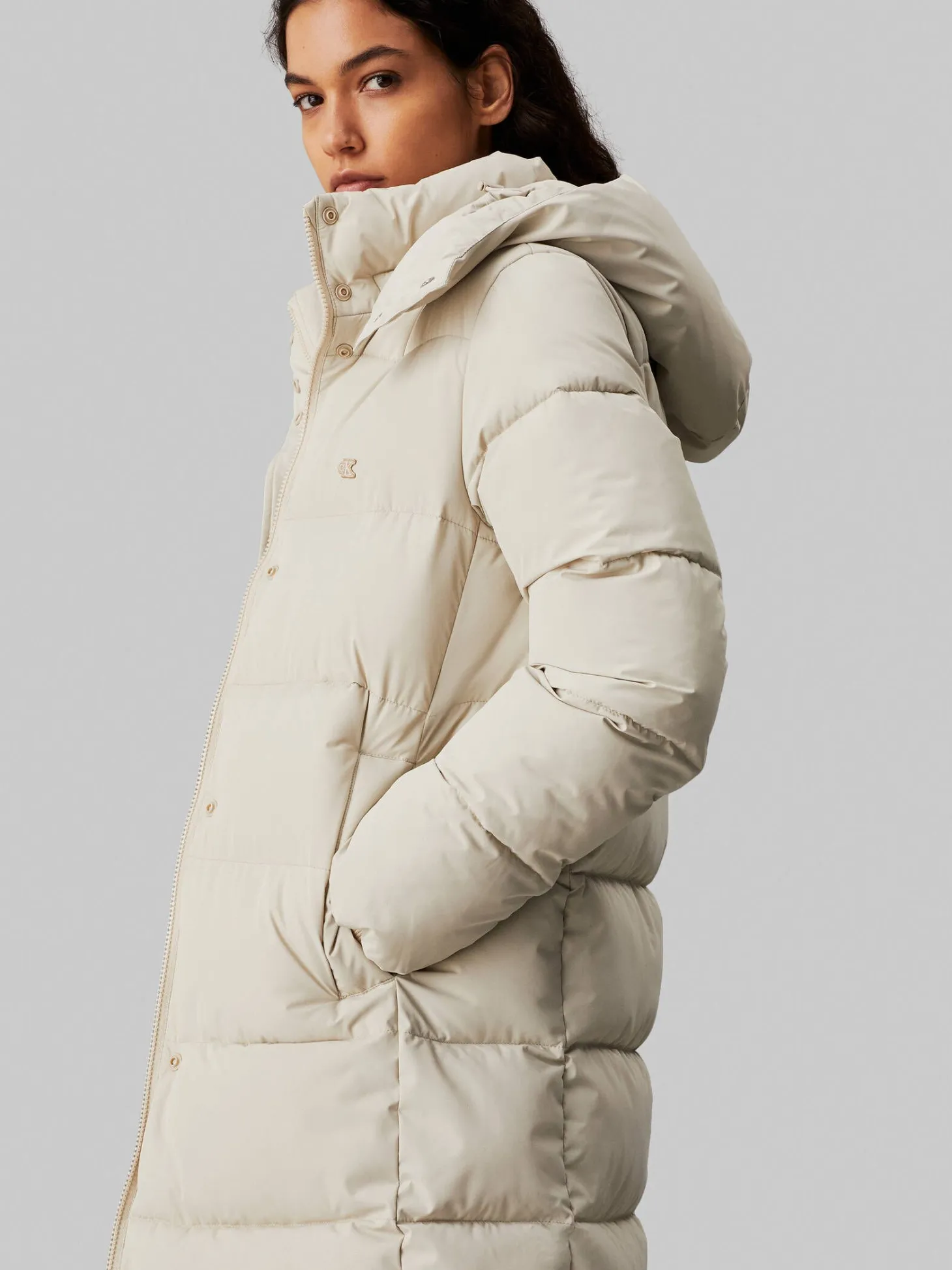 Langer Steppmantel mit Kapuze von Calvin Klein Jeans aus 63% recycleltem Polyester.