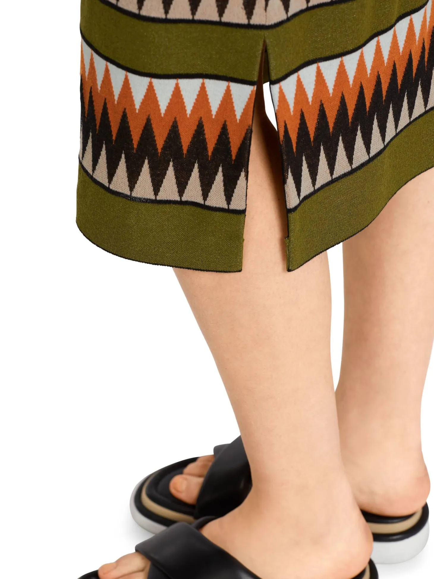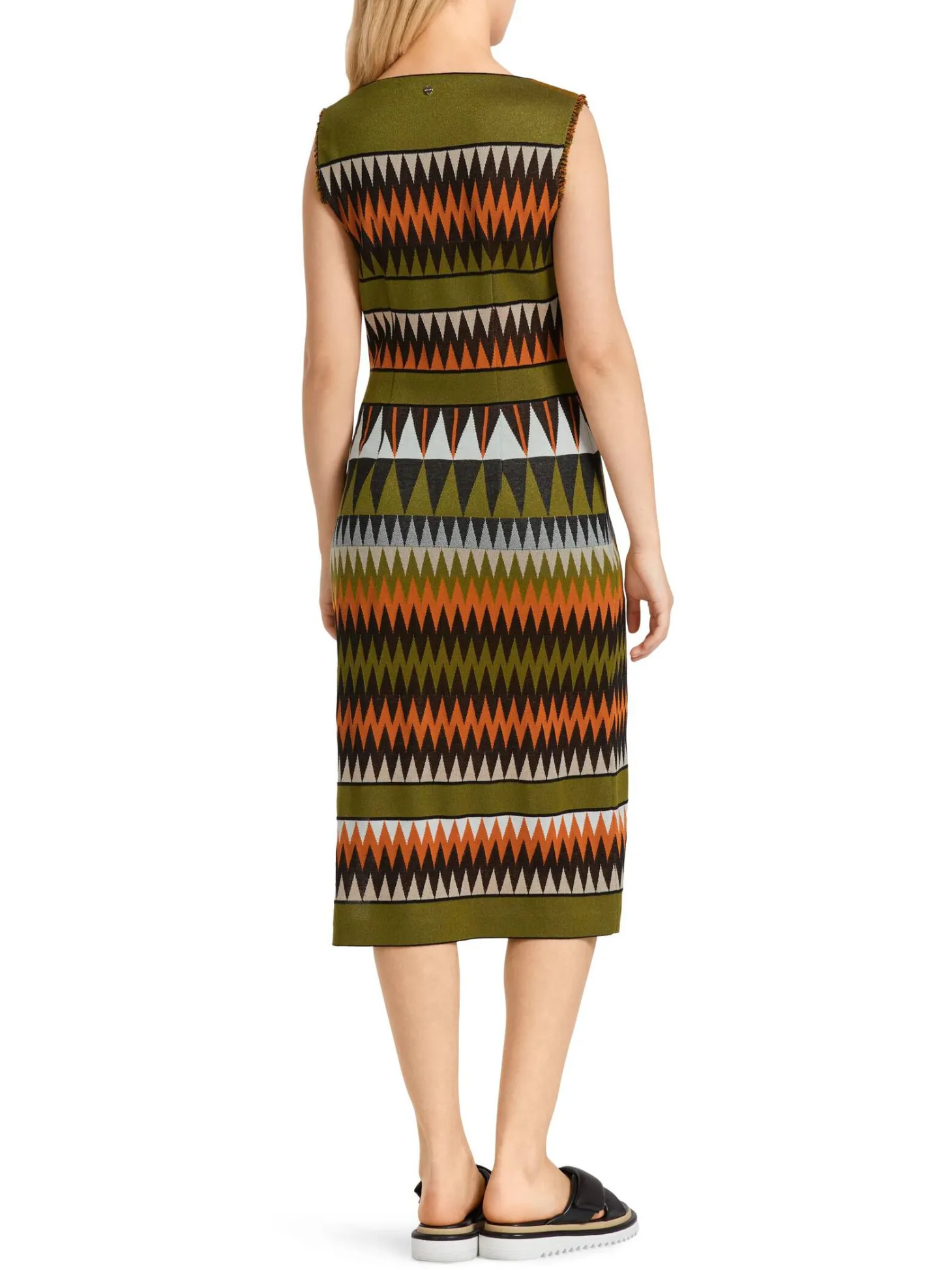 Das Kleid von Marc Cain erinnert mit seiner Farbästhetik an die Mode der 1970er Jahre und entwickelt in Verbindung mit dem Dessin eine vibrierende Optik. Modelliert ist das körpernahe Kleid durch Abnäher: Vorne sind es Brustabnäher, im Rücken Taillierungsnähte. Im Oberteil findet sich ein Wickeleffekt. Cooles Detail sind die Fransen an den Armausschnitten.