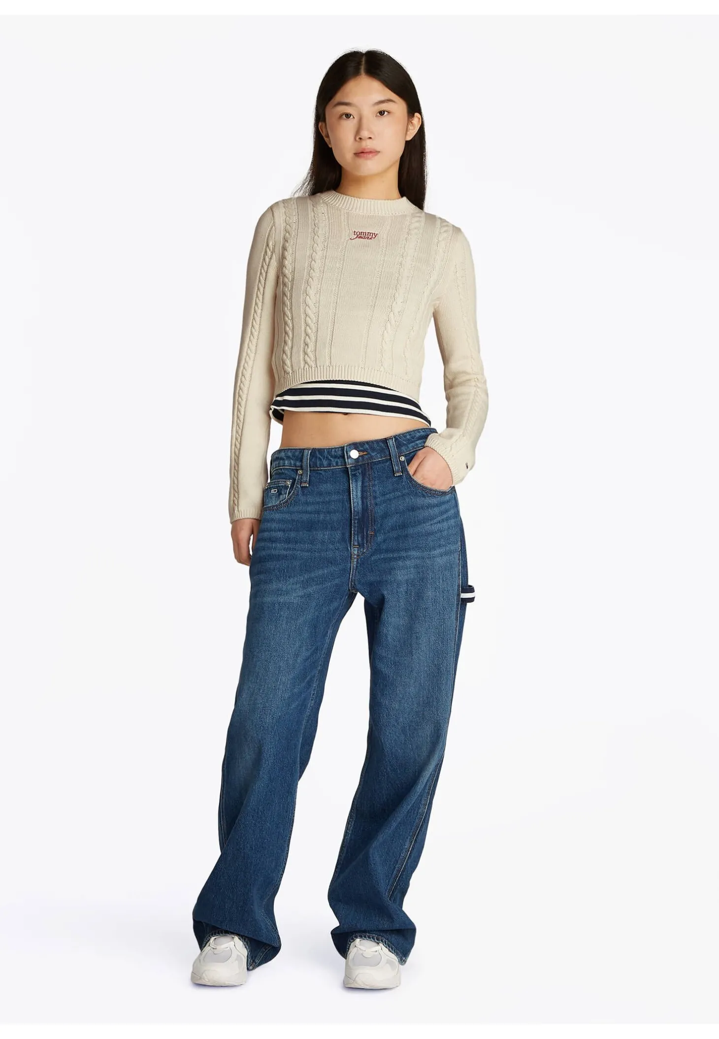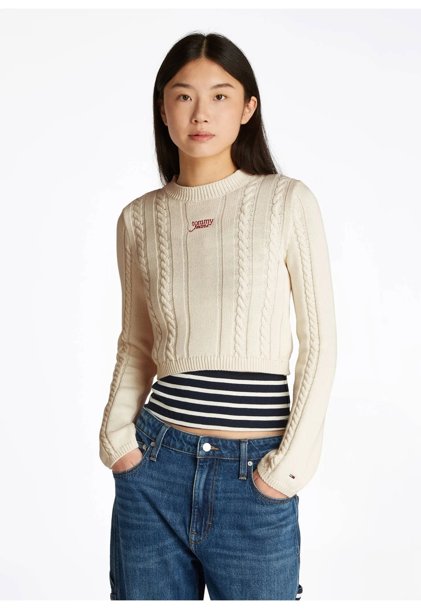 Der Cable Script Pullover von Tommy Jeans vereint stylische Cropped-Länge mit klassischem Zopfmuster und passt bestens zu High Waist Jeans.