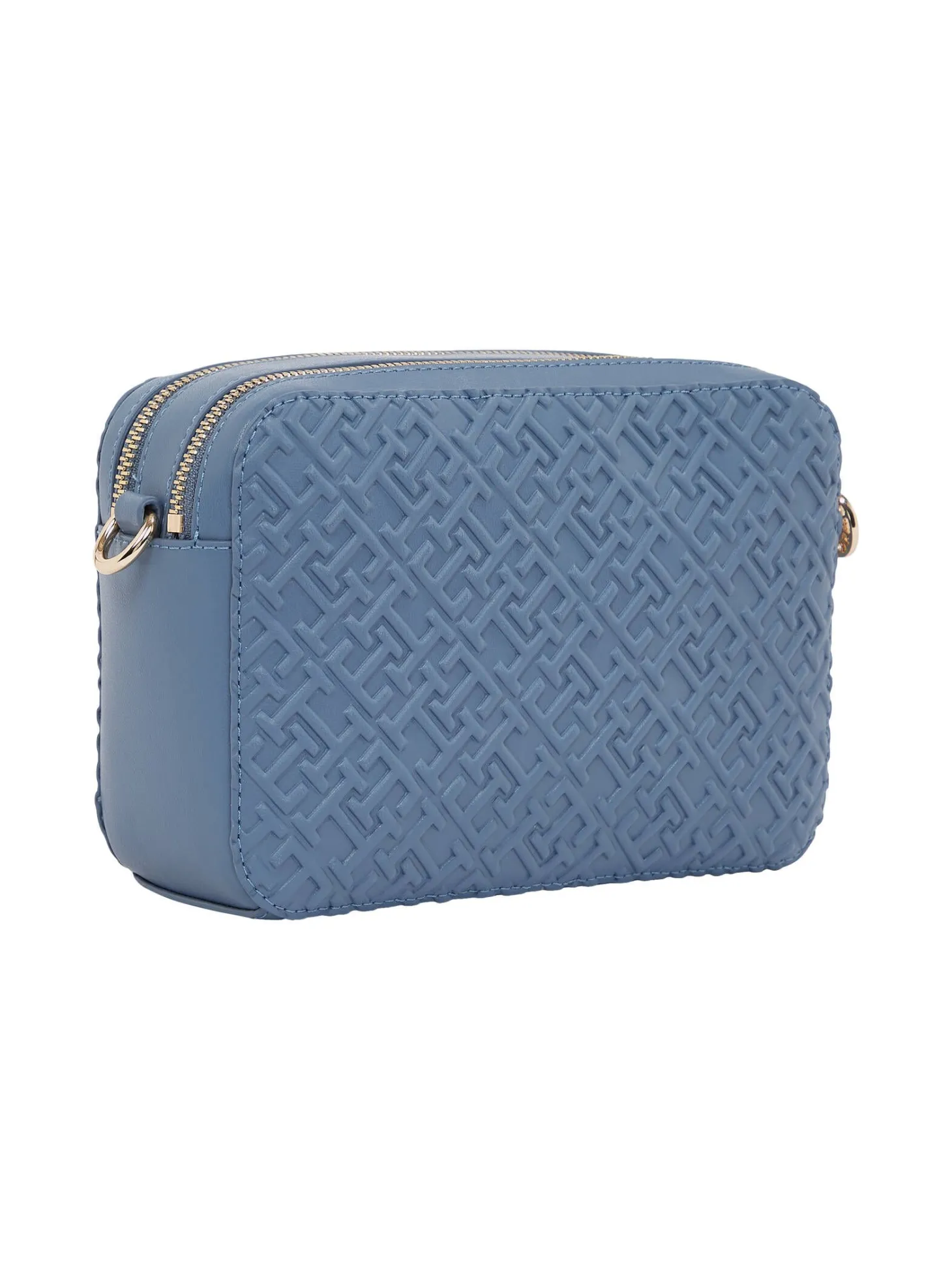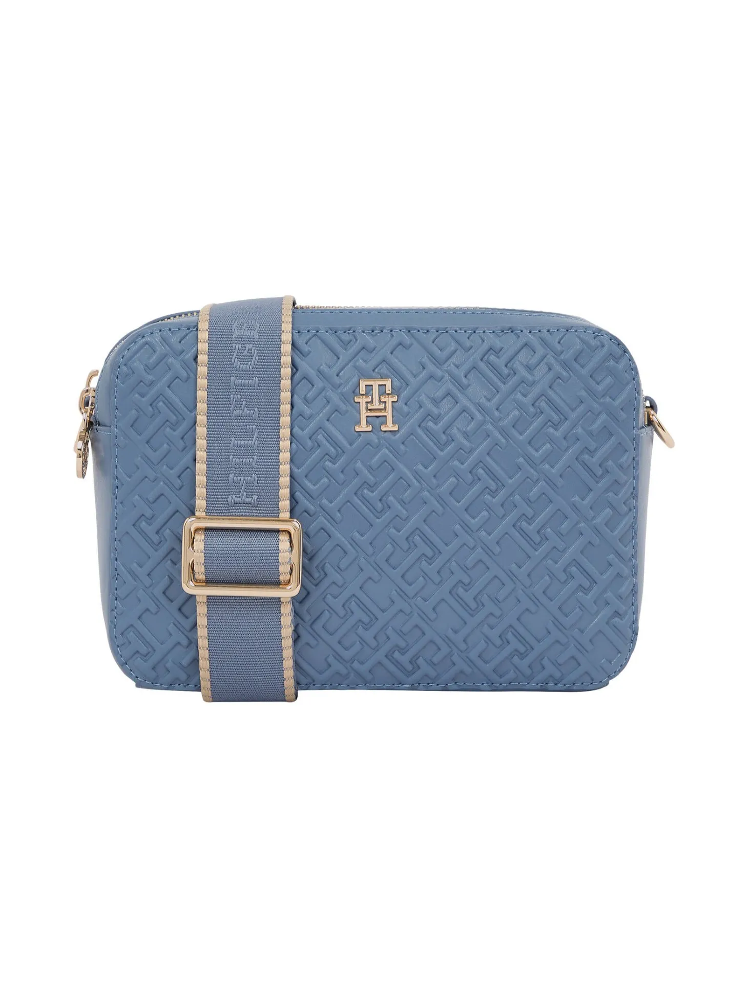 Diese elegante Kameratasche besticht durch ein strukturiertes Finish, geprägte TH-Monogramme und zwei praktische Hauptfächer mit Reißverschlüssen, ideal für den Alltag.