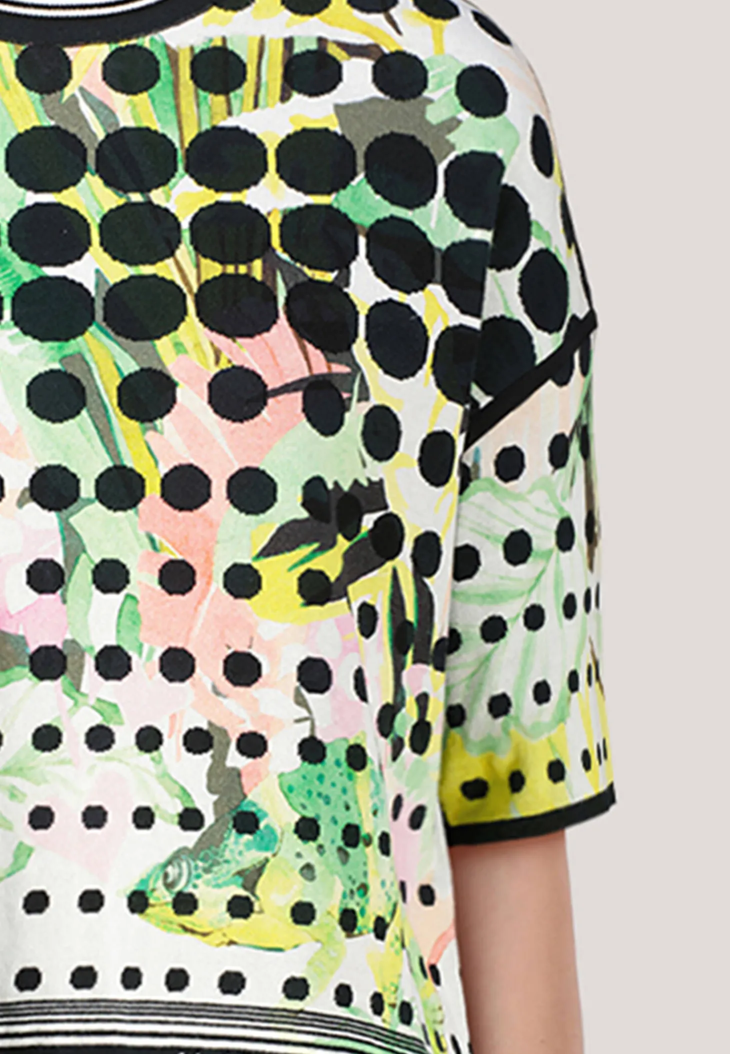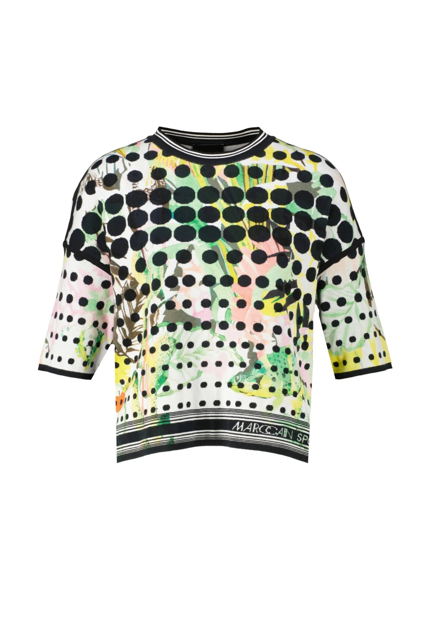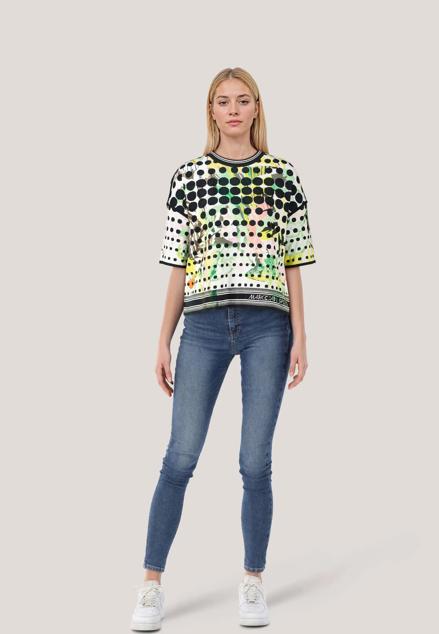 Oversized Feinstrick-Pullover zum Wenden mit überschnittenen Schultern. Cool, der Mustermix – die Front trägt ein farbenfrohes Dschungel-Motiv und der Rücken eine Computer-Graphik. Das Modell von Marc Cain Sports ist aus Bio-Baumwolle und Knitted in Germany. Es wird mit modernsten Technologien in Deutschland gestrickt und veredelt. Die einzelnen Teile – wie Rücken- und Vorderteil etc. – werden in europäischen Partnerbetrieben zusammengenäht.