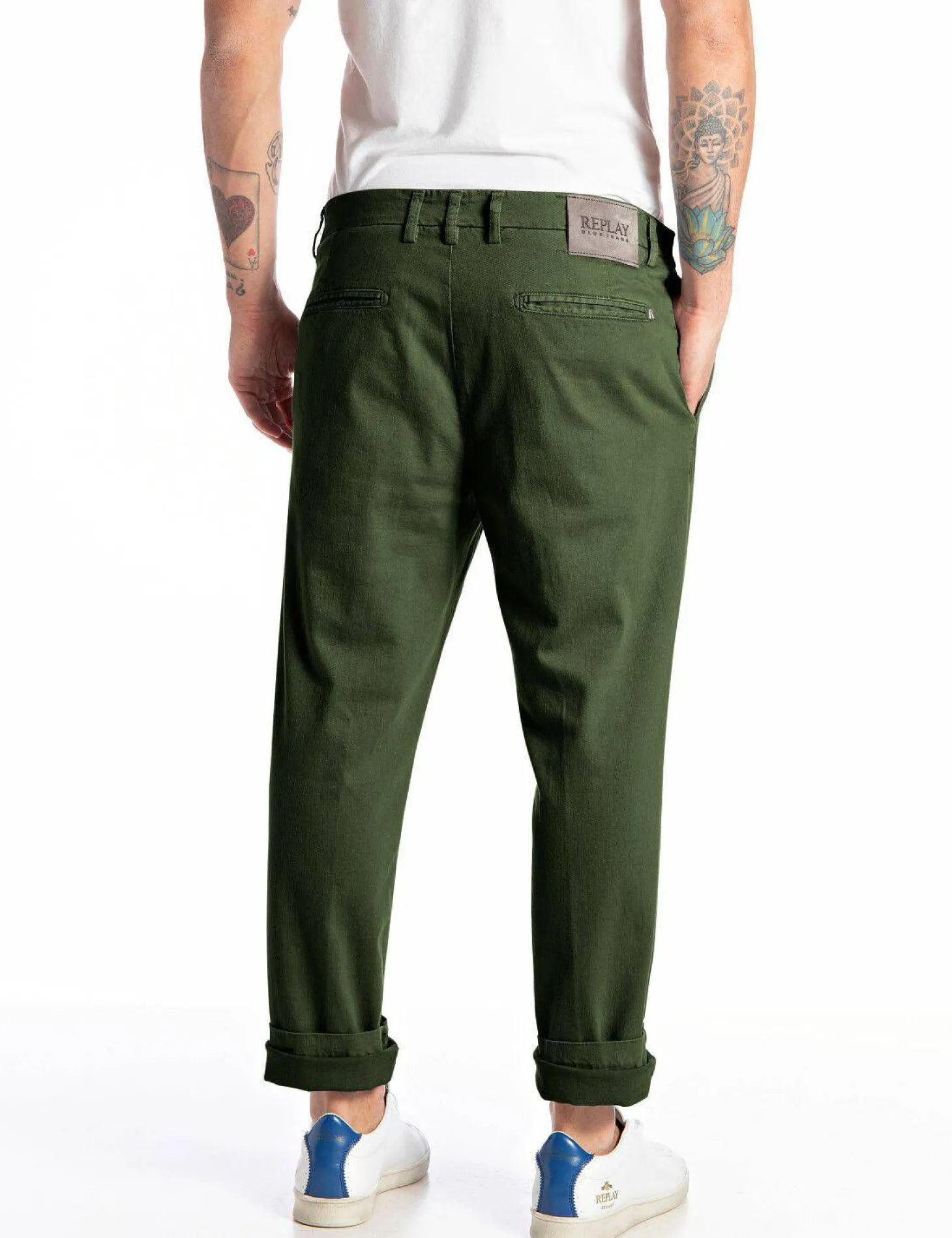 - Zwei Seitentaschen und zwei paspelierte Gesäßtaschen