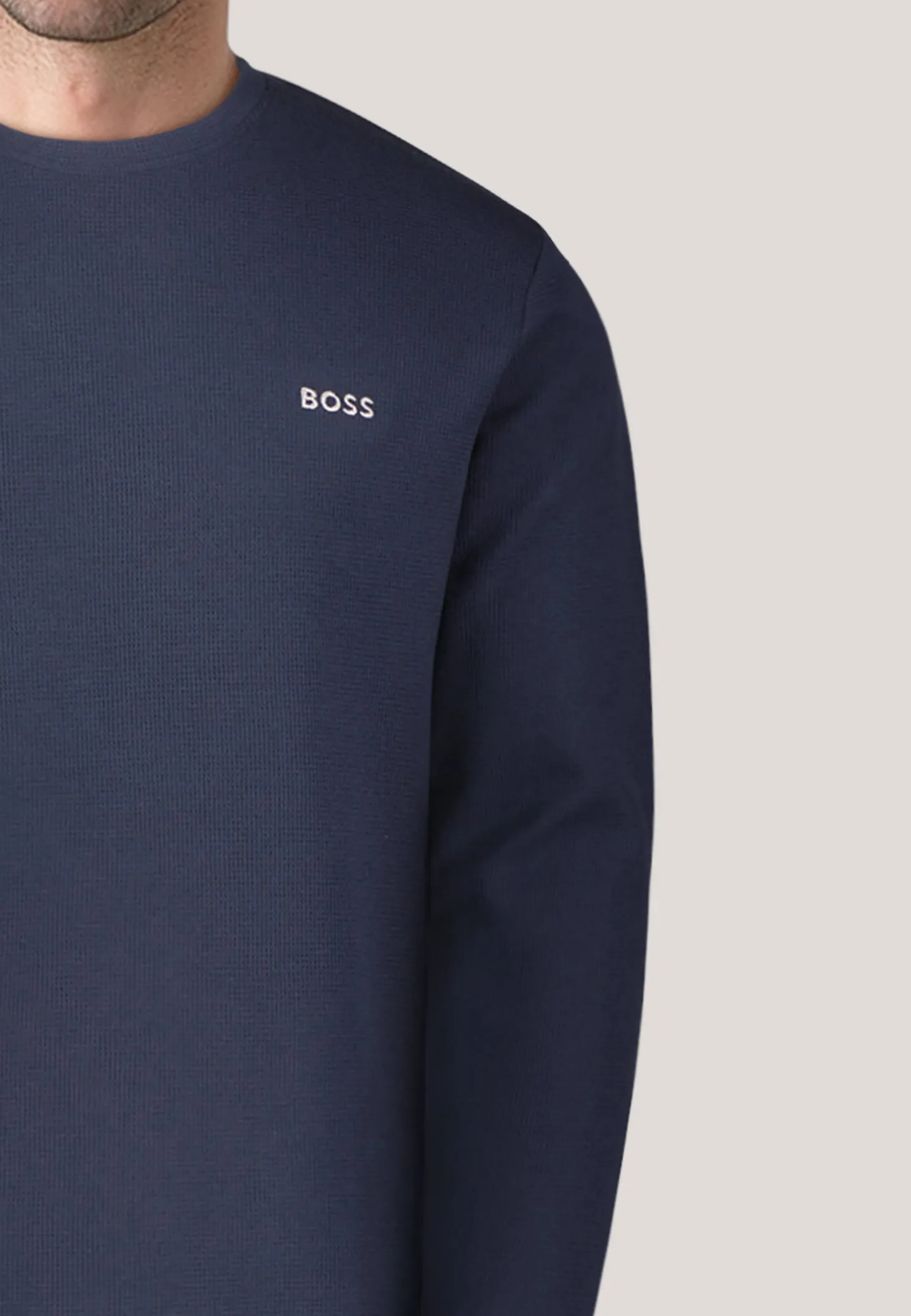 - Gestickter BOSS Schriftzug in Brusthöhe links