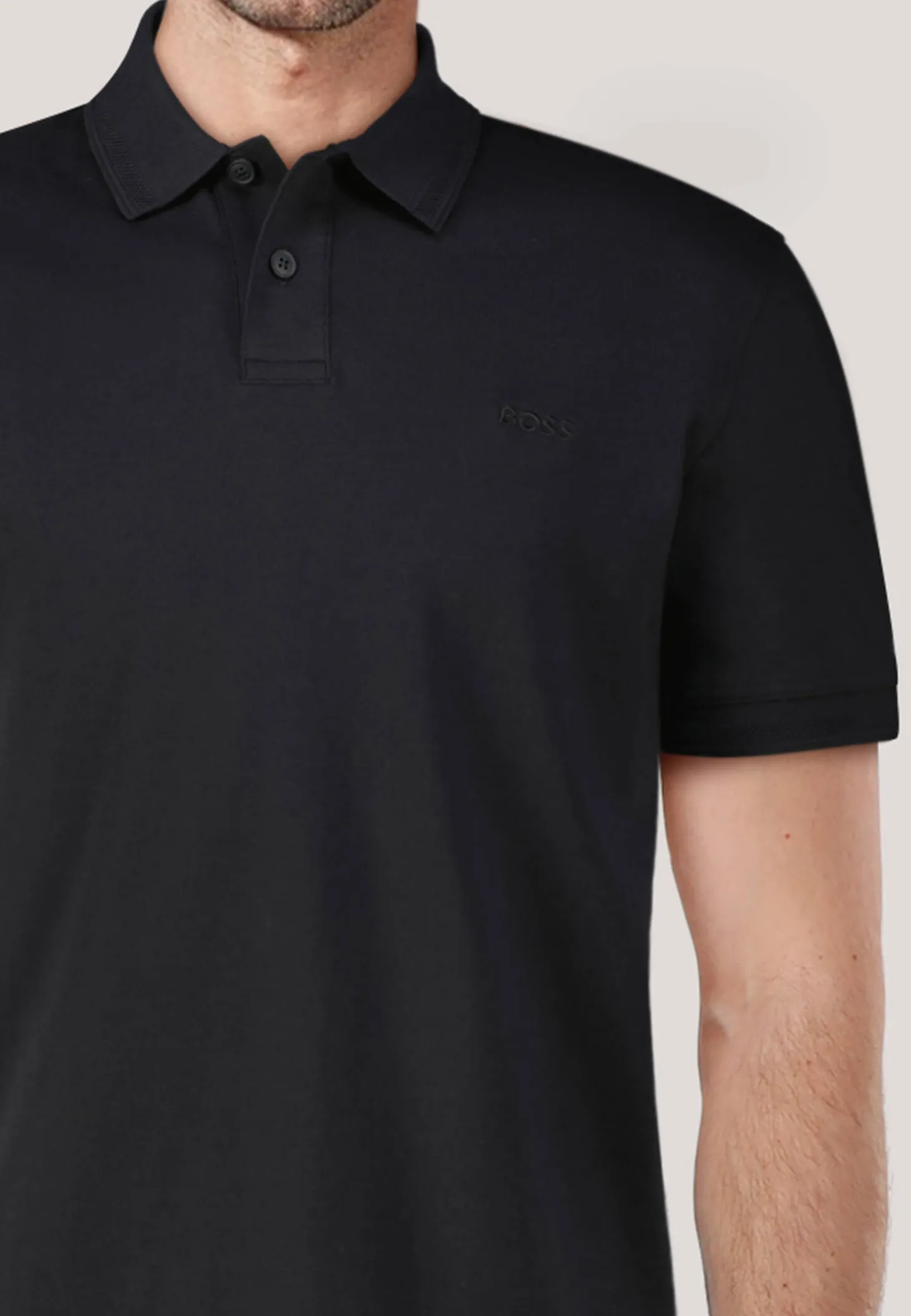 - Gestickter BOSS-Schriftzug in Brusthöhe links